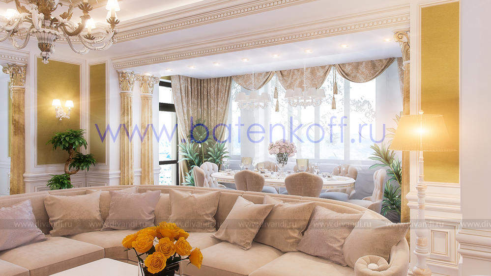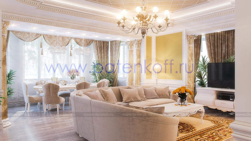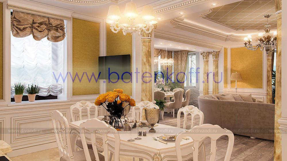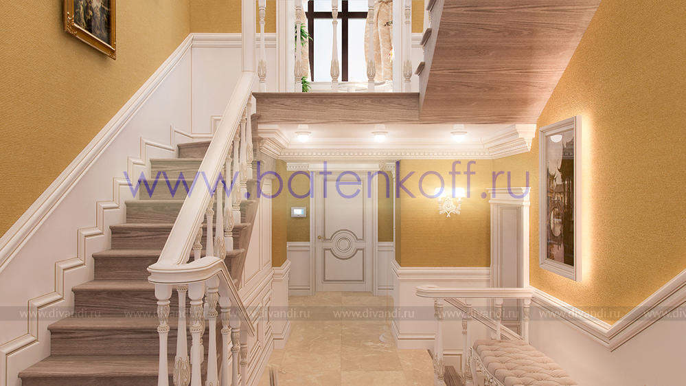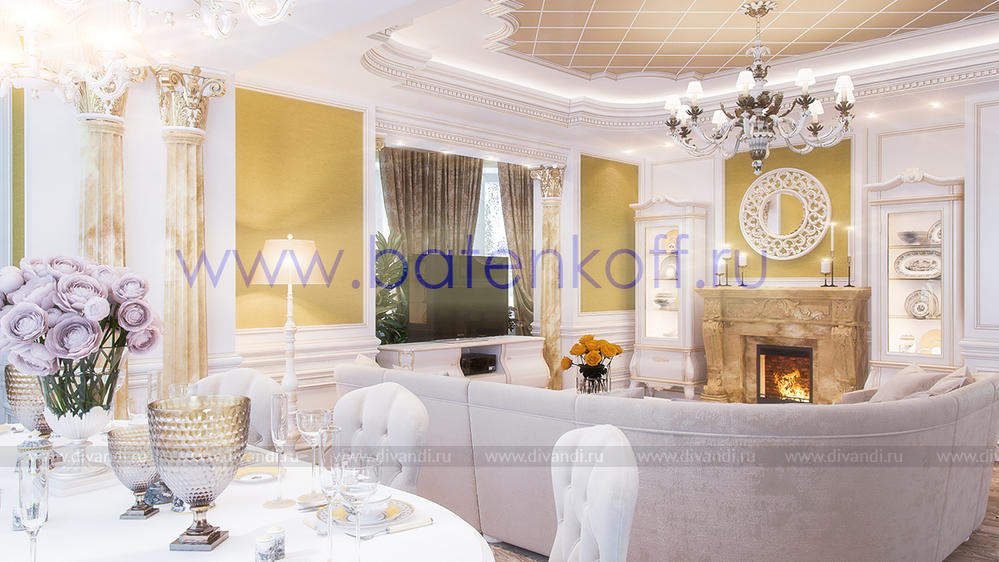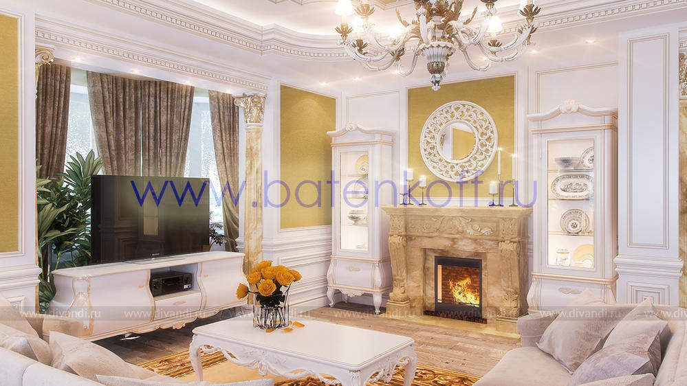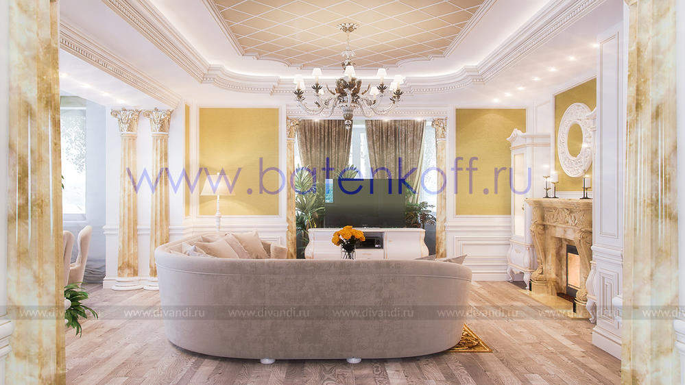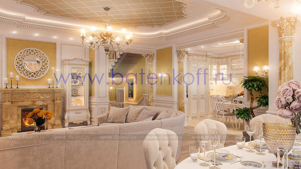 Дизайн интерьера коттеджа выполнен в классическом стиле. Он выполнен в светлых тонах с использованием патинированного дерева и декоративной штукатурки. Классический мраморный камин аккуратно вписан в общую стилистику и завязан с мраморными колоннами. Очень интересно смотрится расписной потолок.