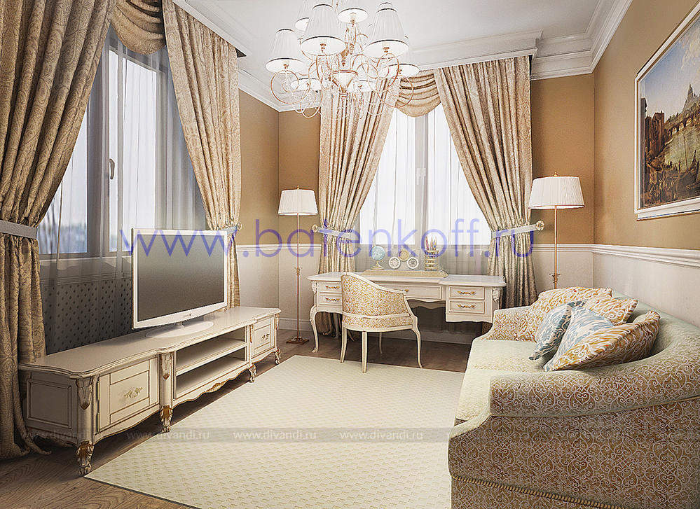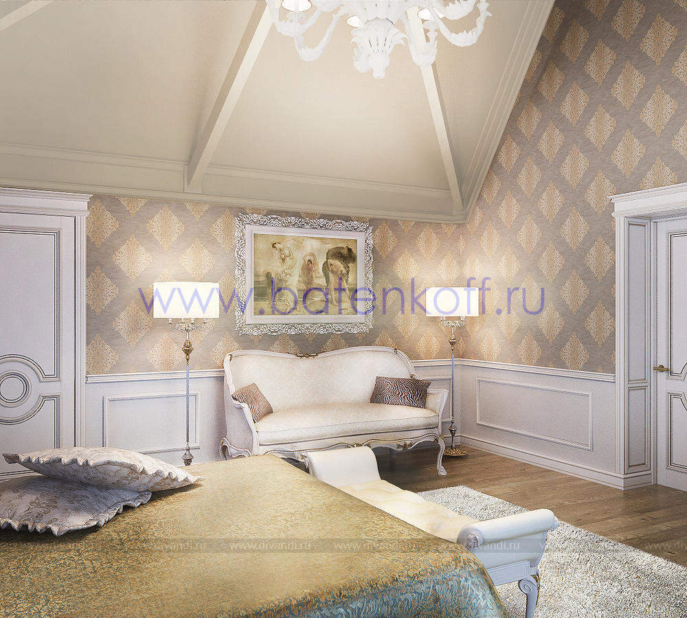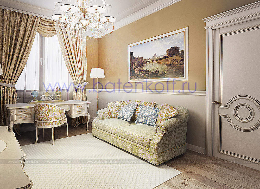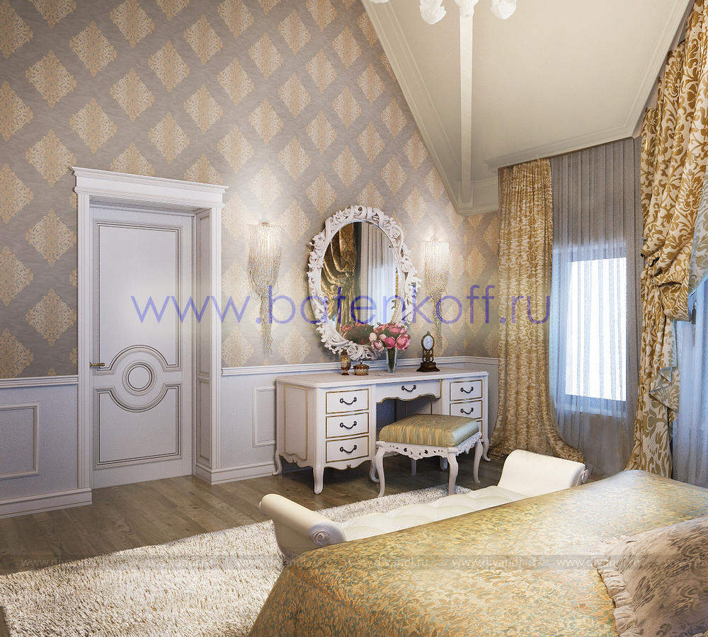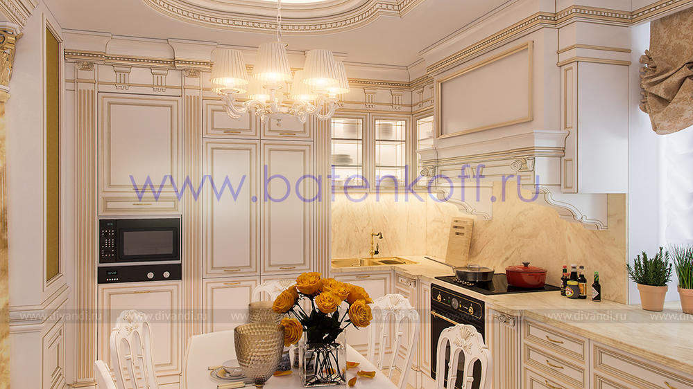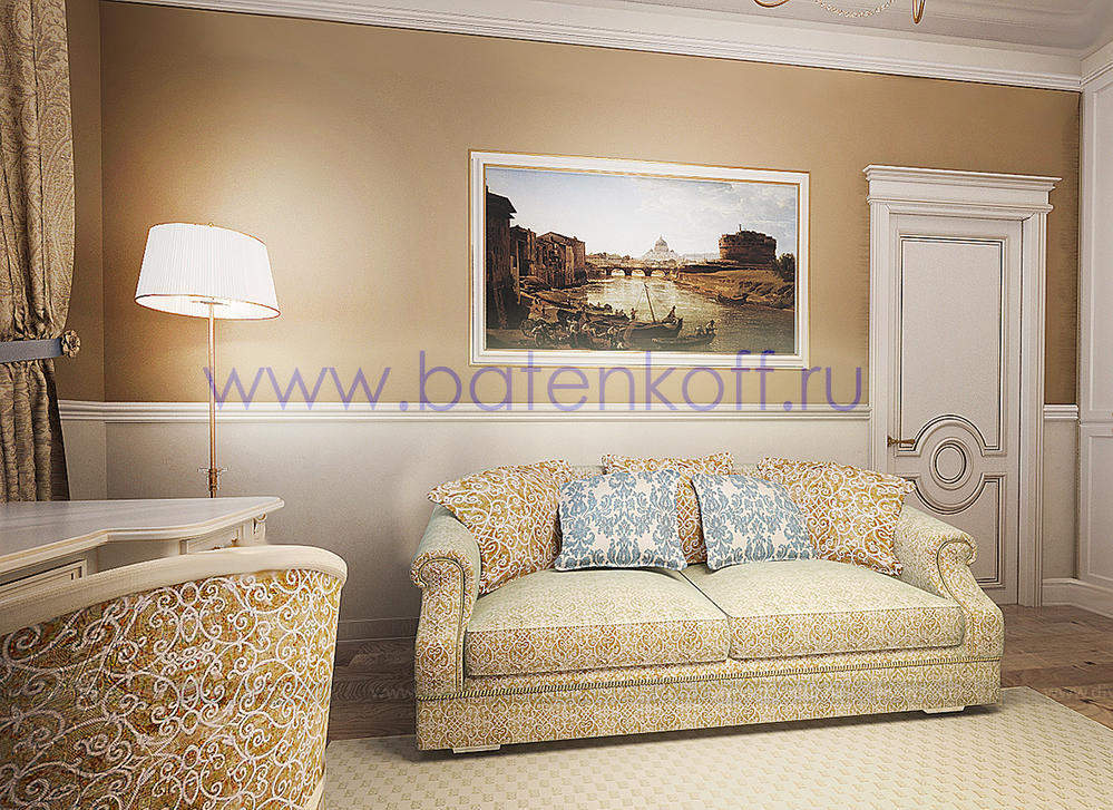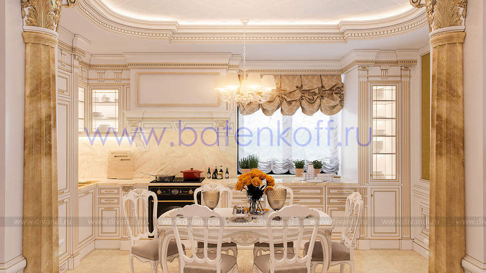 Дизайн интерьера коттеджа выполнен в классическом стиле. Он выполнен в светлых тонах с использованием патинированного дерева и декоративной штукатурки. Классический мраморный камин аккуратно вписан в общую стилистику и завязан с мраморными колоннами. Очень интересно смотрится расписной потолок.