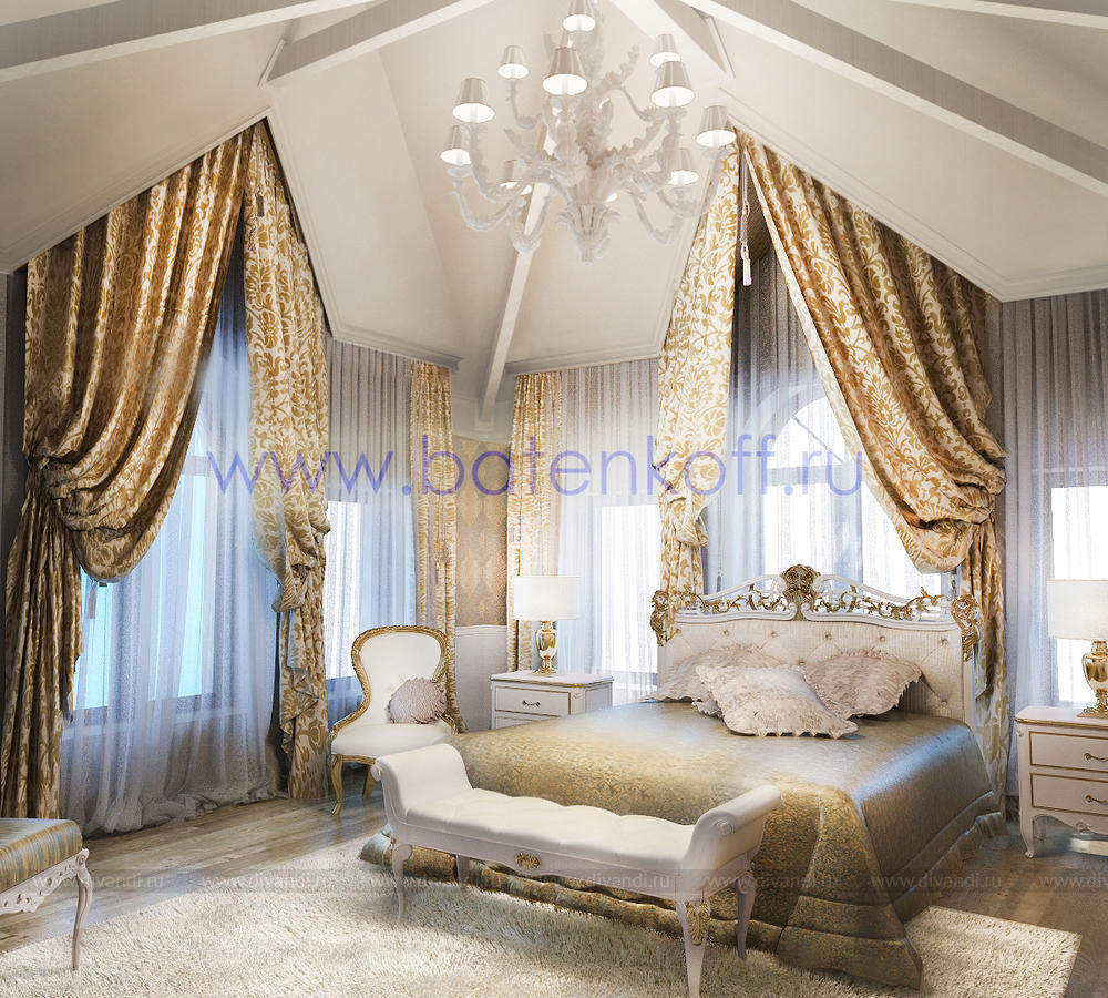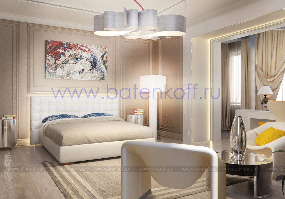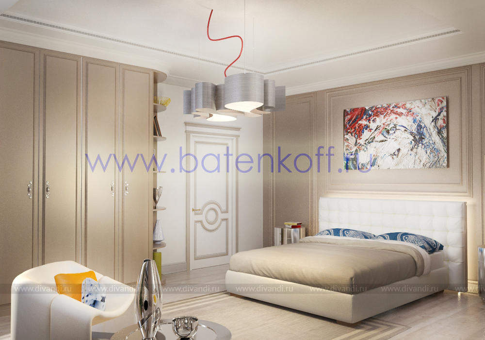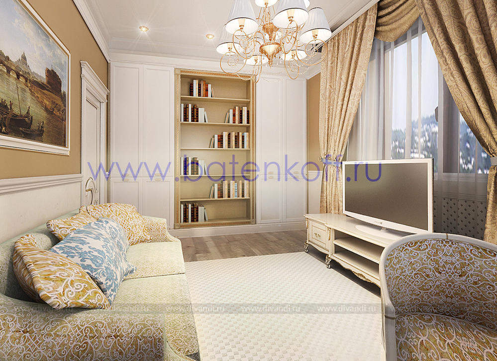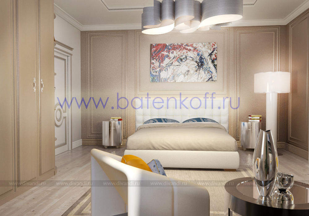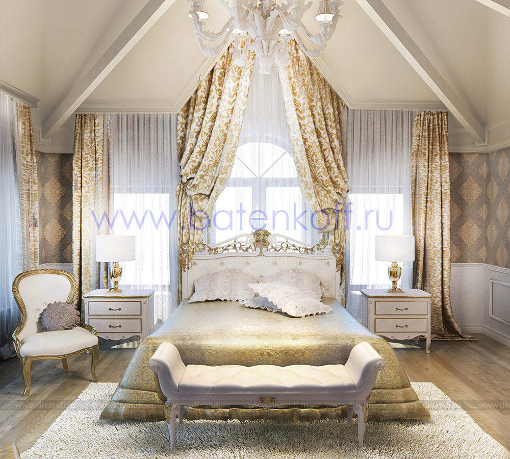 Дизайн интерьера коттеджа выполнен в классическом стиле. Он выполнен в светлых тонах с использованием патинированного дерева и декоративной штукатурки. Классический мраморный камин аккуратно вписан в общую стилистику и завязан с мраморными колоннами. Очень интересно смотрится расписной потолок.