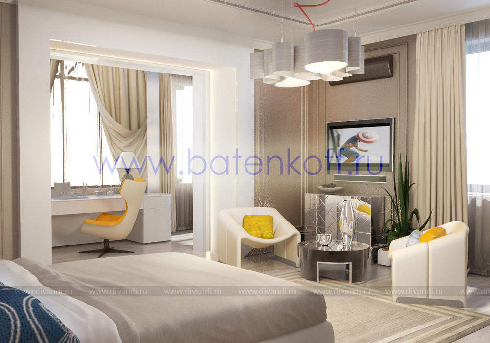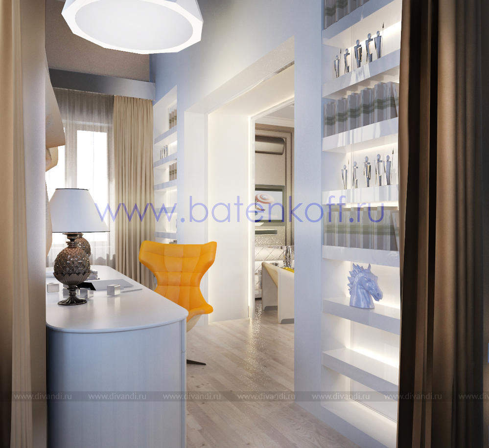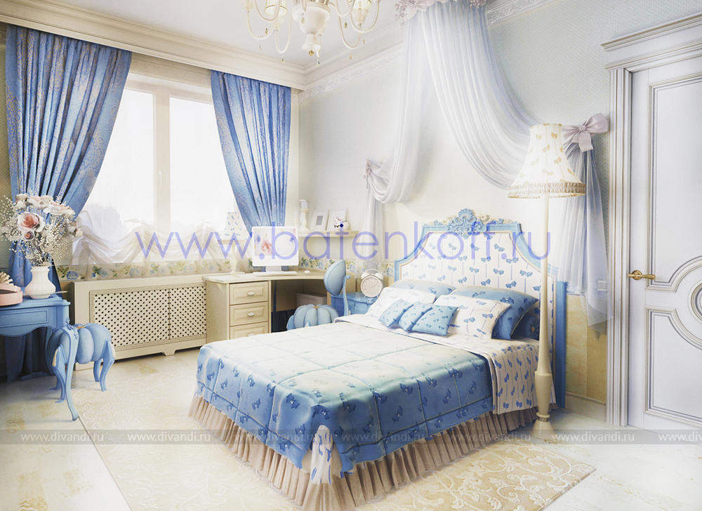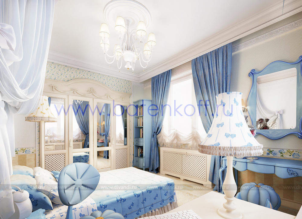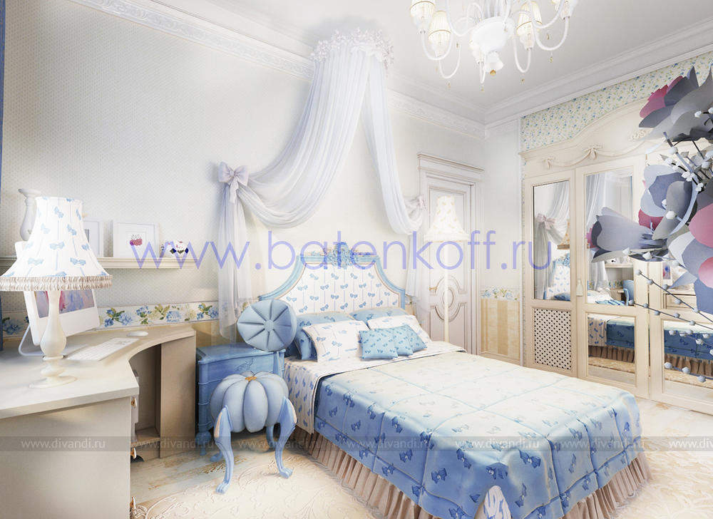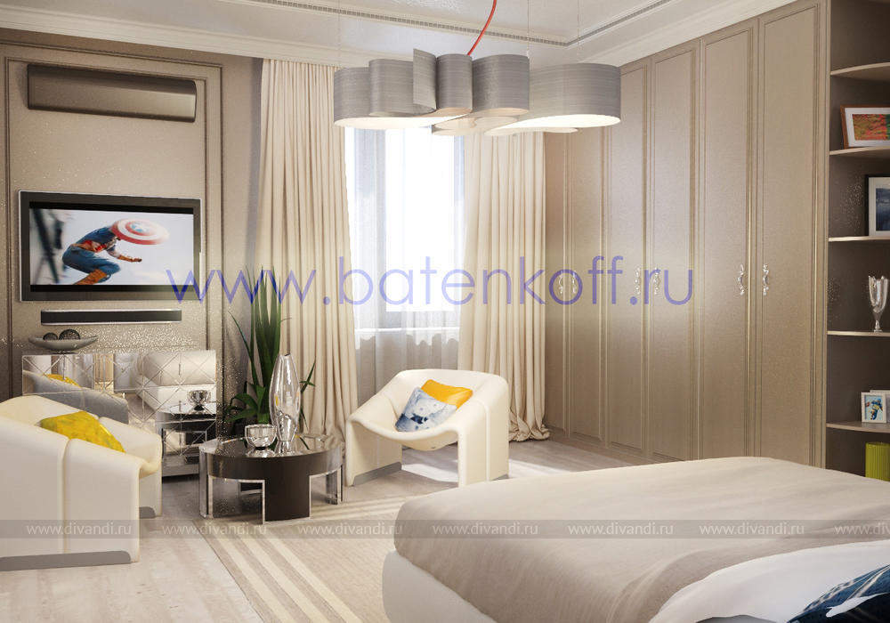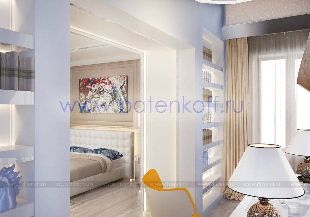 Дизайн интерьера коттеджа выполнен в классическом стиле. Он выполнен в светлых тонах с использованием патинированного дерева и декоративной штукатурки. Классический мраморный камин аккуратно вписан в общую стилистику и завязан с мраморными колоннами. Очень интересно смотрится расписной потолок.