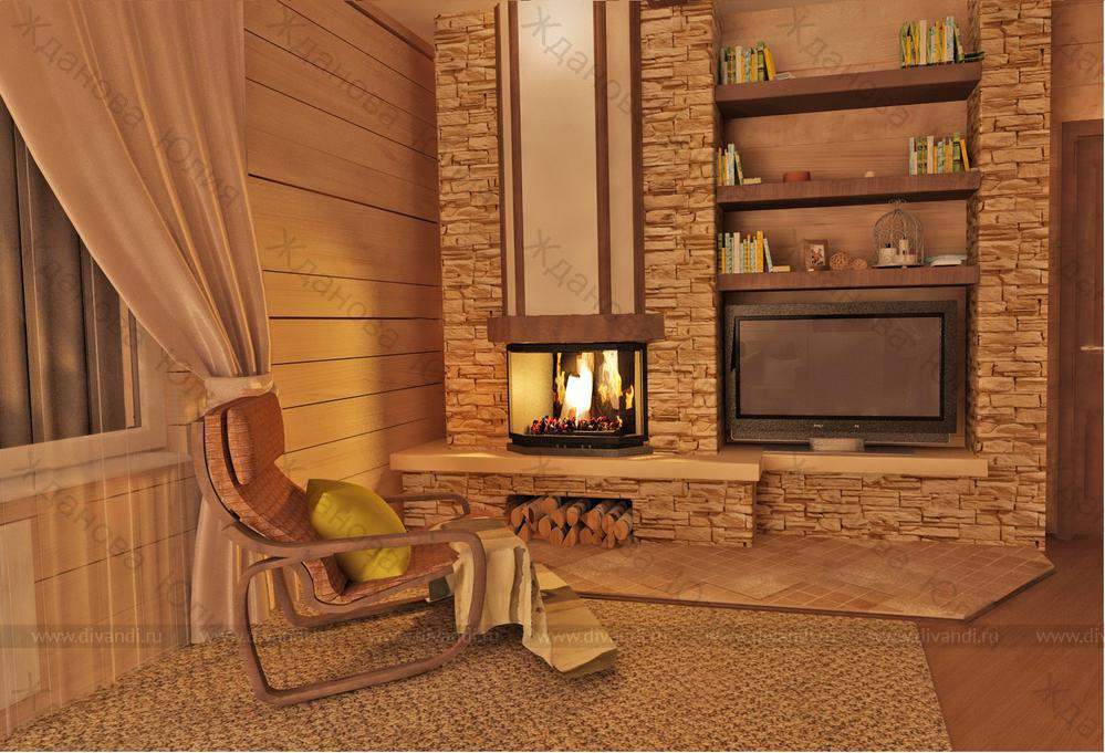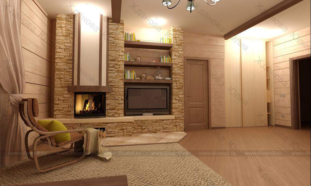Главные пожелания заказчика: камин должен быть центром композицией интерьера и желательно наличие как можно больше природных материалов.