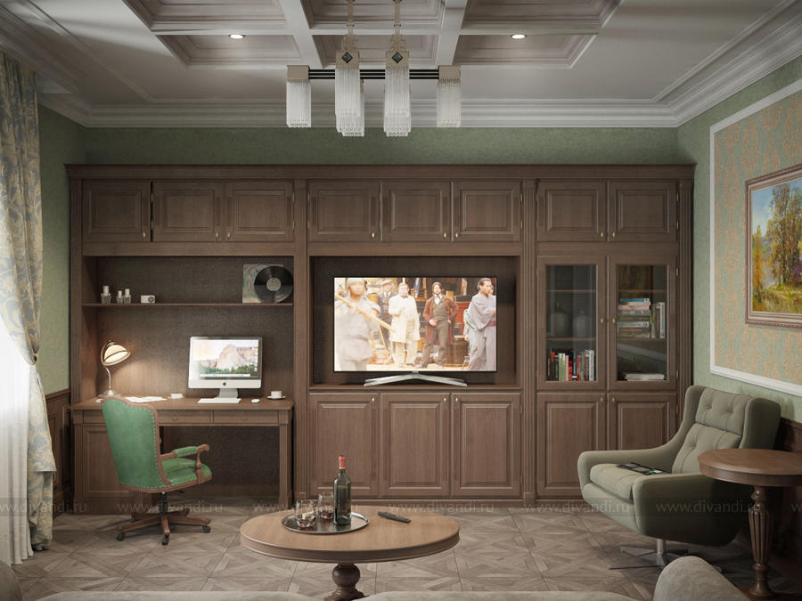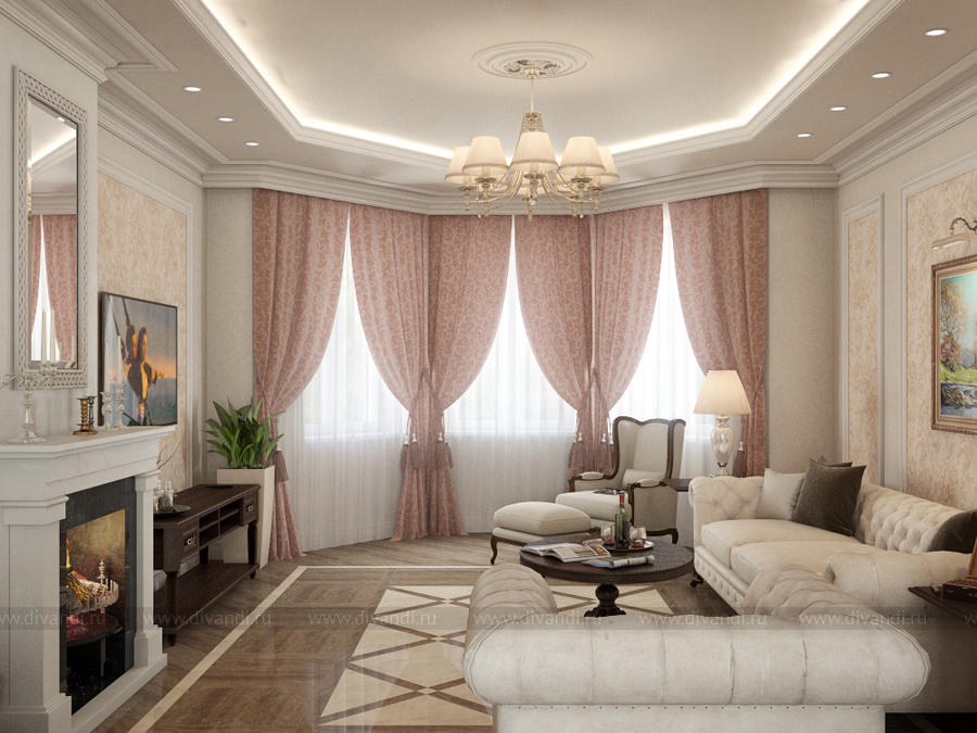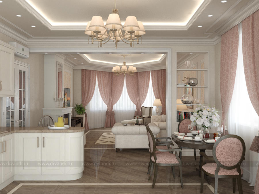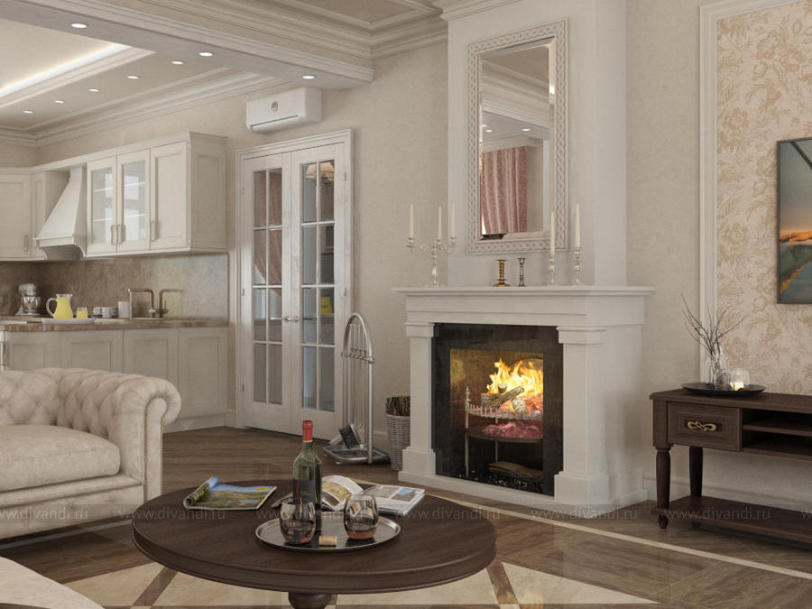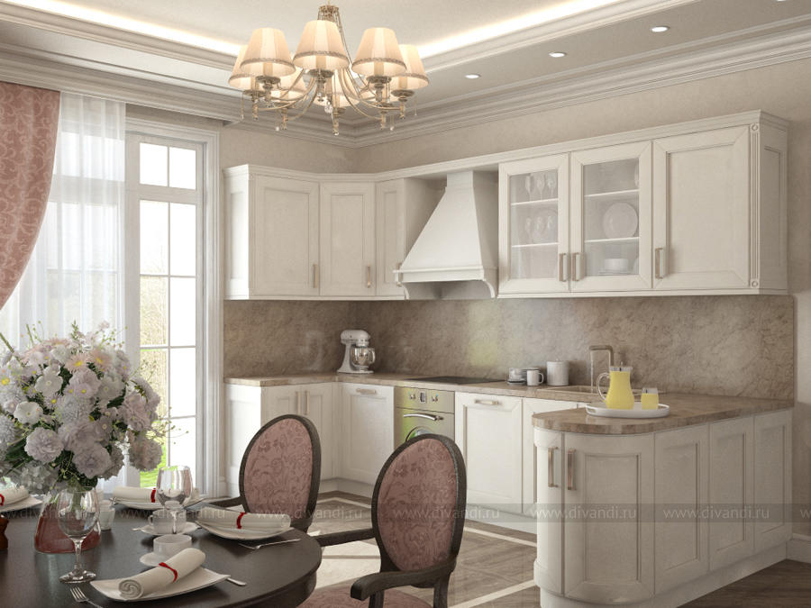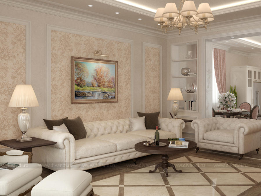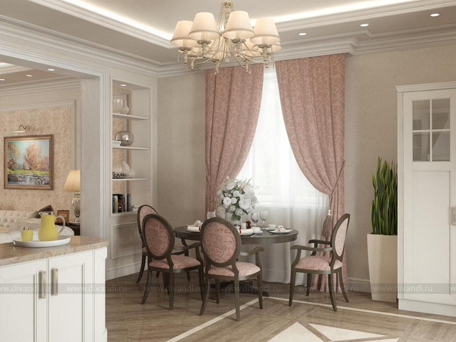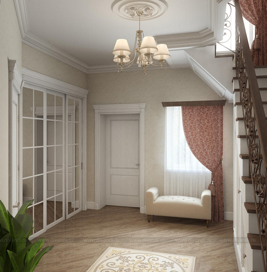 Интерьер коттеджа в классическом стиле получился очень уютным и респектабельным. Цветовой составляющей интерьера выбраны светлые постельные тона и приглушенные оттенки. Торжественности добавляет многоуровневое освещение – многорожковые пышные люстры в резных потолочных розетках, настольные лампы и бра, богатый декор, натуральные материалы мебели и отделки. Симметрия и гармоничное сочетание деталей делают интерьер целостным и законченным.