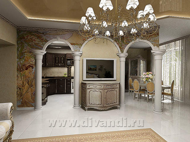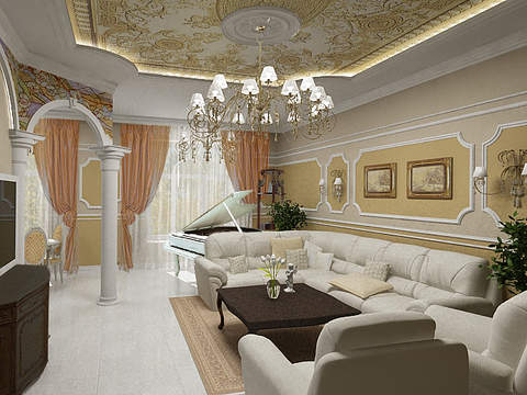 Главный акцент в интерьере, безусловно, принадлежит витражам, именно они придают интерьеру живость, яркость и свежесть. Потолочные витражи делают пространство легким и невесомым. Арки в гостиной, обрамленные витражами, - пример необычного обыгрывания классических приемов. Важное место в интерьере отведено роялю - неотъемленному атрибуту классического интерьера.