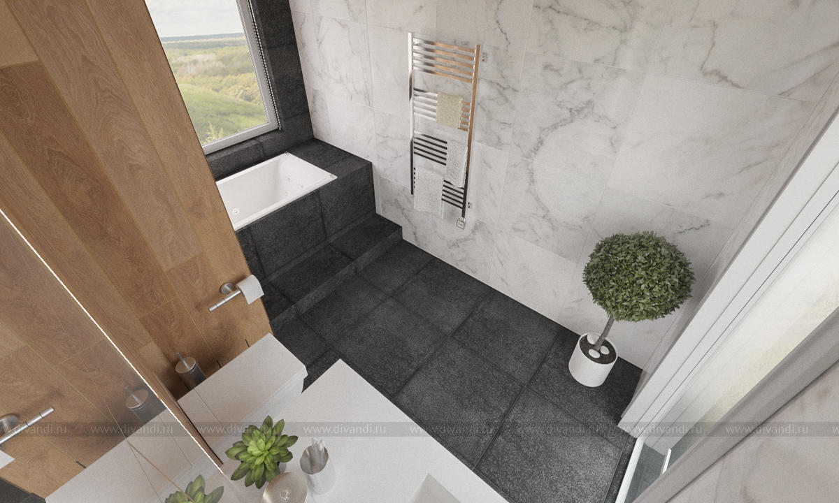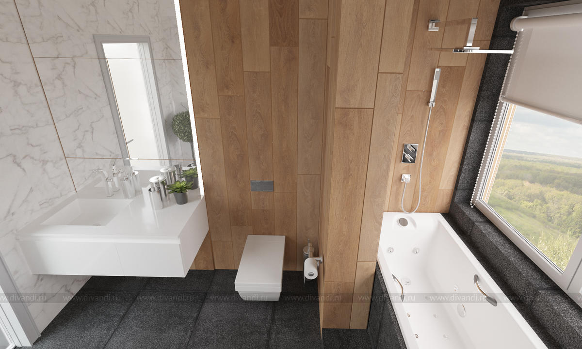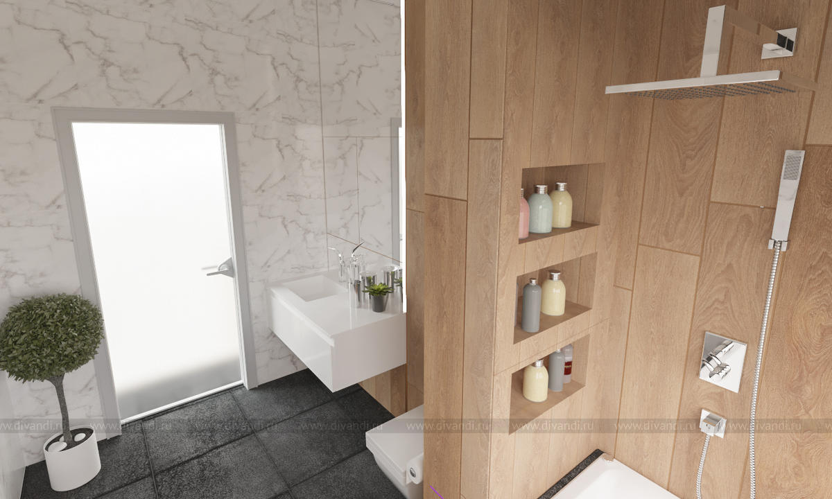 Здесь использовано много встроенной мебели - это стильно, удобно и экономит пространство: присутствуют встроенный шкафчик-зеркало, встроенная инсталляция для унитаза, встраиваемая душевая система, встраиваемый светильник и даже ванная "встроена" в короб.