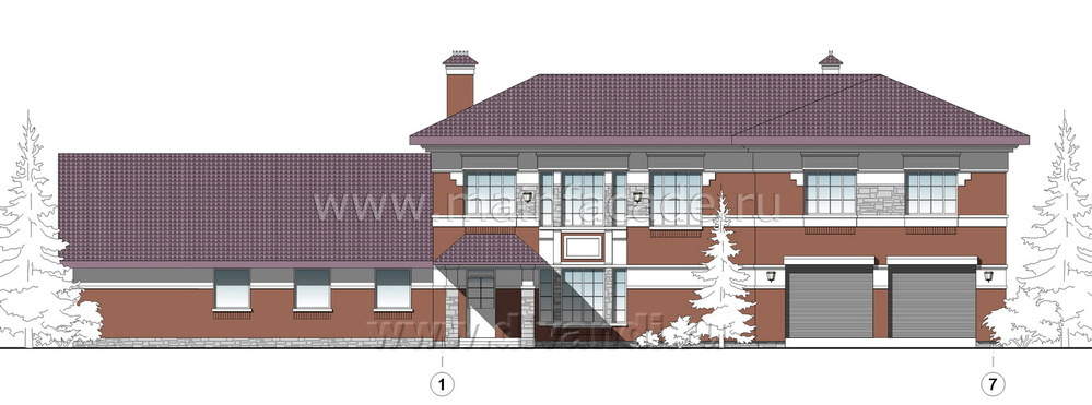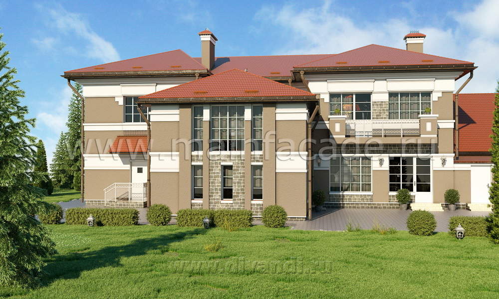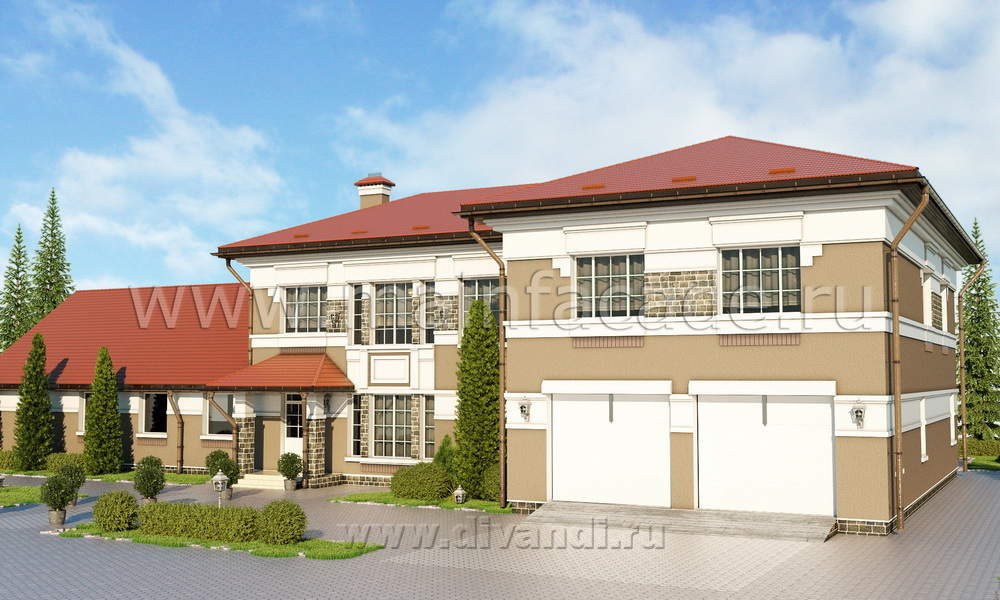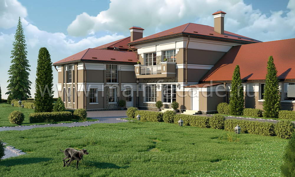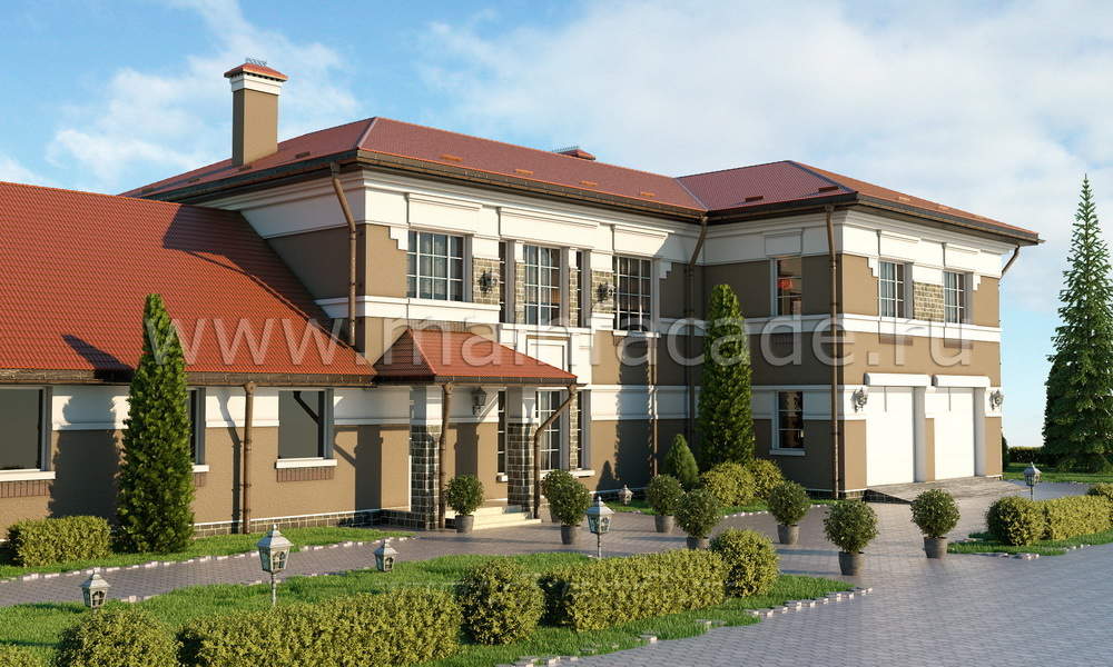 Коттедж выполнен в стиле «Арт-деко». Осью главного фасада являются большие окна «в пол», которые отлично держат композицию и, кроме того, прекрасно освещают холлы первого и второго этажей. Развитый, но в то же время не перегружающий фасад декор, создает некую живую рельефность плоскости стен.