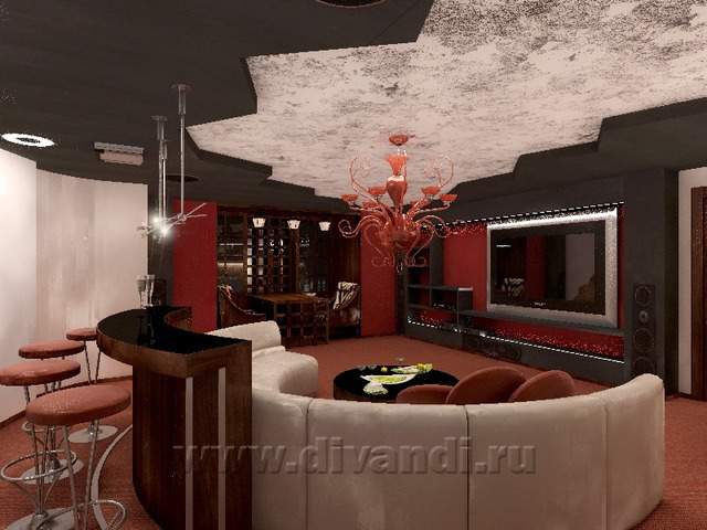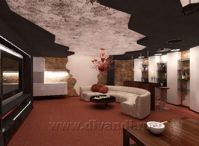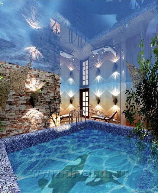 В подвальном помещении расположилась спа-зона с бассейном, кинозал с барной стойкой в стиле «Loft».