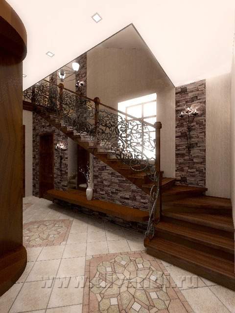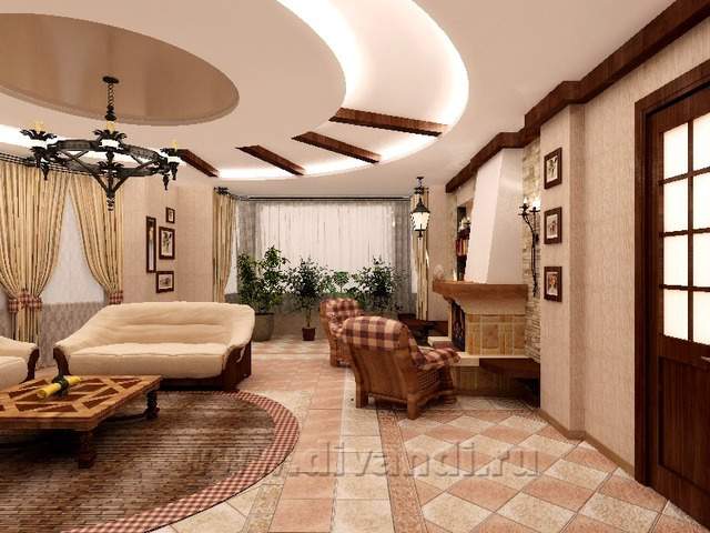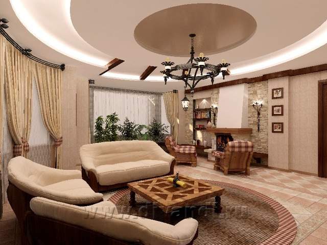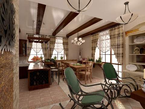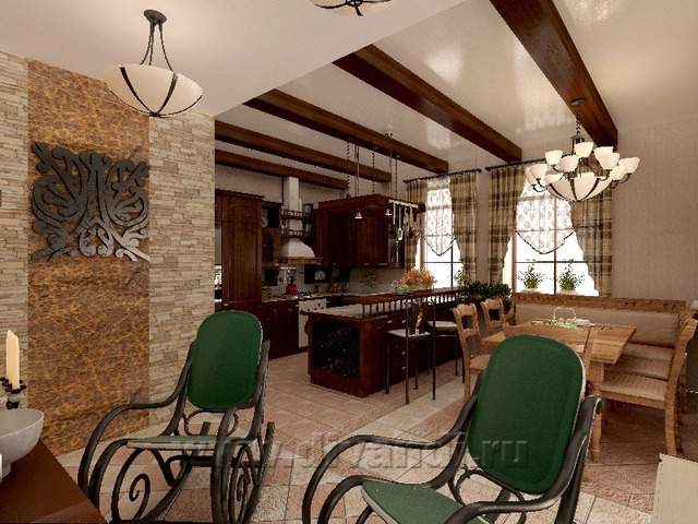 На первом этаже дома расположены гостиная с каминной зоной и кухня.
