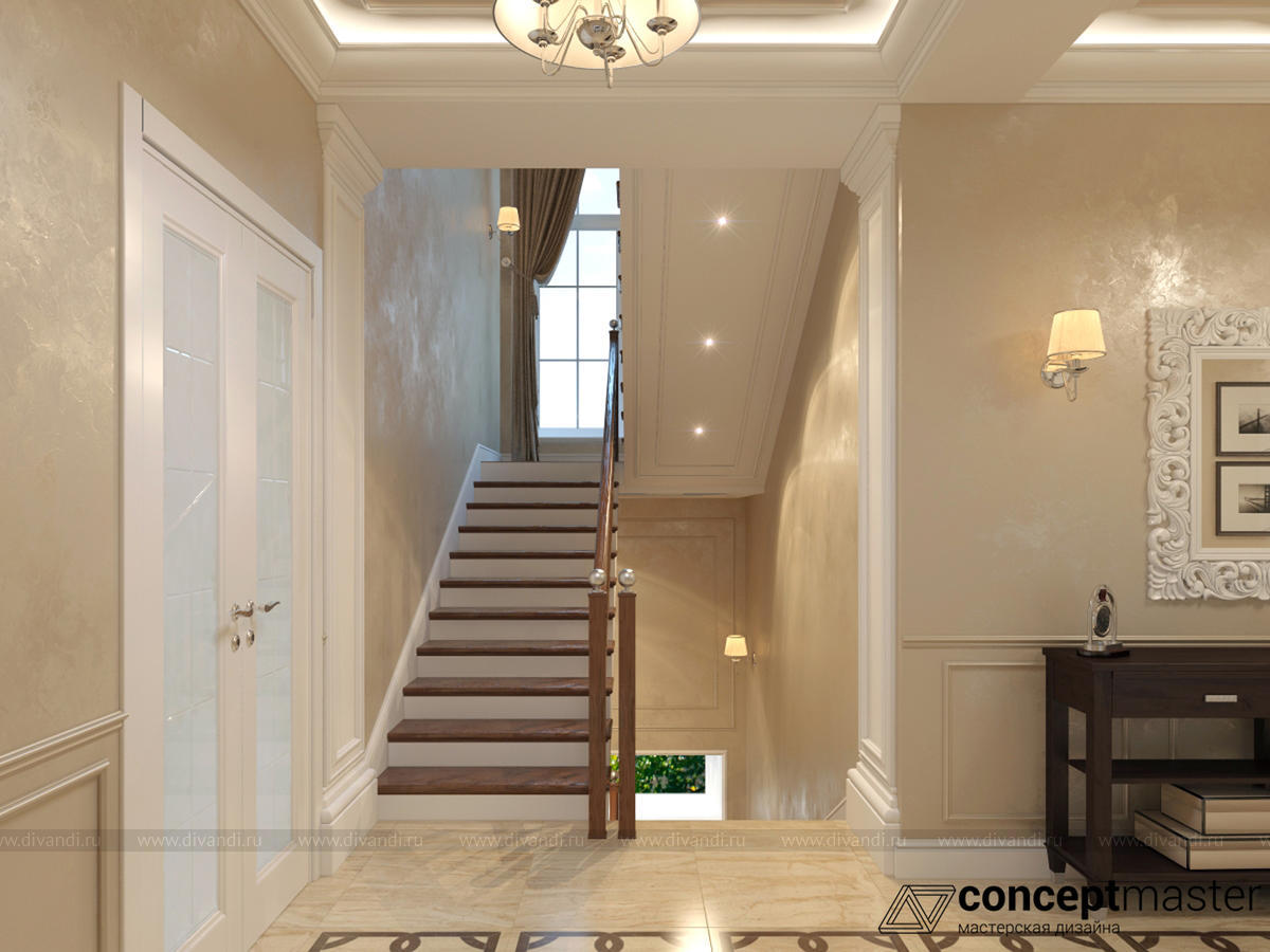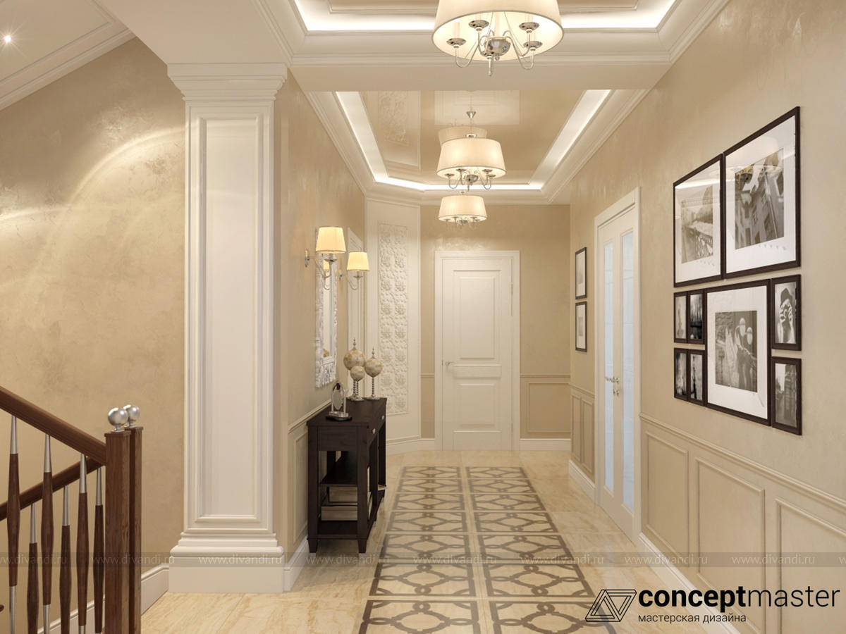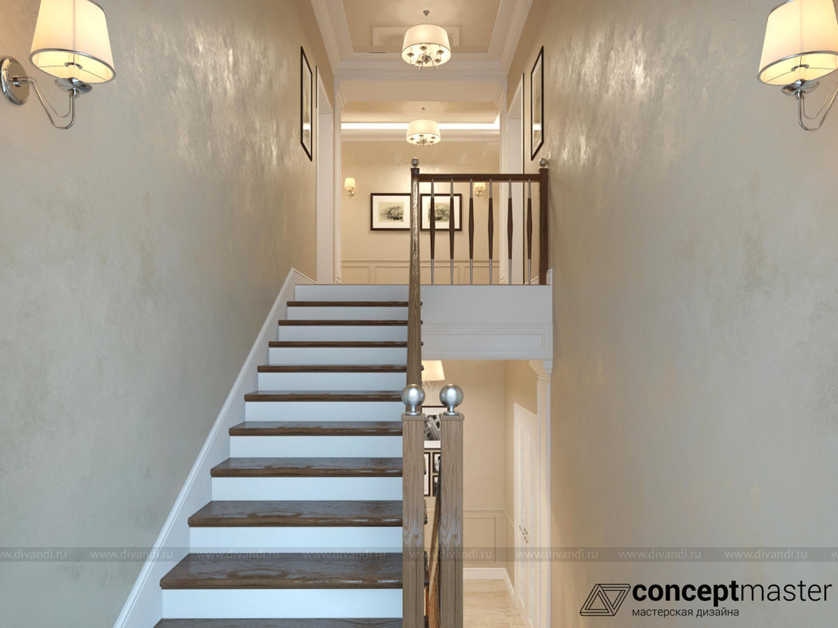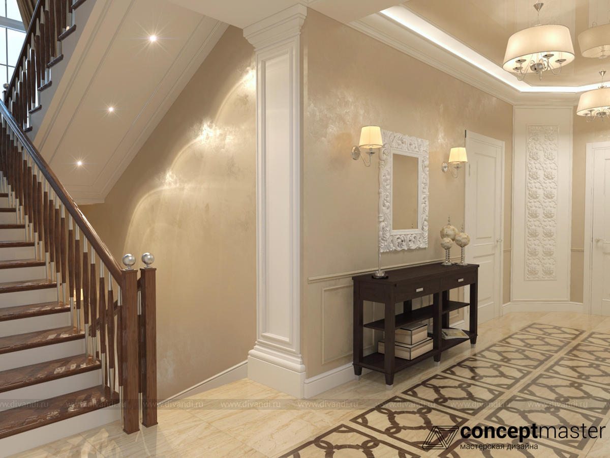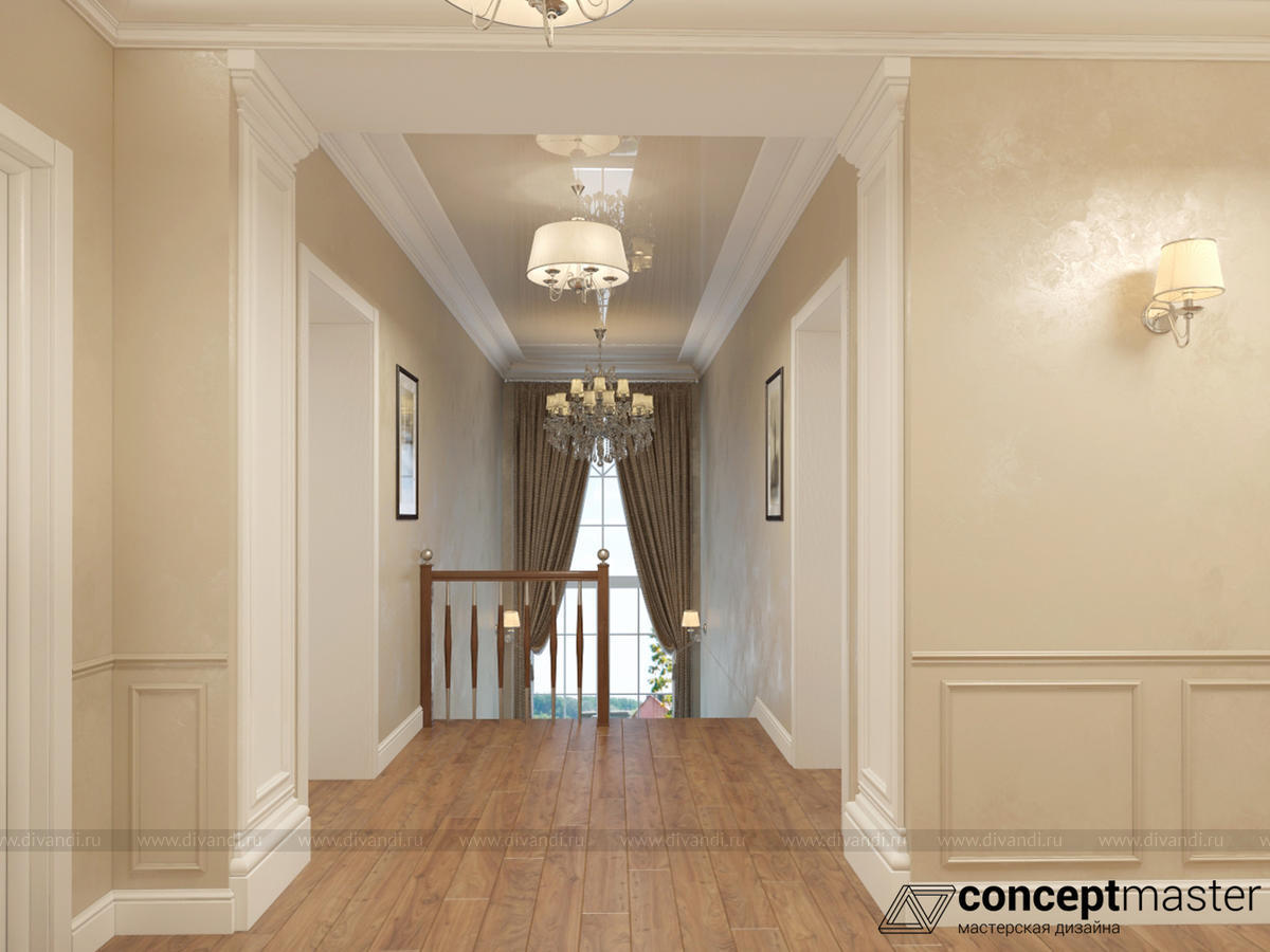 Интерьеры в этом коттедже выполнены в стиле неоклассики, что сопровождается высокими потолками, комнатами внушительных размеров и широкой лестницей. Наши дизайнеры при создании этого дома стремились подчеркнуть достоинства классической, античной архитектуры - чистые линии, симметрия, простые формы, сдержанная геометрия, благородный, но не чрезмерный декор.