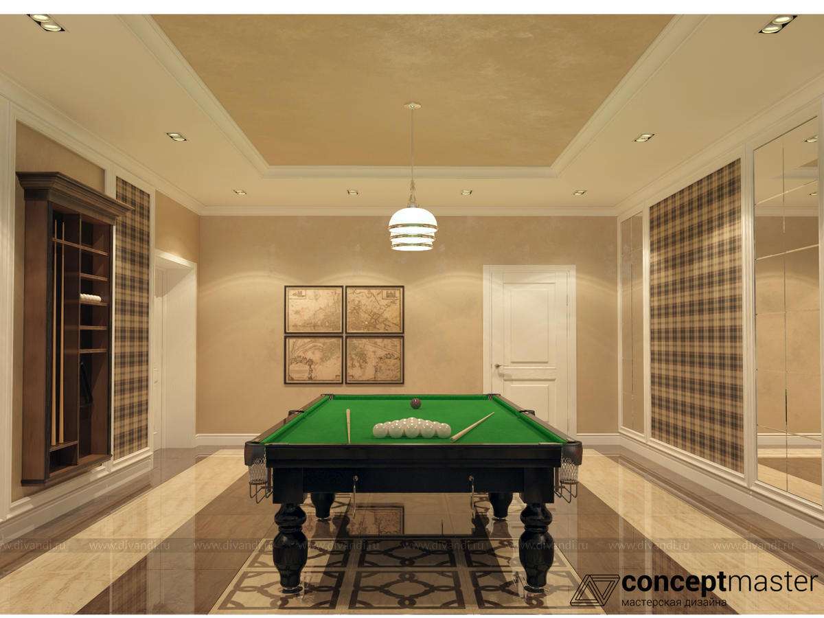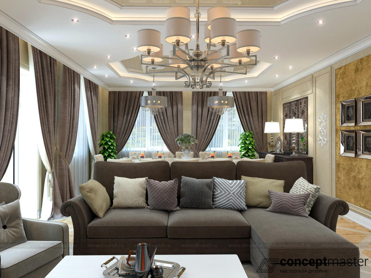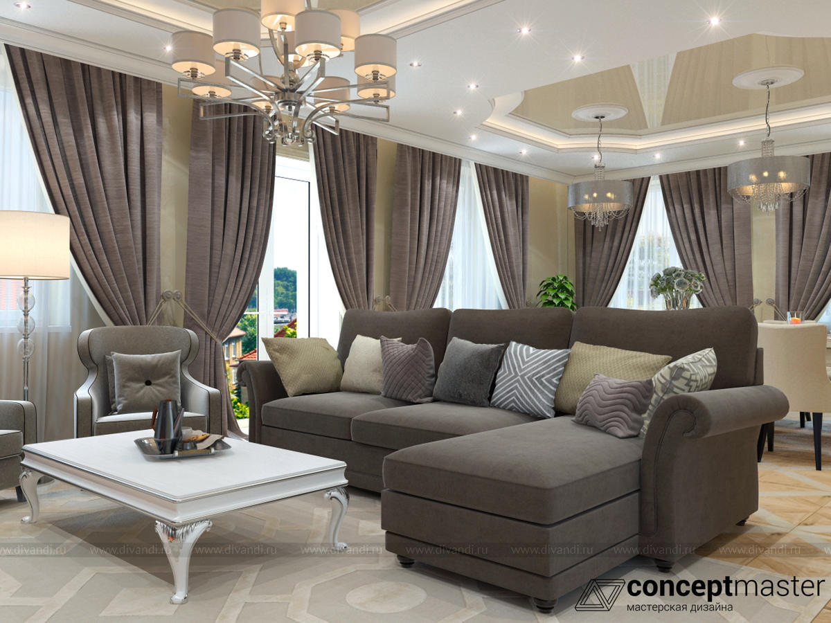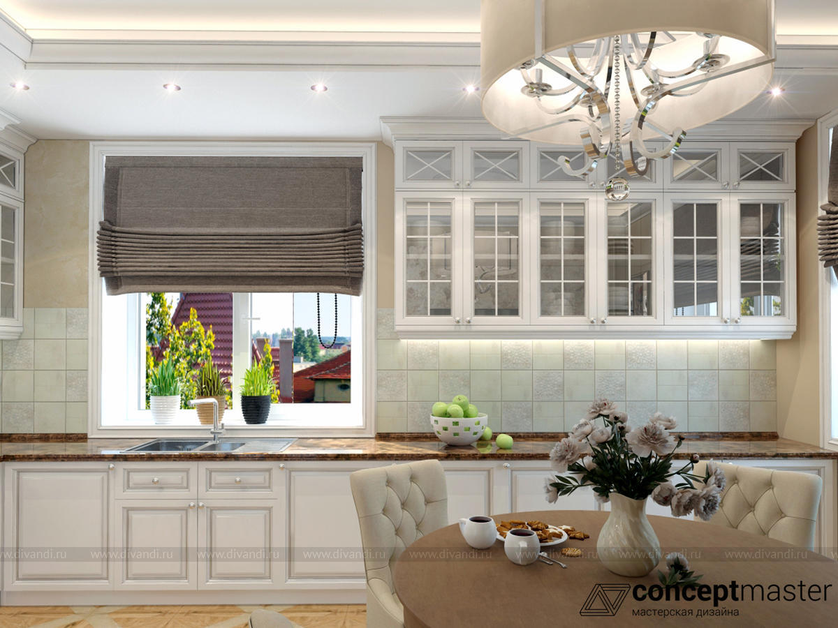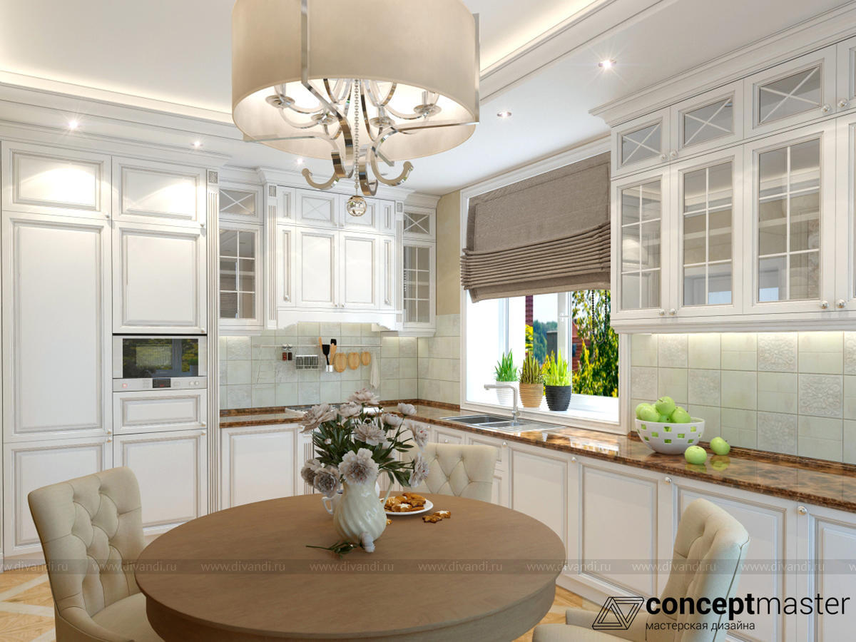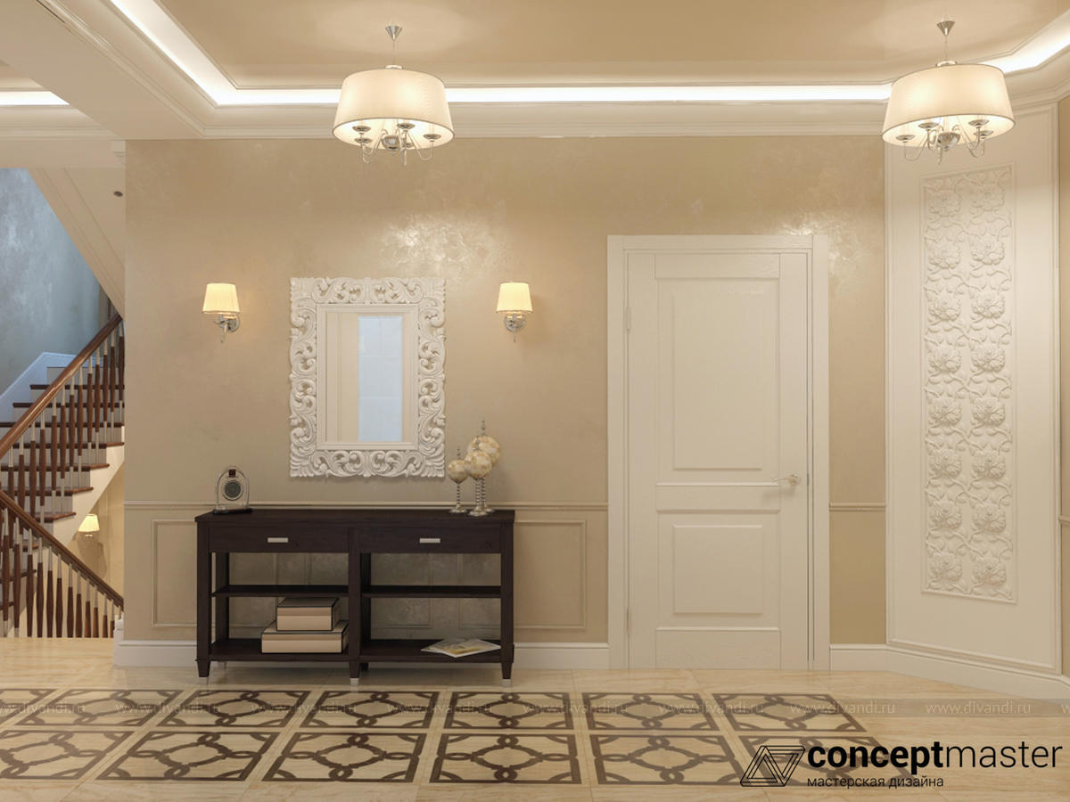 Интерьеры в этом коттедже выполнены в стиле неоклассики, что сопровождается высокими потолками, комнатами внушительных размеров и широкой лестницей. Наши дизайнеры при создании этого дома стремились подчеркнуть достоинства классической, античной архитектуры - чистые линии, симметрия, простые формы, сдержанная геометрия, благородный, но не чрезмерный декор.