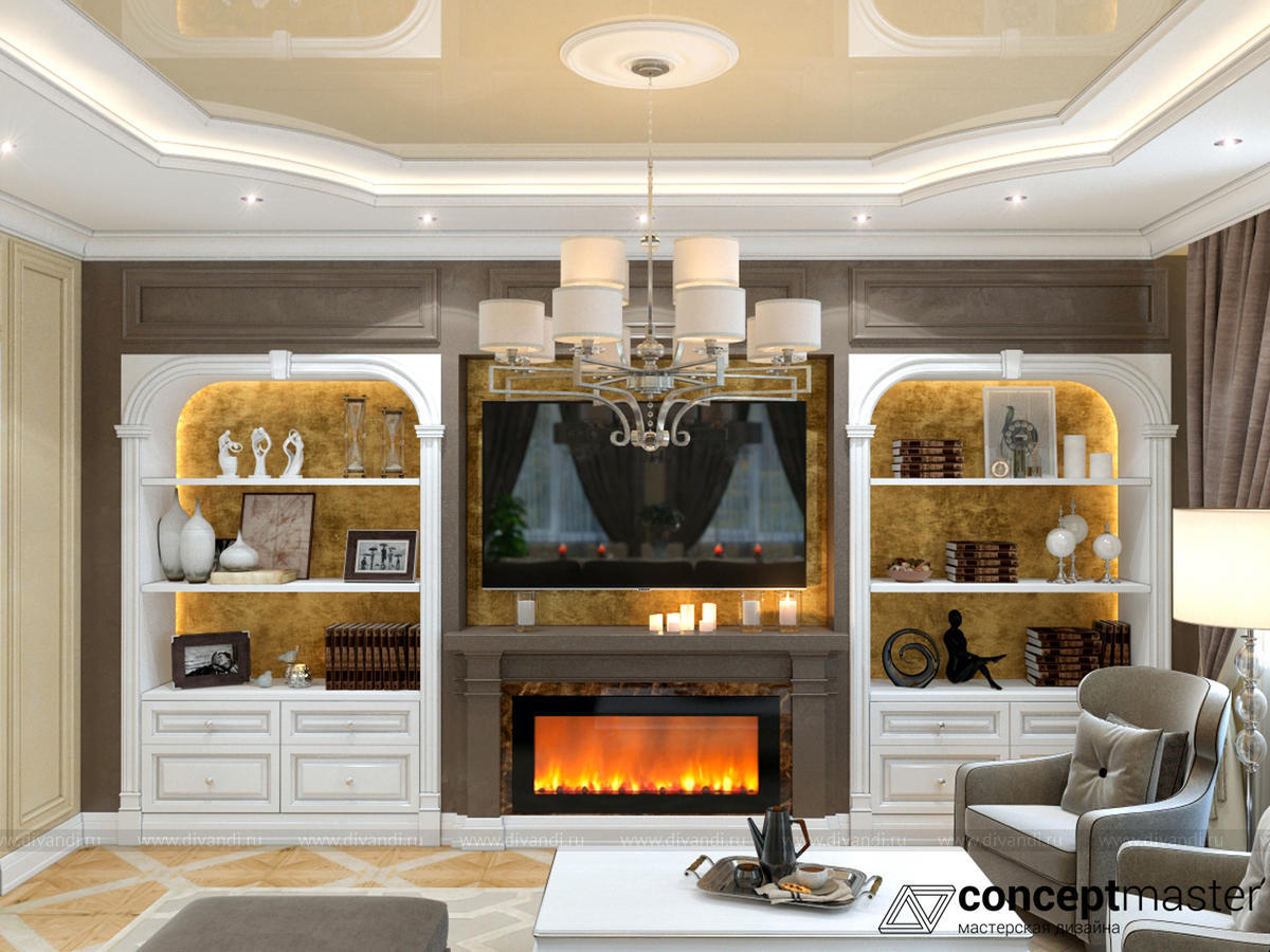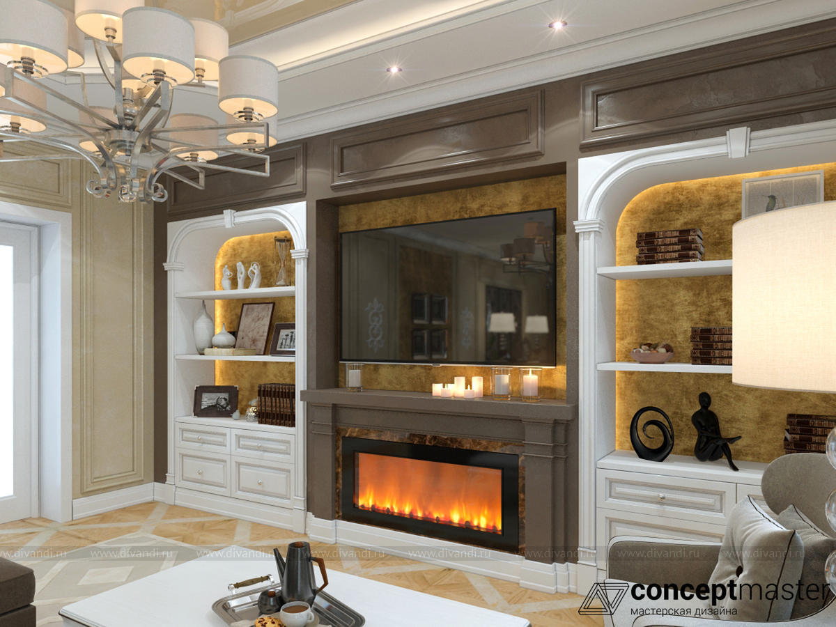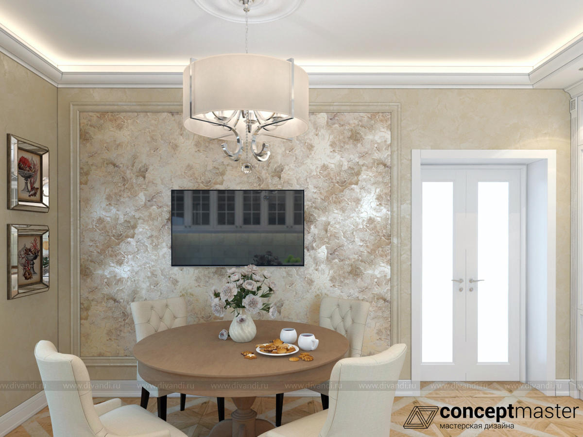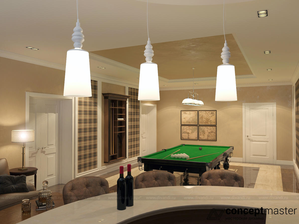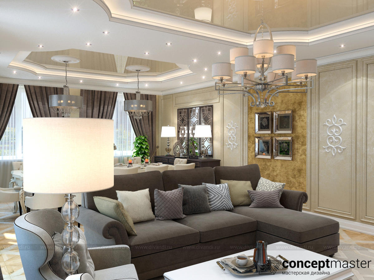 Интерьеры в этом коттедже выполнены в стиле неоклассики, что сопровождается высокими потолками, комнатами внушительных размеров и широкой лестницей. Наши дизайнеры при создании этого дома стремились подчеркнуть достоинства классической, античной архитектуры - чистые линии, симметрия, простые формы, сдержанная геометрия, благородный, но не чрезмерный декор.