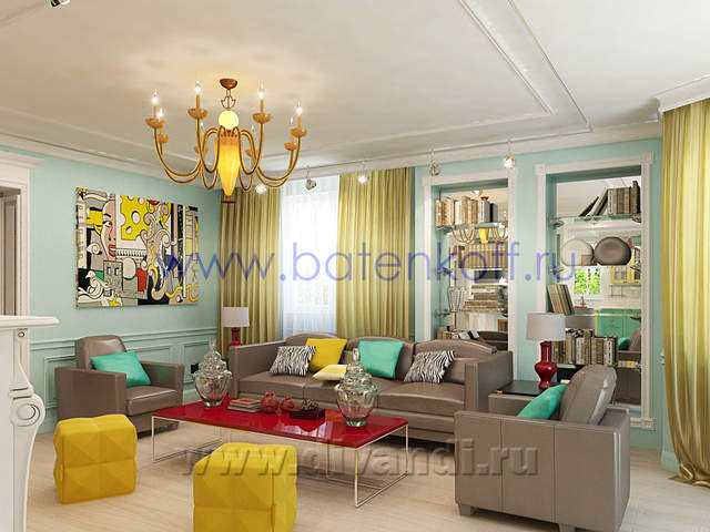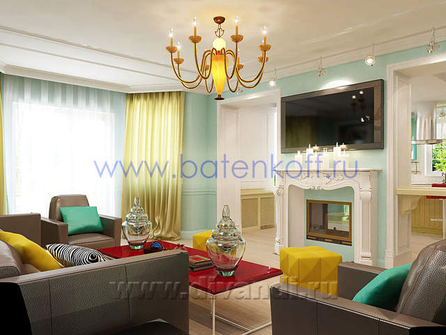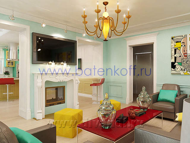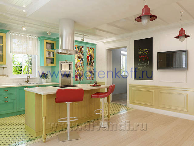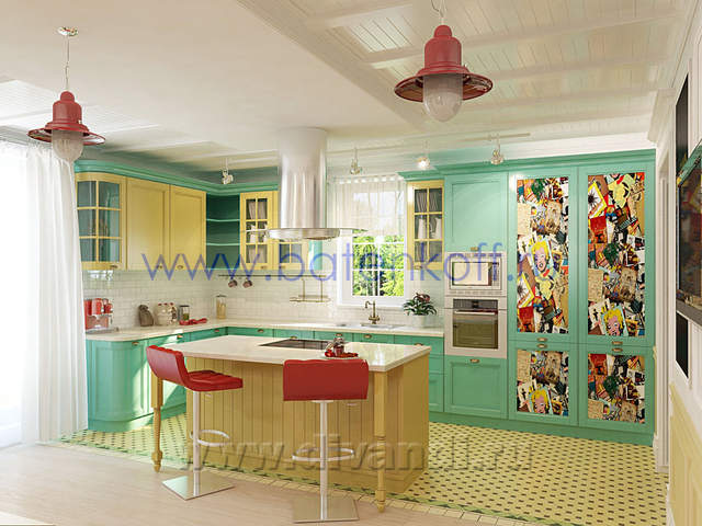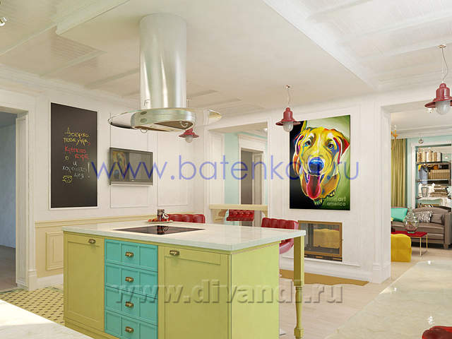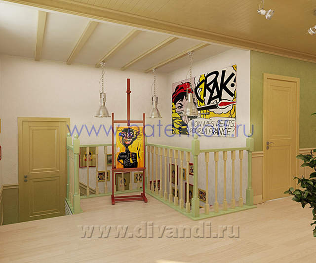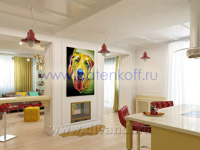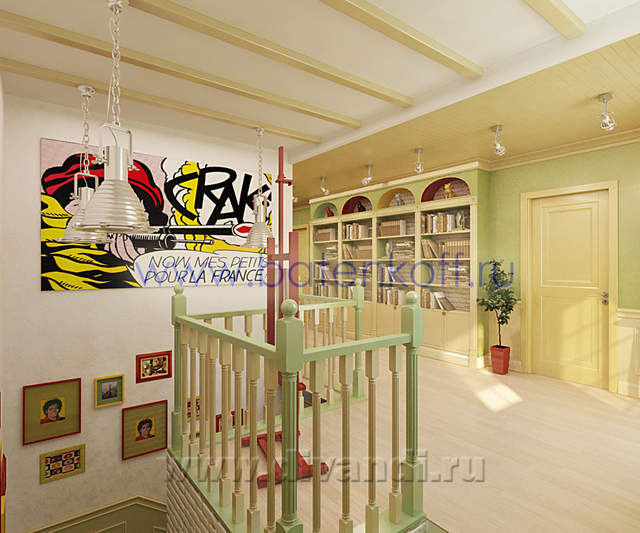 Интерьер загородного дома выполнен в стиле поп арт. СТИЛЬ ПОП-АРТ создан, чтобы удивлять людей своим дизайном. В дизайне интерьера поп-арт выглядит необычно, экспрессивно, контрастно, ярко. Основные черты поп-арта: радужные цвета, броские формы, использование пластика, повторяющиеся элементы. Стены в стиле поп-арт: Обязательно должны быть яркими, а в идеале – разных цветов и даже фактуры. Потолок в стиле поп-арт:Количество уровней потолка не принципиально, наоборот, на этом можносыграть, сделав разноуровневые несимметричные ниши, обыграв это подсветкой разных цветов. В случае одноуровневого потолка выбирайте глянцевые покрытия, будь то подвесной, натяжной либо просто окрашенный белый потолок. Блеск и глянец поп-арту к лицу. Мебель в стиле поп-арт: Поп-арту не приемлемо перенасыщение мебели, поэтому ограничьтесь минимальным набором. Мебель поп-арт должна быть неординарной . Предметы декора в стиле поп-арт: Поп-арт балует обилием деталей и интересных мелочей. Характерно использование повторяющихся мотивов: постеры, картины, ковры с растиражированным рисунком. Приветствуется яркий и пестрый текстиль, подобранный в основной цветовой гамме. Различные стилизованные пластиковые аксессуары: часы, рамки для фотографий, статуэтки, вазы, светильни и подсвечники. Кроме пластика и текстиля еще можно выделить окрашенные кожаные и яркие металлические (хромированные) детали в интерьере. Для поп-арта подойдут самые необычные предметы: светящаяся посуда, розовый унитаз, лампа в виде супермена и прочие неординарные вещи. В результате работы получился яркий и интересный проект загородного дома.