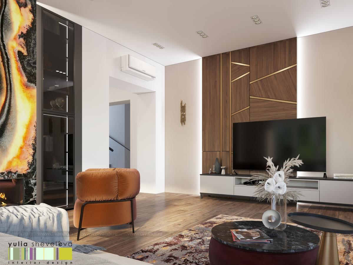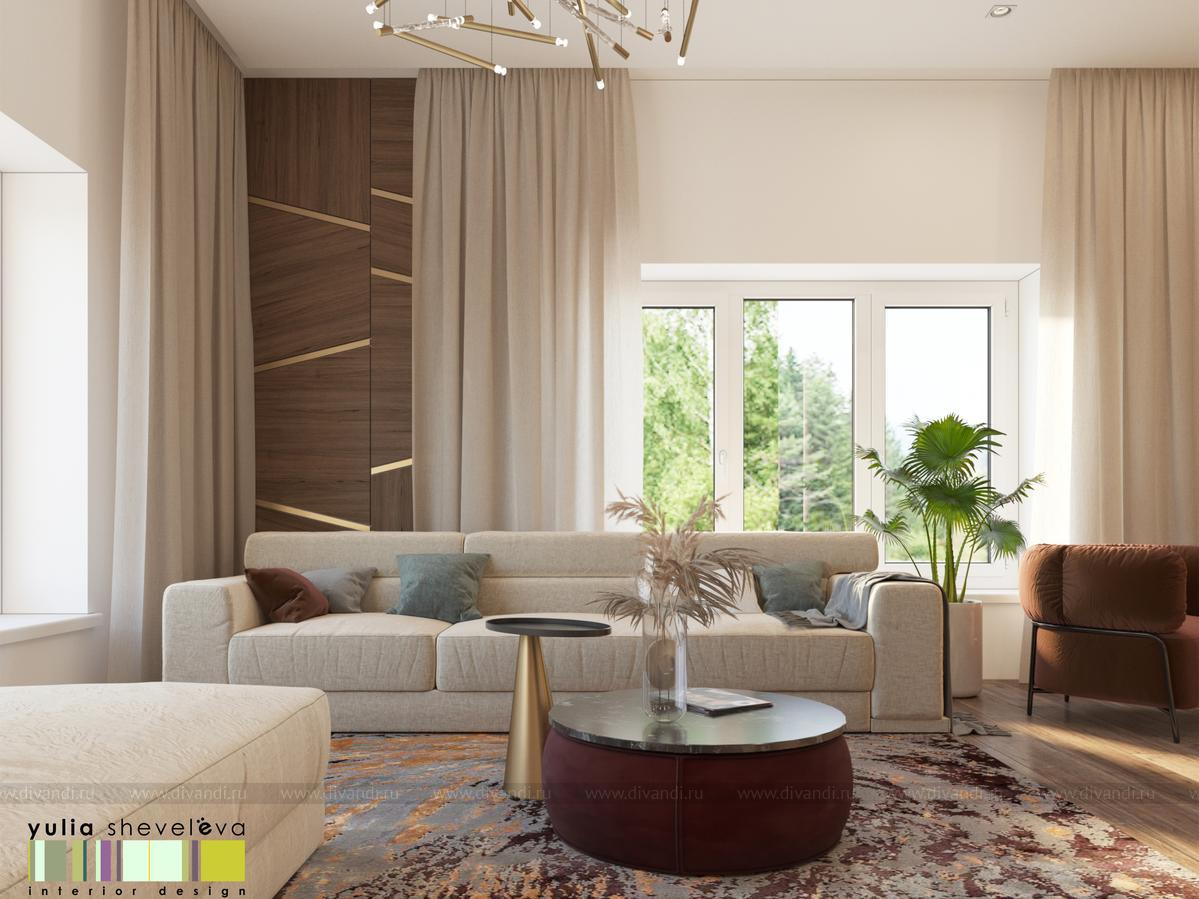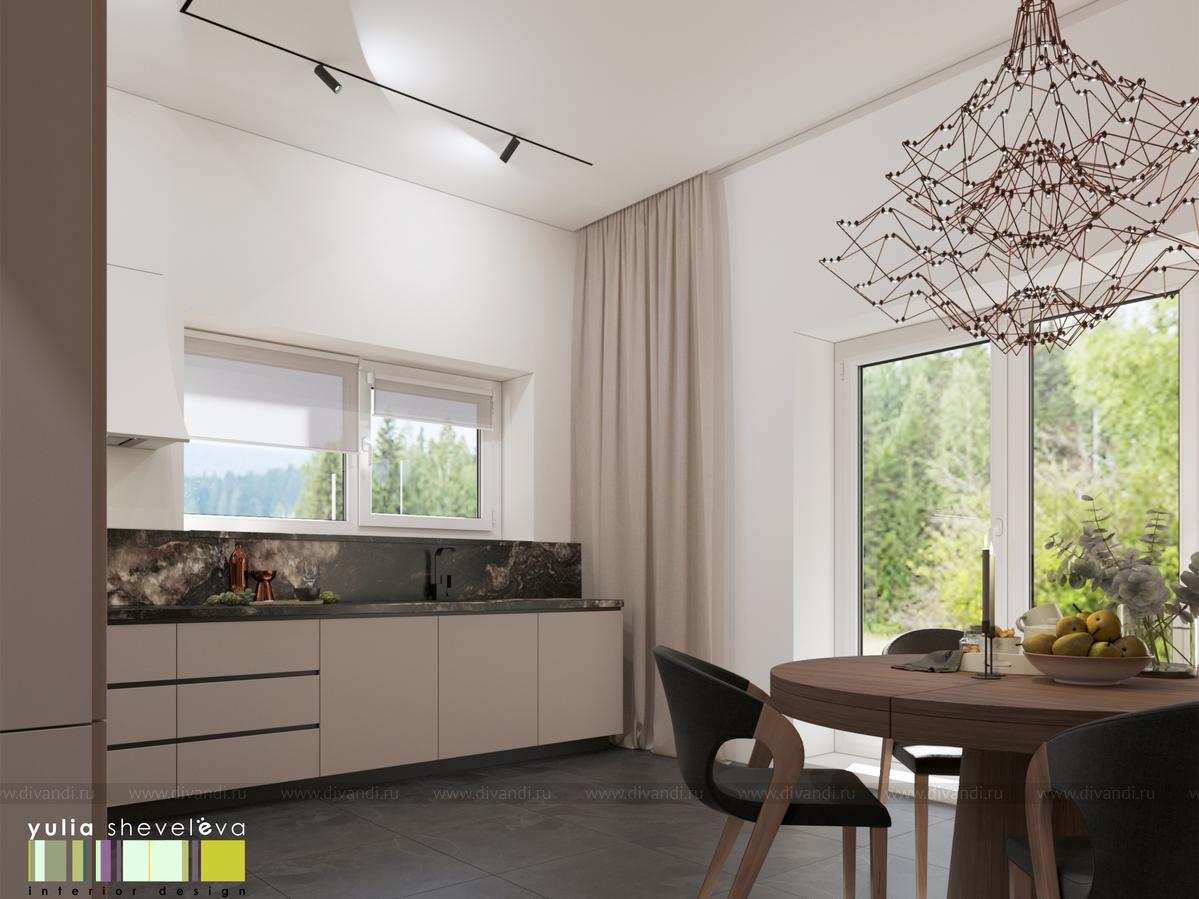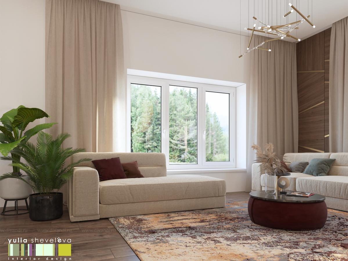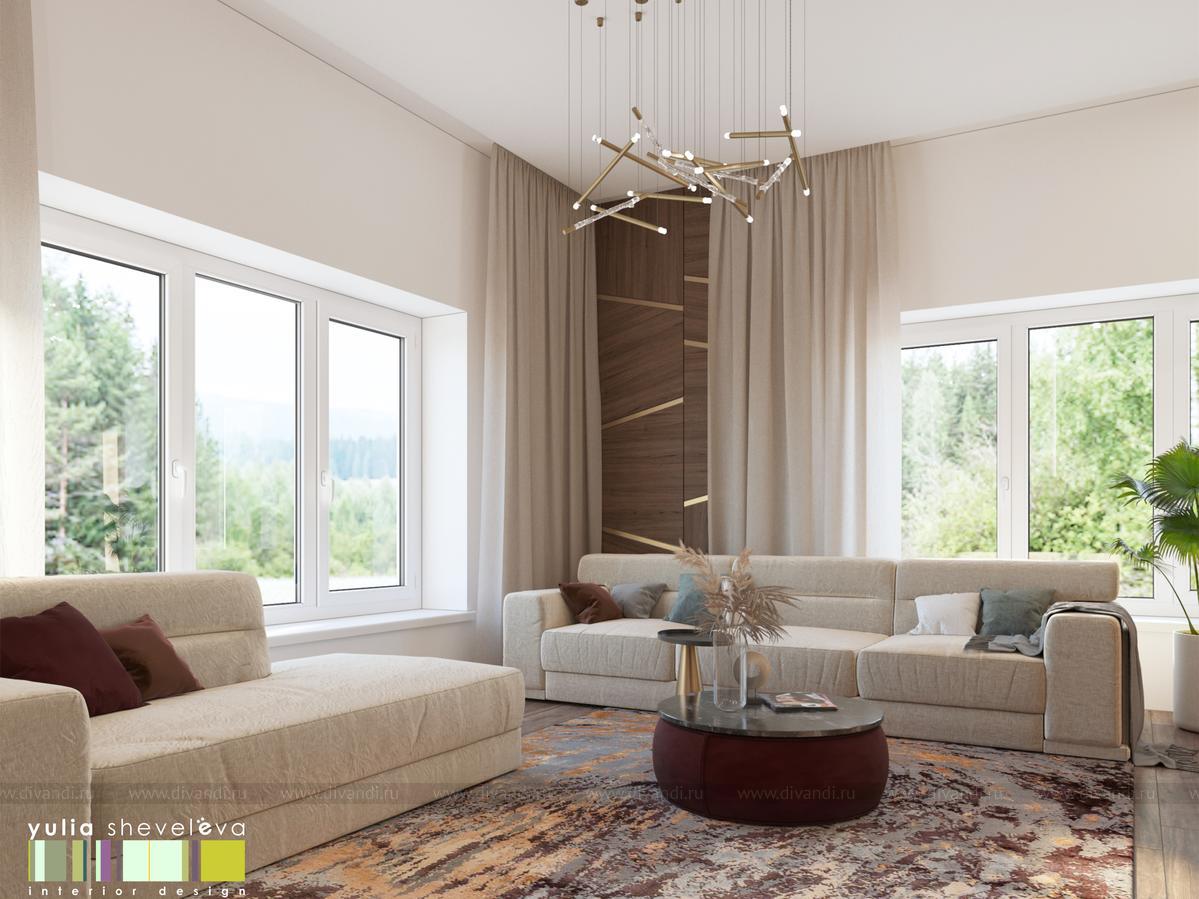 Дизайн интерьера загородного дома, общей площадью 320 м², выполнен в рамках проектирования загородного дома в КП Брусника.
