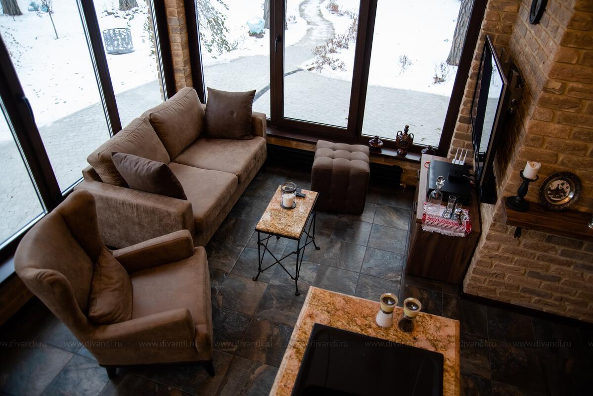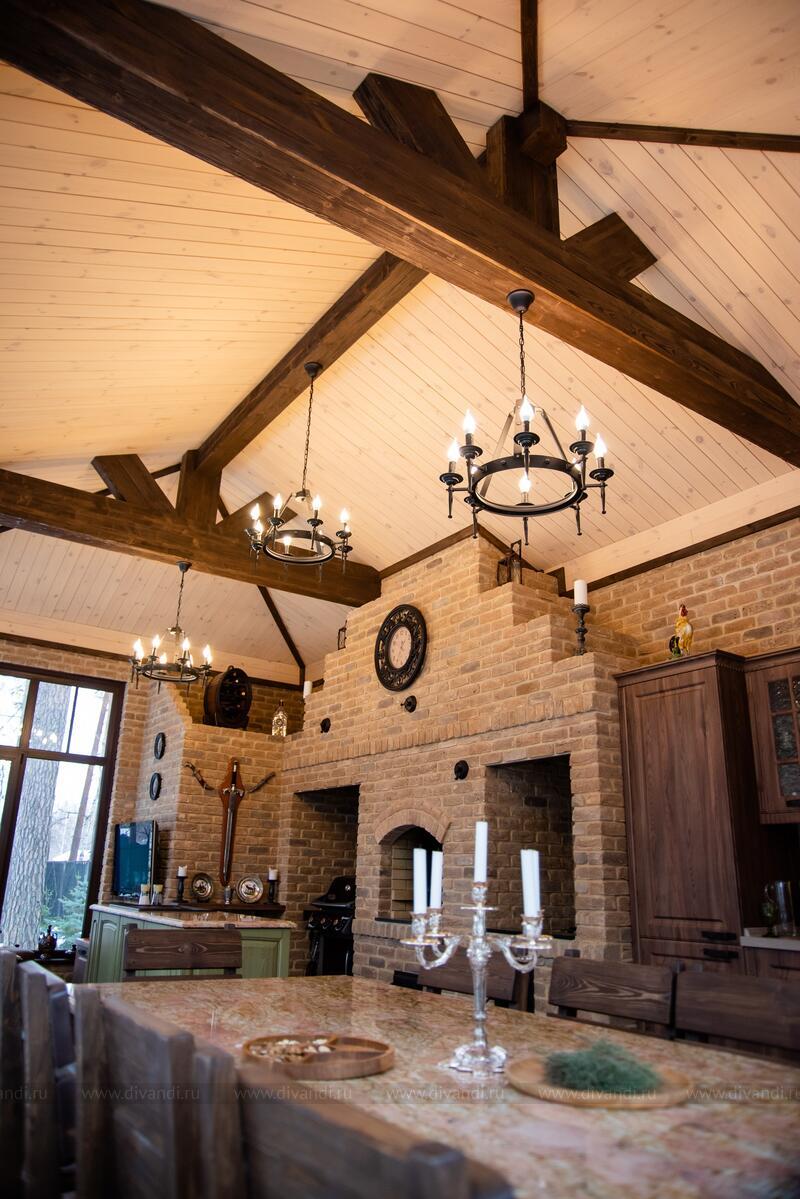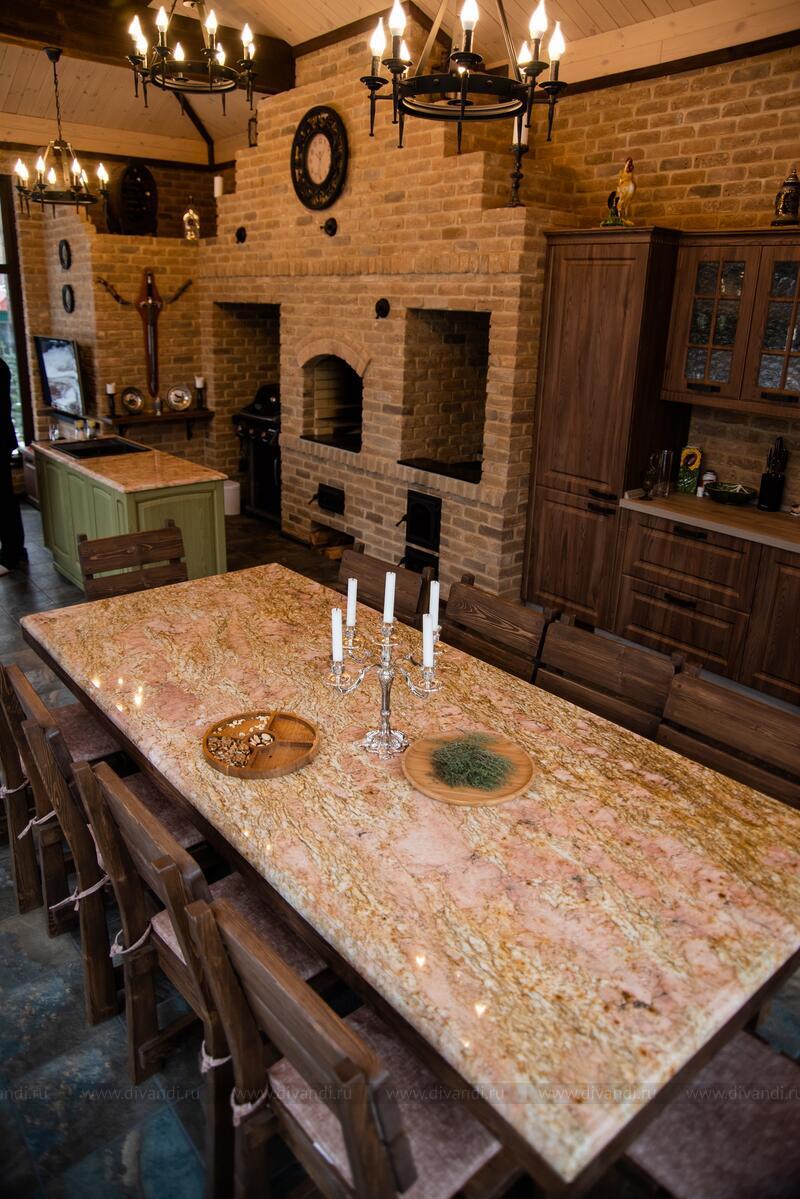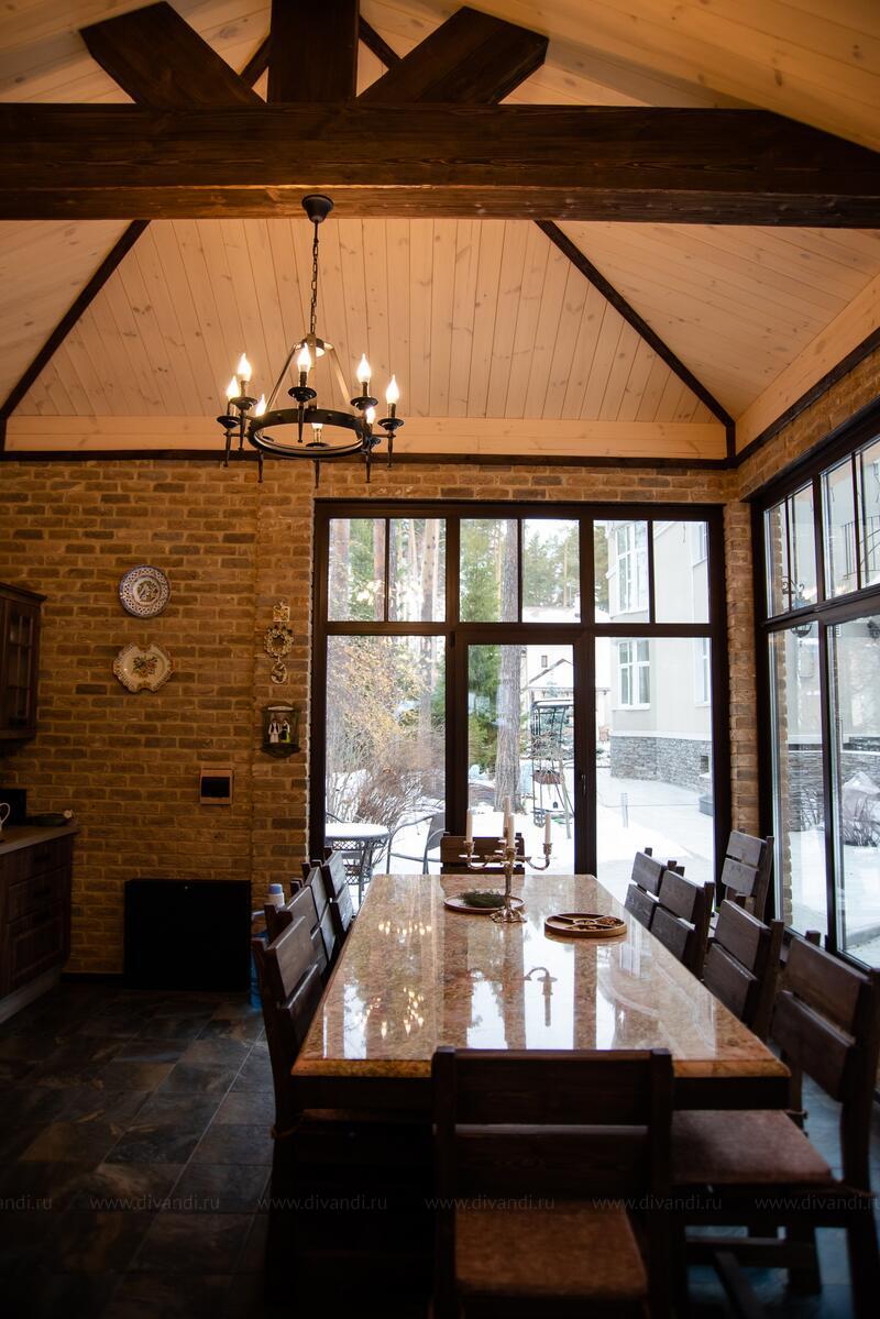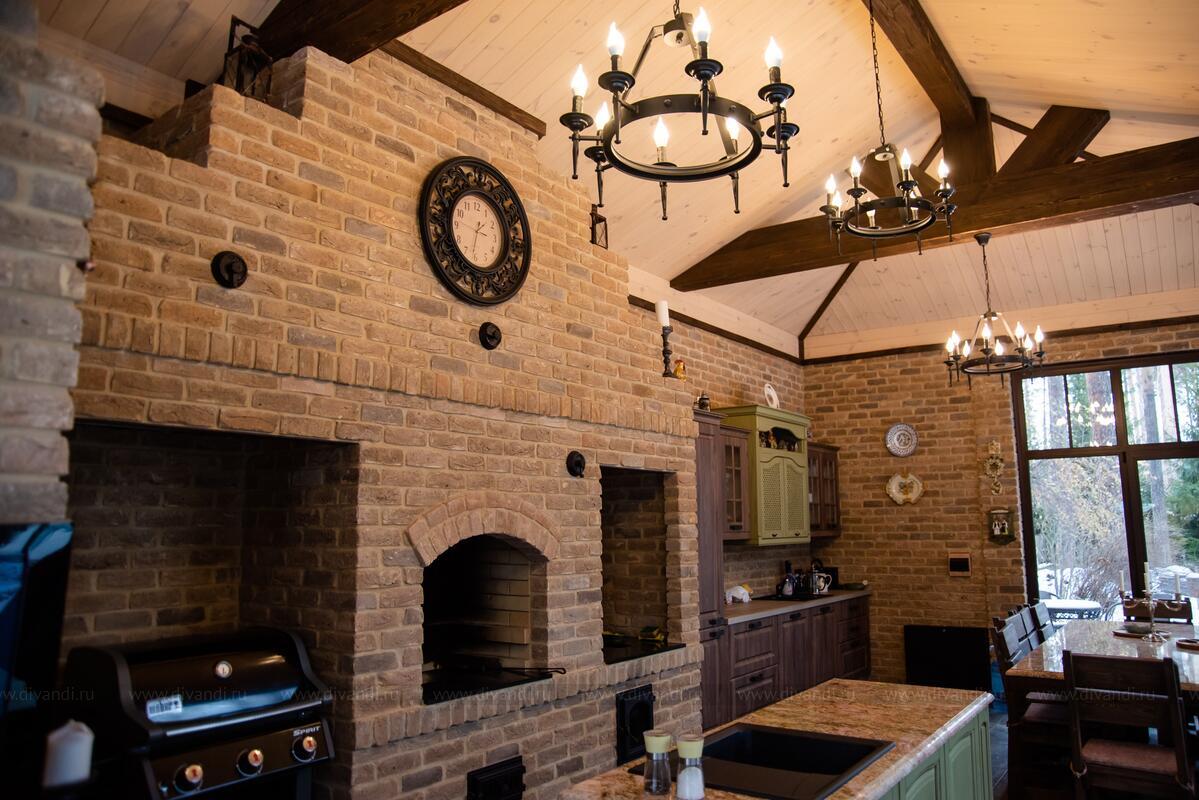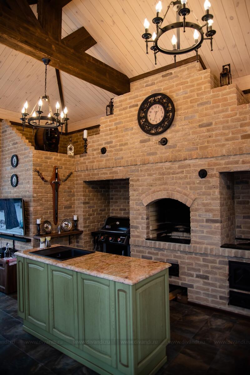 Постройка используется в качестве летней кухни или теплой беседки, в которой можно отдыхать даже при холодных осенних температурах.