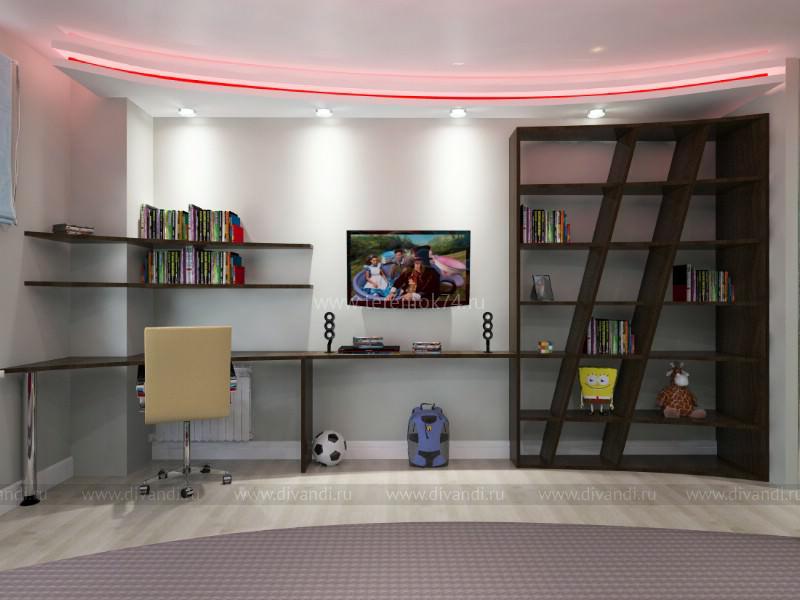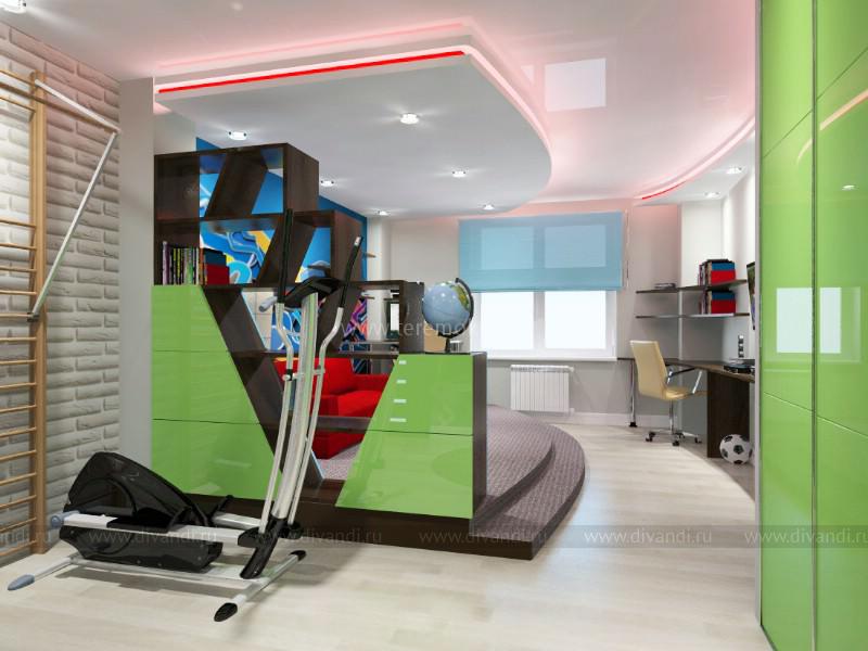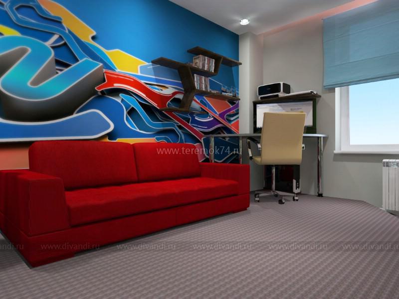 Дизайн детской комнаты на ул. Бейвеля, д. 6 (ЖК Александровский). Комната для мальчика 9 лет. Интерьер комнаты раздел на 4 зоны: игровая и спортивная, учебная и спальная. Увлеченность современными видами искусства мальчика отражены в граффити и по задумке будут выполнены профессиональными художниками. Сочетание декоративного камня, ярких красок граффити и ломанных линий фасадов мебели создают прекрасную атмосферу для отдыха, учебы и развлечений подростка.