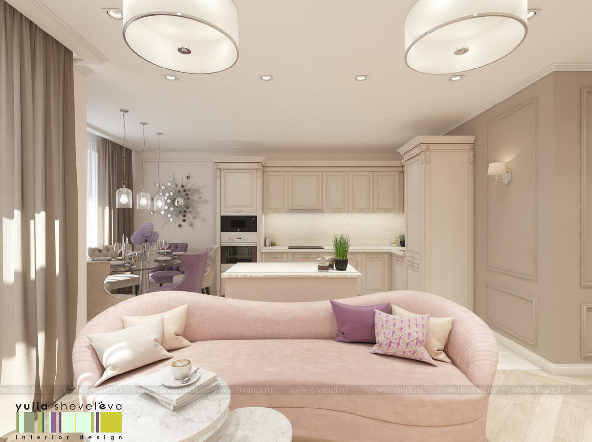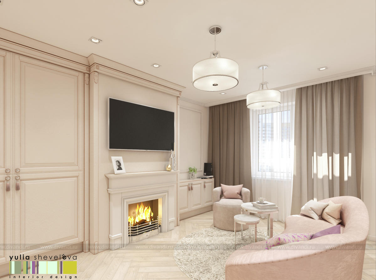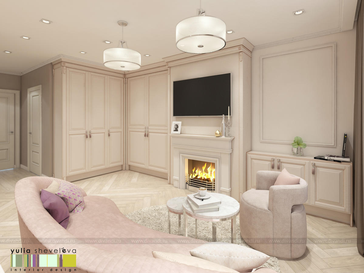 г. Екатеринбург, ЖК Das Haus. Интерьер создавался для молодой, очень нежной девушки и получился таким же – утонченным и женственным. Его стилистику можно назвать «обволакивающей» классикой – настолько он мягкий и уютный. Такое настроение создается плавными линиями мягкой мебели, лепниной на стенах и «сливочными» оттенками бежевой цветовой гаммы. Пудровые акценты оживляют интерьер, но не перегружают его. Динамики интерьеру добавляет способ укладки паркетной доски французской елочкой.