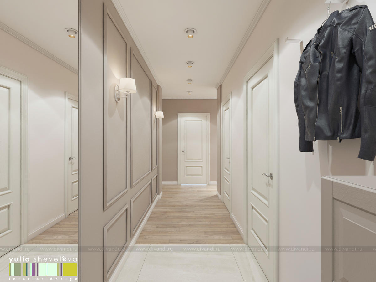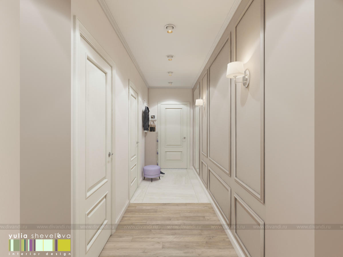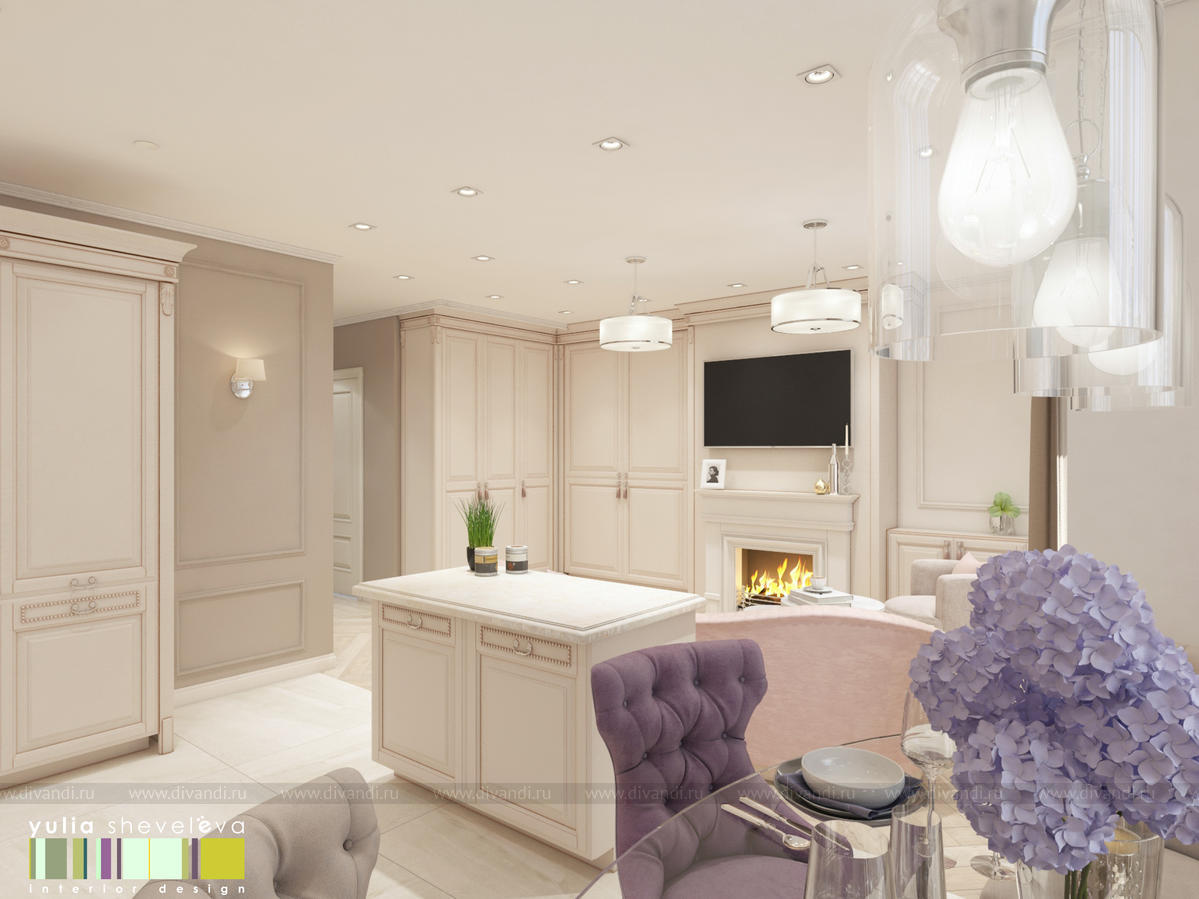 г. Екатеринбург, ЖК Das Haus. Интерьер создавался для молодой, очень нежной девушки и получился таким же – утонченным и женственным. Его стилистику можно назвать «обволакивающей» классикой – настолько он мягкий и уютный. Такое настроение создается плавными линиями мягкой мебели, лепниной на стенах и «сливочными» оттенками бежевой цветовой гаммы. Пудровые акценты оживляют интерьер, но не перегружают его. Динамики интерьеру добавляет способ укладки паркетной доски французской елочкой.
