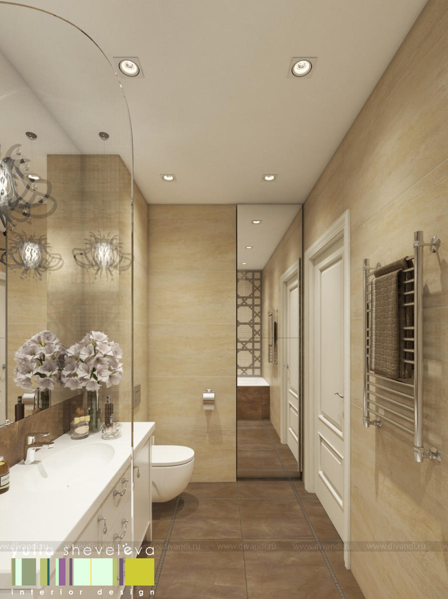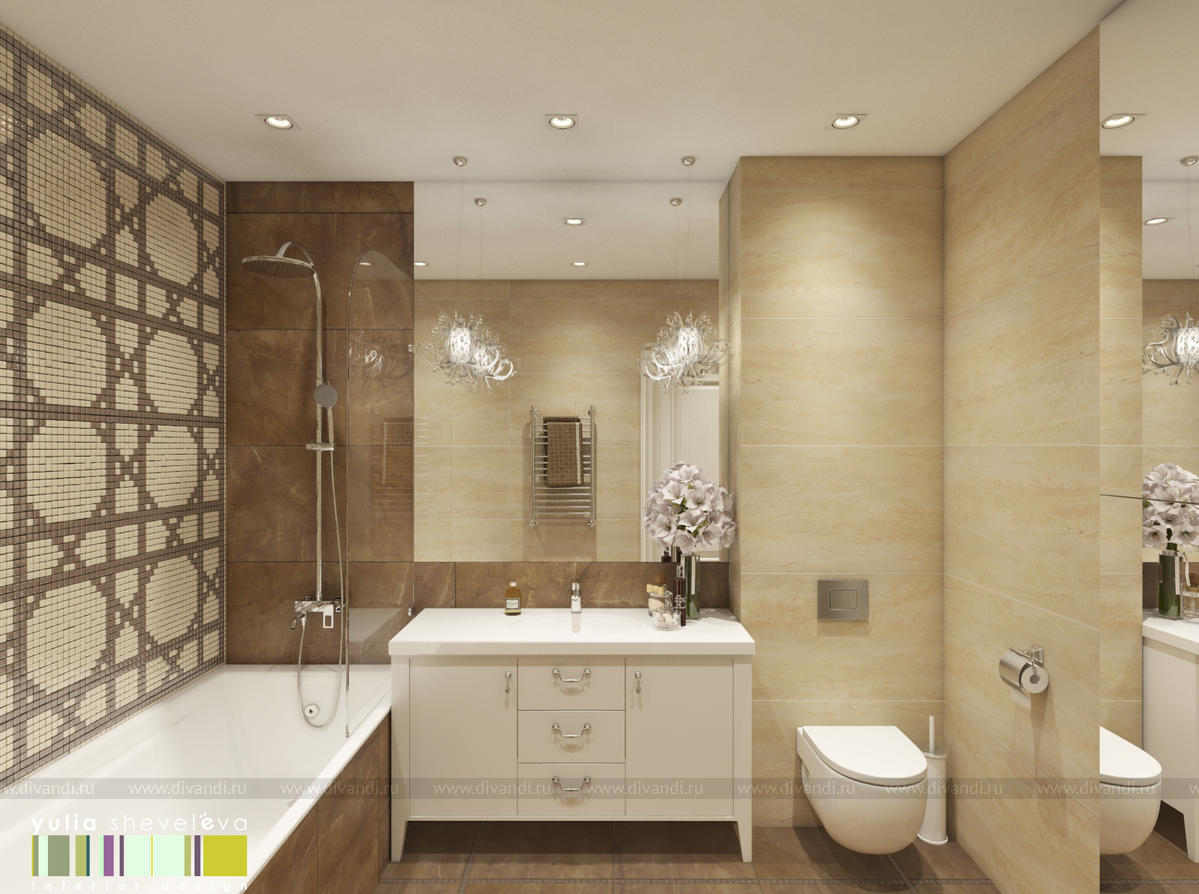 Ванная комната является логичным продолжением всего интерьера. Здесь внимание к себе приковывает панно из мозаики, расположенное над ванной. Мозаику нарезали из фоновой плитки и собрали в необходимый нам узор в одном из салонов города. Классическую стилистику интерьера подчеркивает форма выбранных подвесов, размещенных над тумбой с умывальником. При этом они не создают ощущение массивности, тяжести, зачастую присущее классическим светильникам. Наоборот, они выглядят легкими и воздушными благодаря использованию прозрачного пластика в своей конструкции.