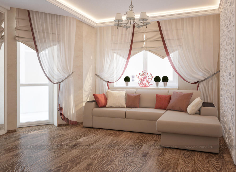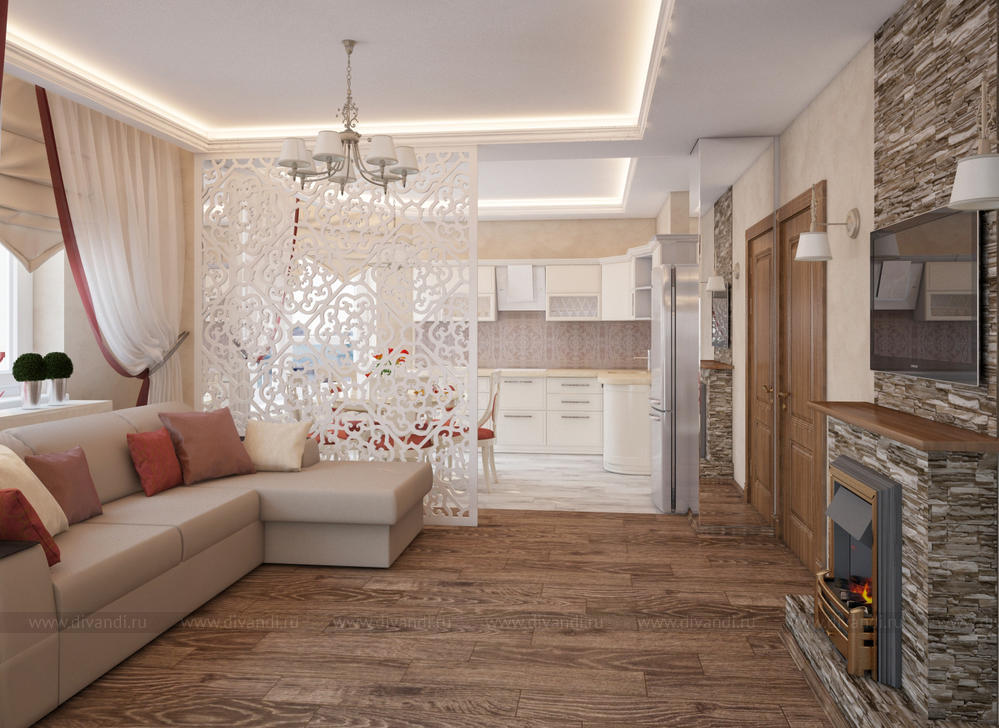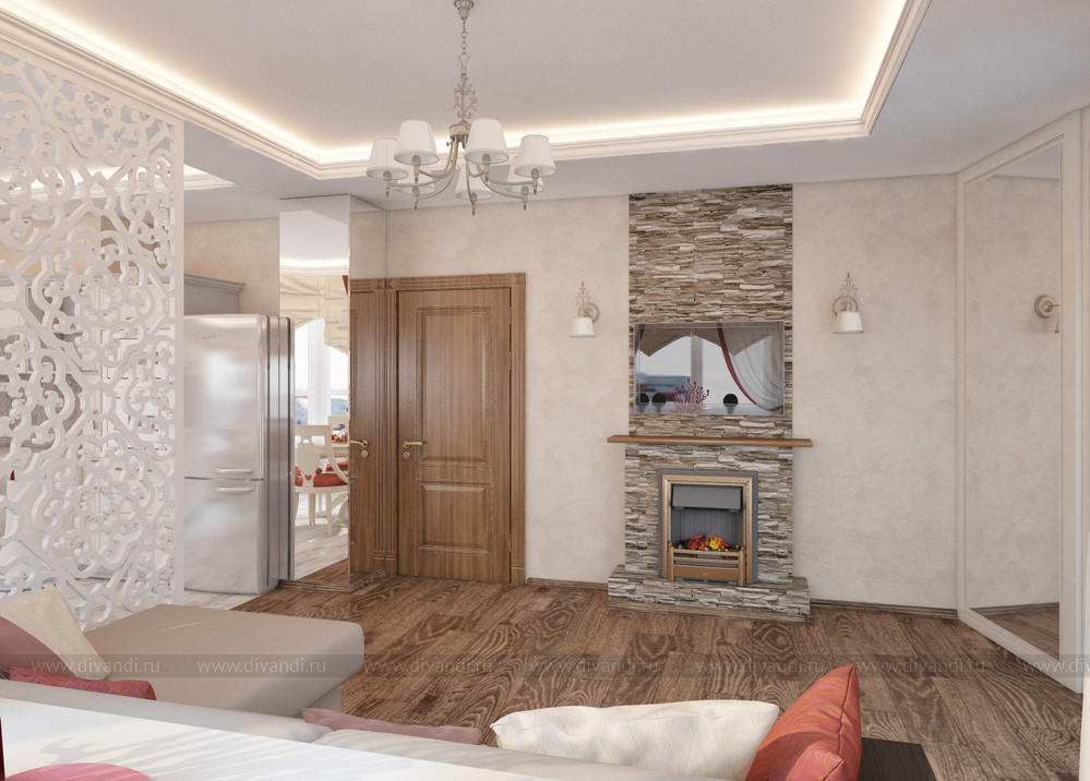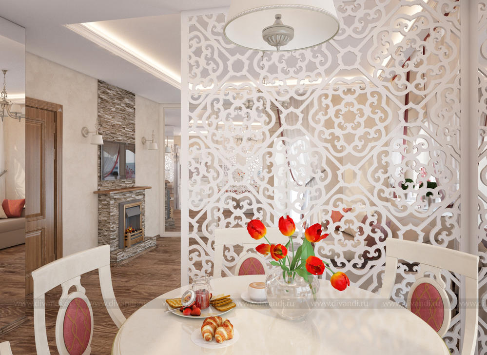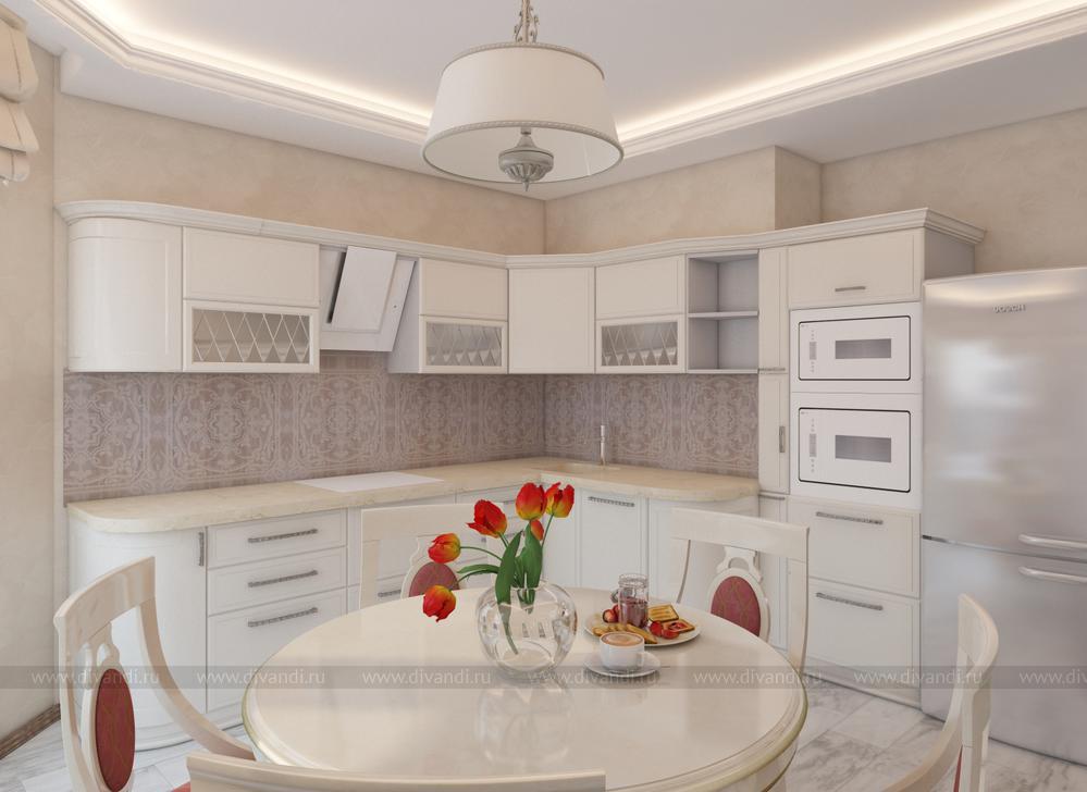 Светлая и воздушная кухня-гостиная выполнена в современном стиле с классическими элементами.