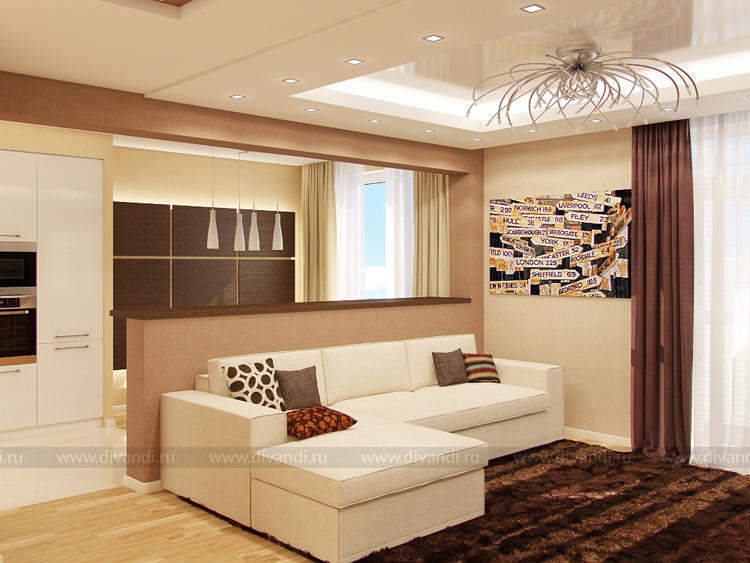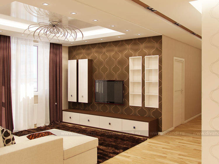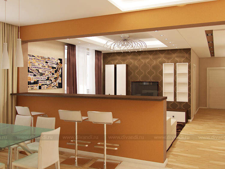 На данном примере мы хотим показать как идет корректировка проекта и как дизайн может меняться в ходе работы. Изначально был вариант раздельной кухни гостиной, но клиенты решили внести изменения с частичным объединением двух зон. Гостиная получилась теплая и уютная как раз для проведения вечеров в кругу семьи! А какой вариант вам нравиться больше первый или второй?