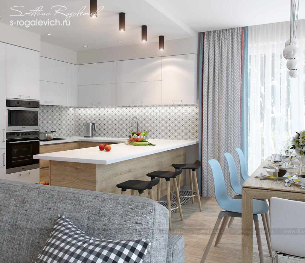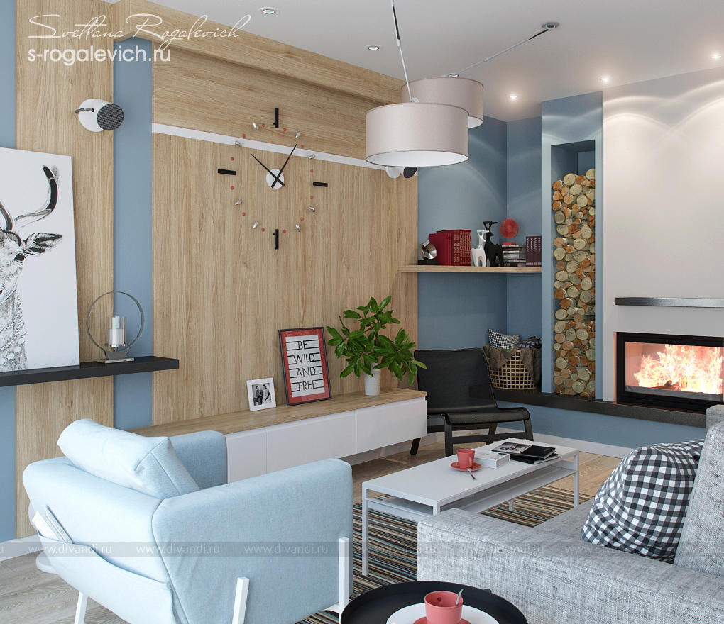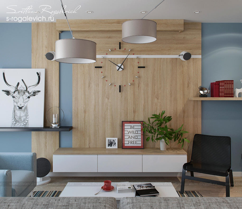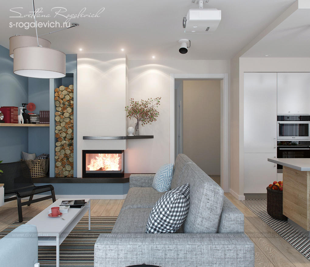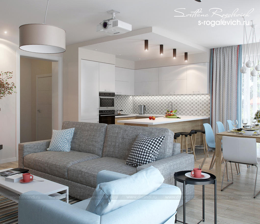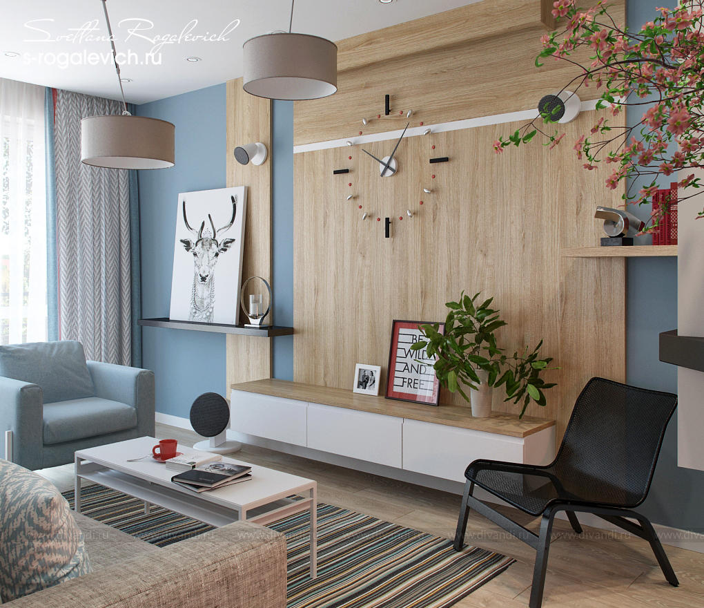 Современный дизайн с элементами скандинавского стиля. Площадь помещения 39 м2.