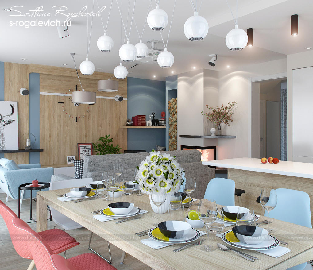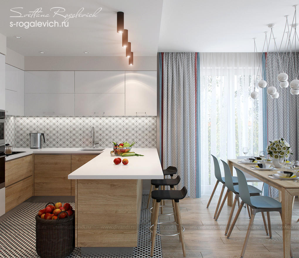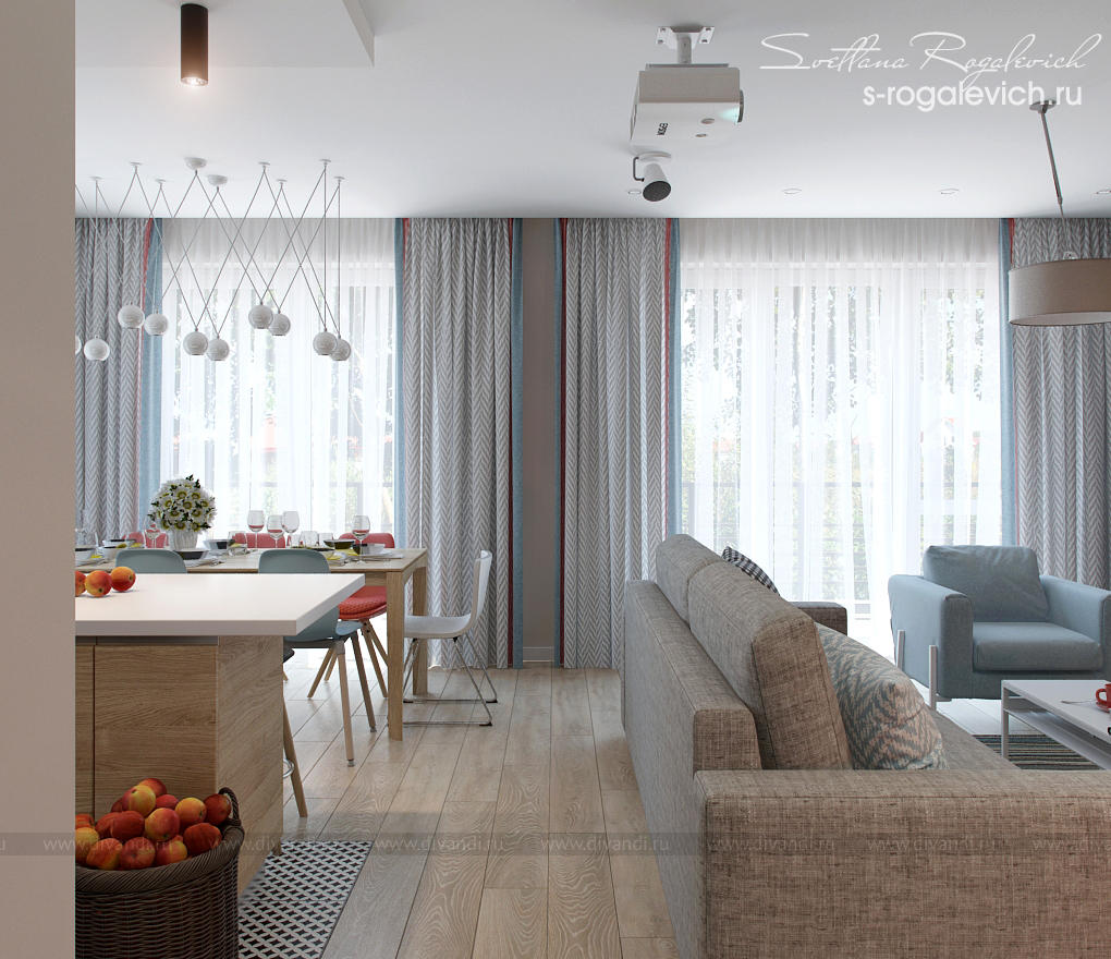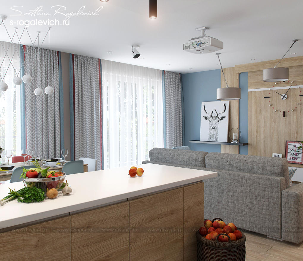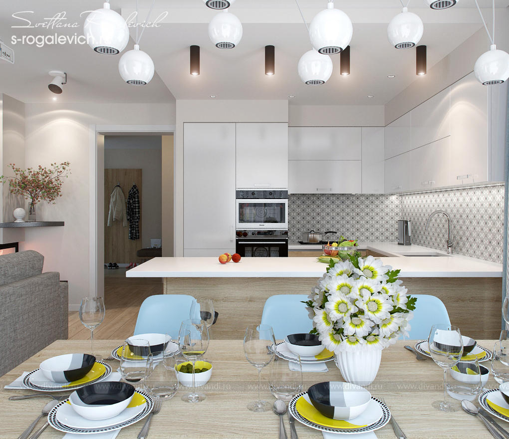 Современный дизайн с элементами скандинавского стиля. Площадь помещения 39 м2.