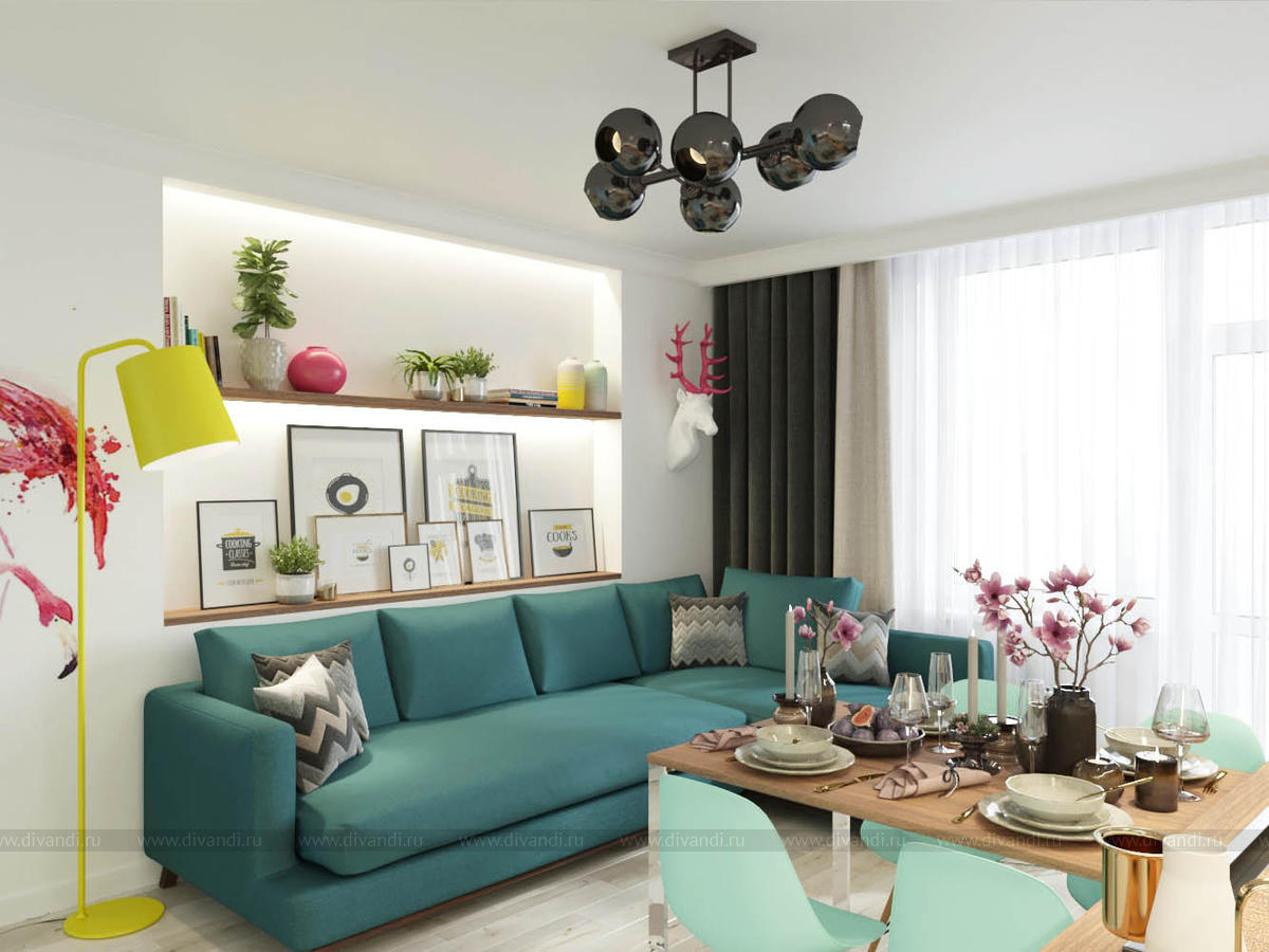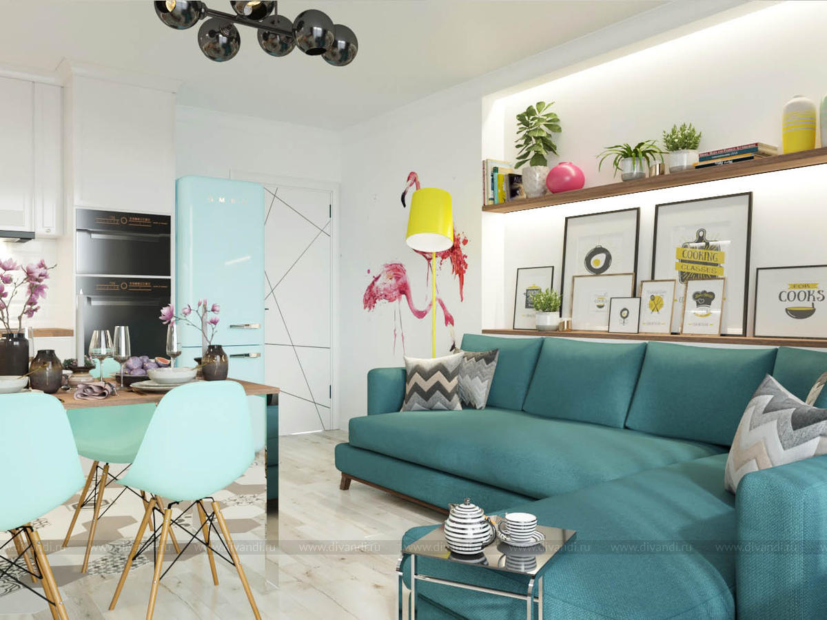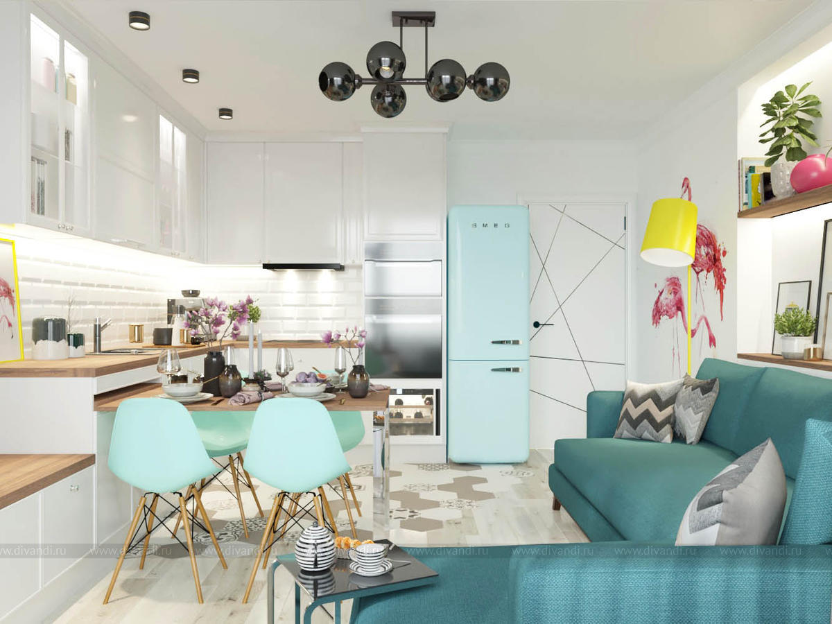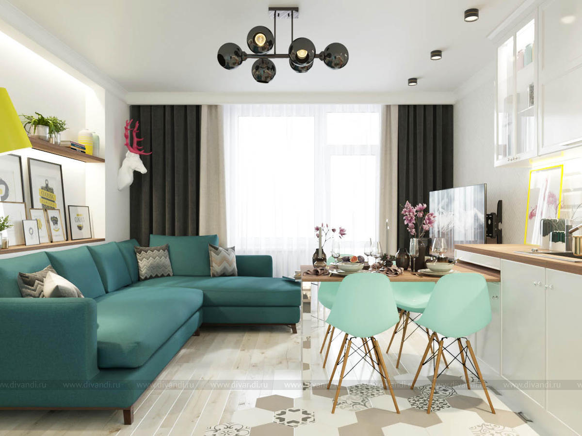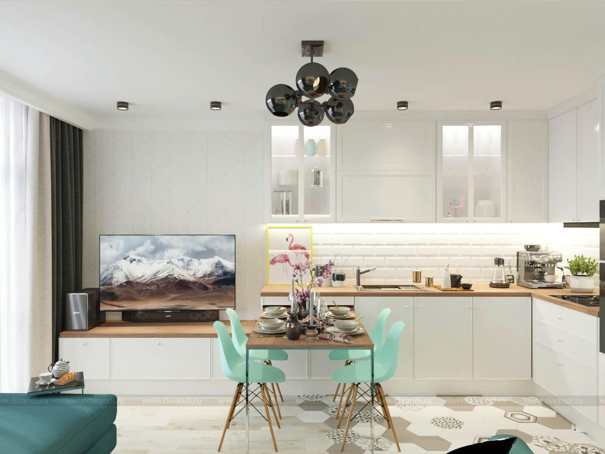 Яркая кухня-гостиная в трехкомнатной квартире.