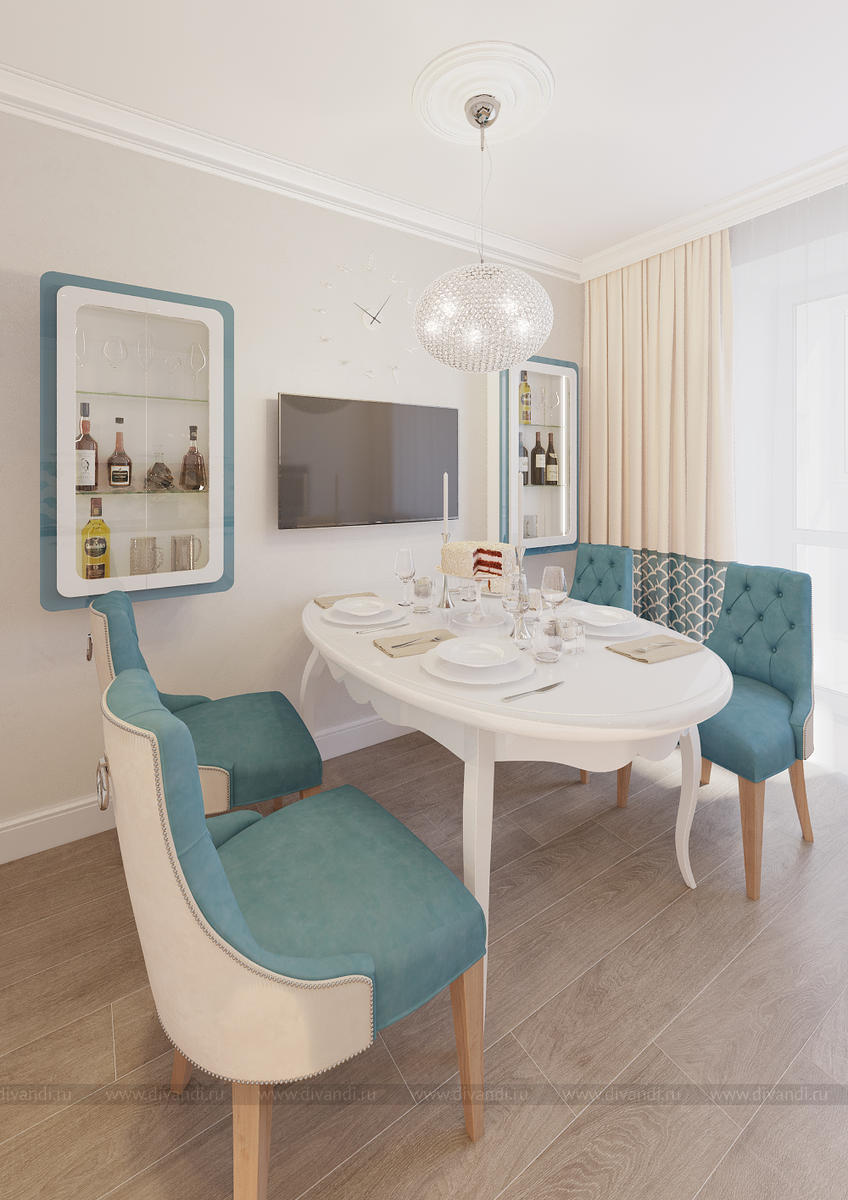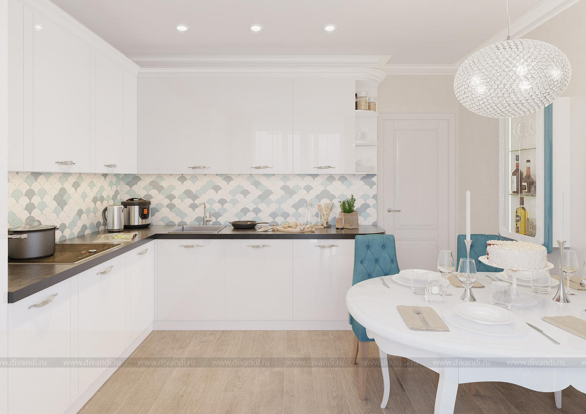 Легкая свежая! Фасады лаконичные белые, глянцевые, акцент сделан на необычном фартуке.Стулья двухсторонние! Спинка светлая, внутри темный лазурный цвет! Чтобы стулья быстро не пачкались от джинсов и темных штанов! Стол белый под кухню! Навесные витрины бар! По периметру рамы, мы пустим диодную подсветку теплого цвета! Стены светлые в штукатурке! Шторы необычные! Под фартук! Можно с рисунком, можно просто однотонные.