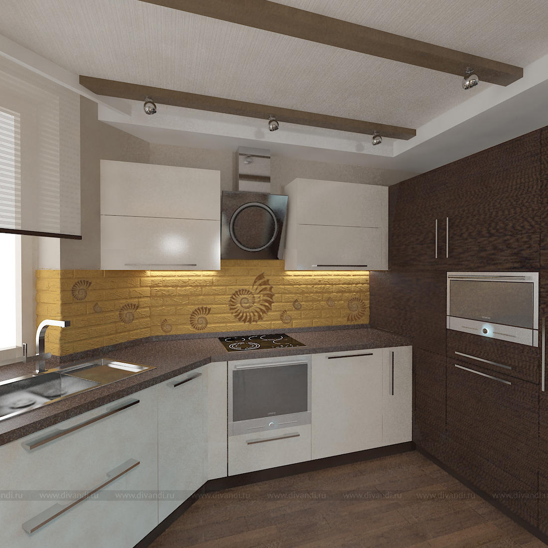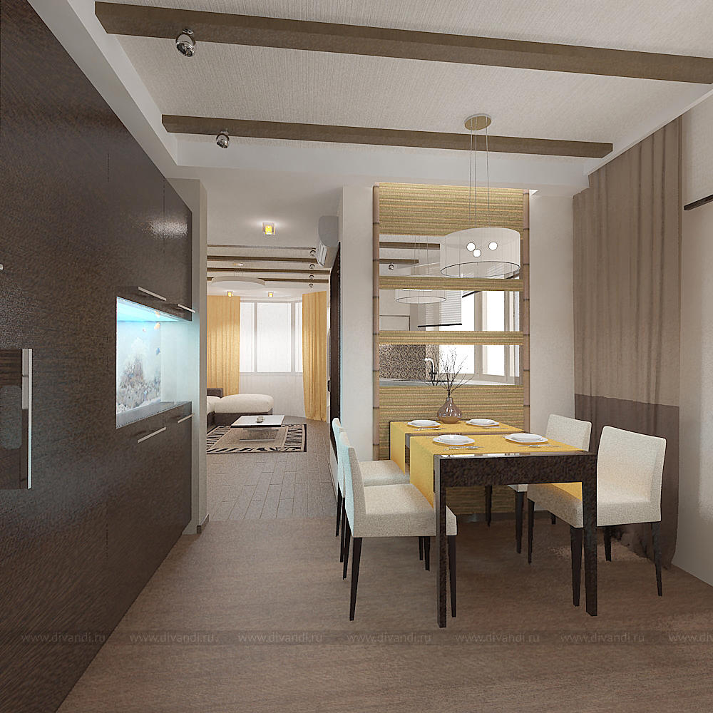 Кухня решена лаконично и функционально в естественных природных оттенках с акцентом на деталях. Бамбук, натуральные растительные обои, деревянные балки на потолке, аквариум тактично вносят свой экзотический штрих в городскую квартиру.