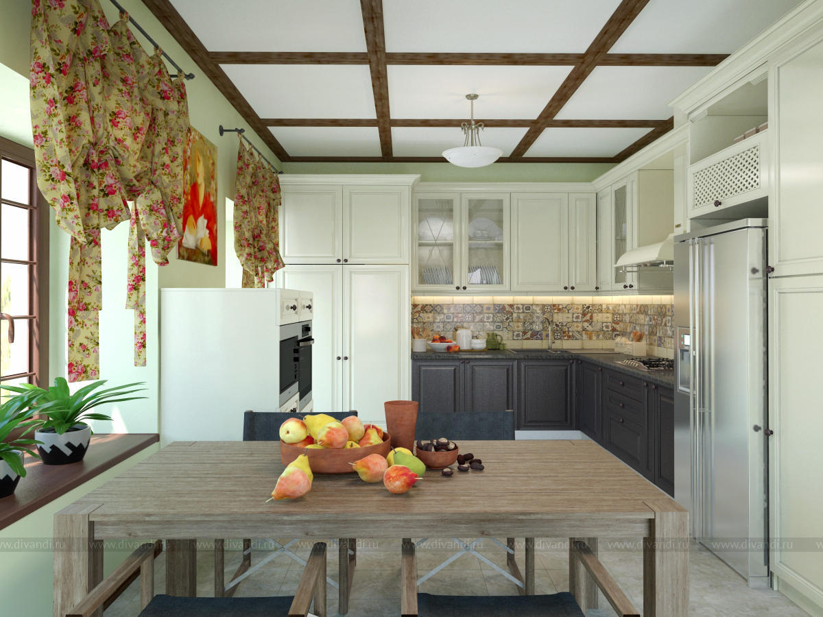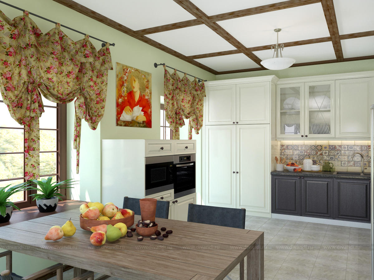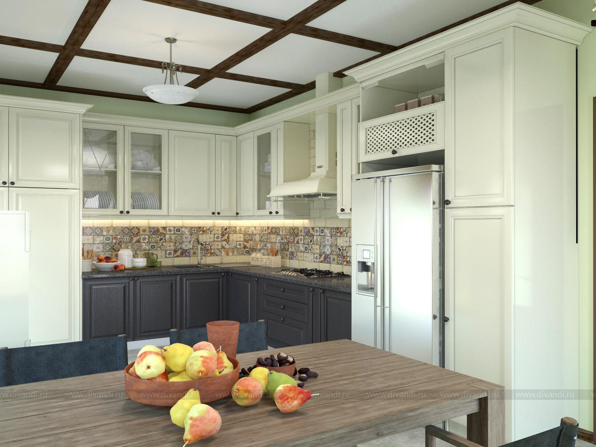Дизайн кухни-столовой в загородном доме. Деревянные крашенные фасады.