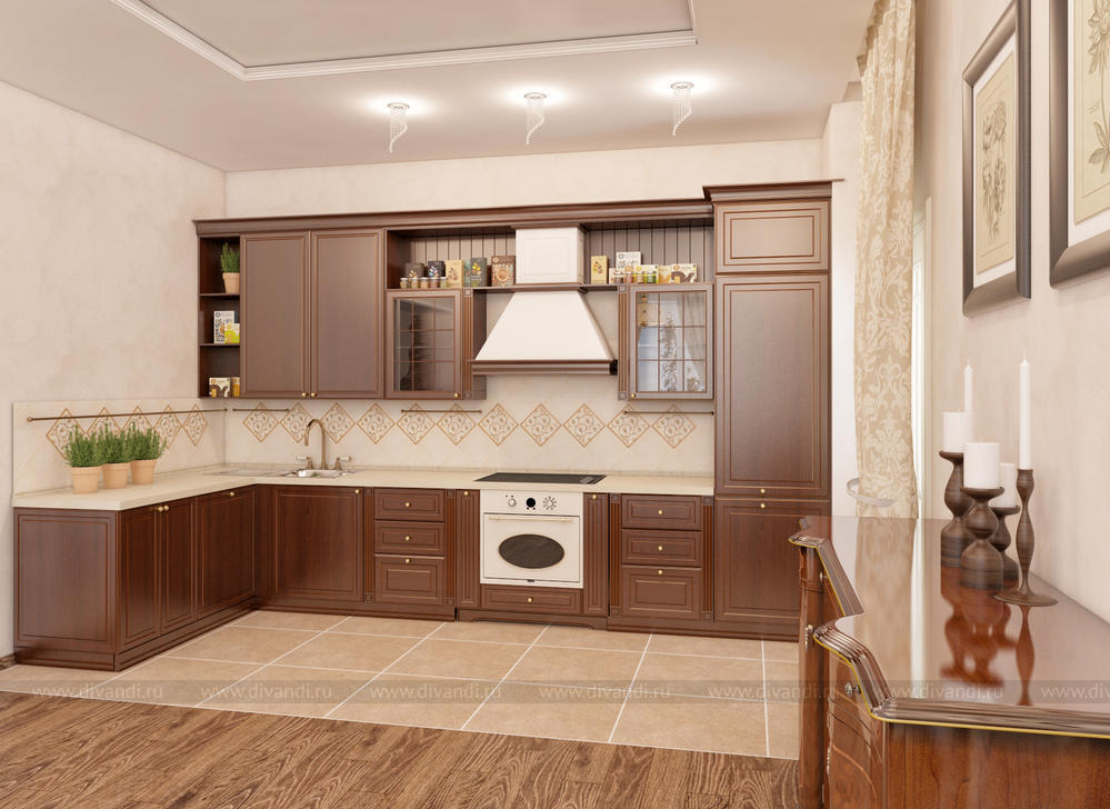 Кухня-столовая в загородном доме выполнена в легком классическом стиле.