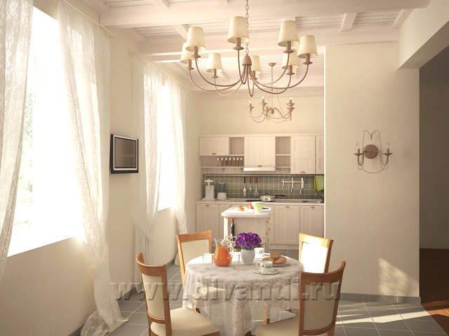 Кухня со столовой зоной в коттедже в стиле кантри.