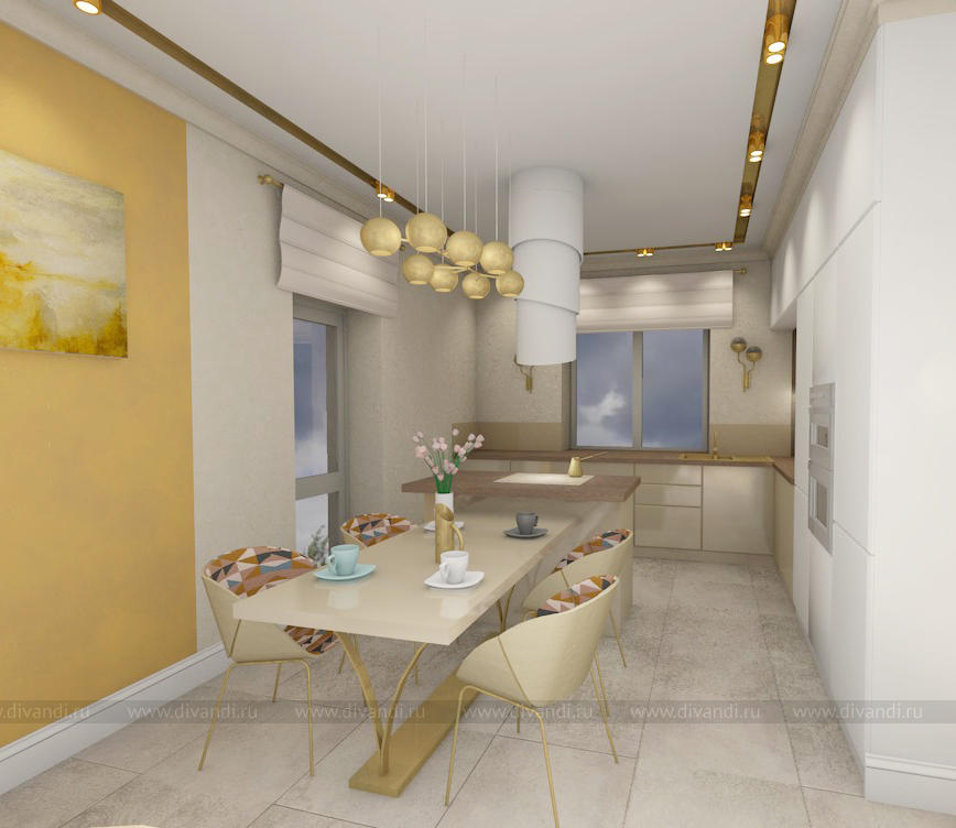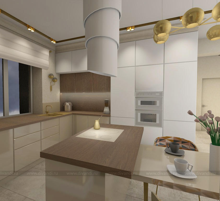Кухня расположена в общем пространстве гостиной. островной блок позволит хозяйка одновременно готовить и общаться с гостями.