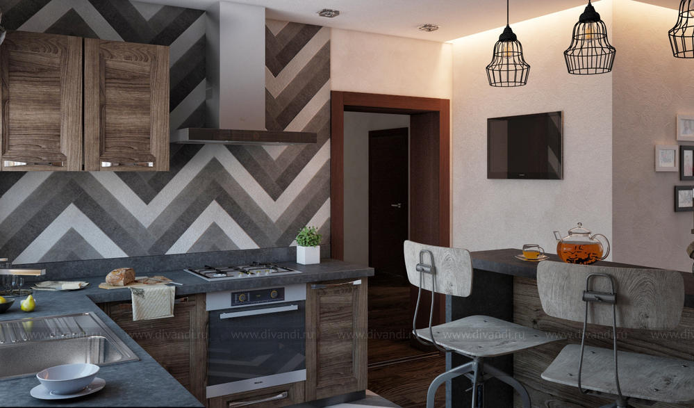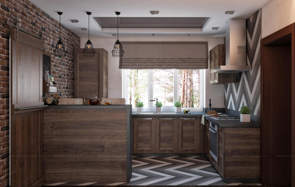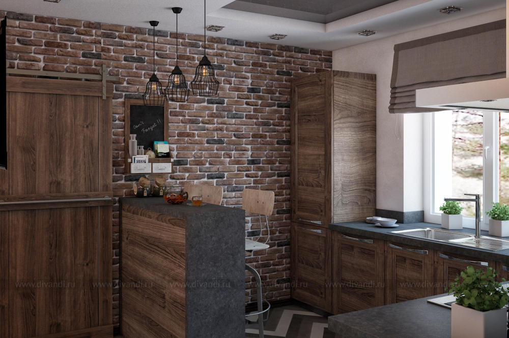 Кухня находится в загородном доме, выполнена в современном стиле с элементами лофта.