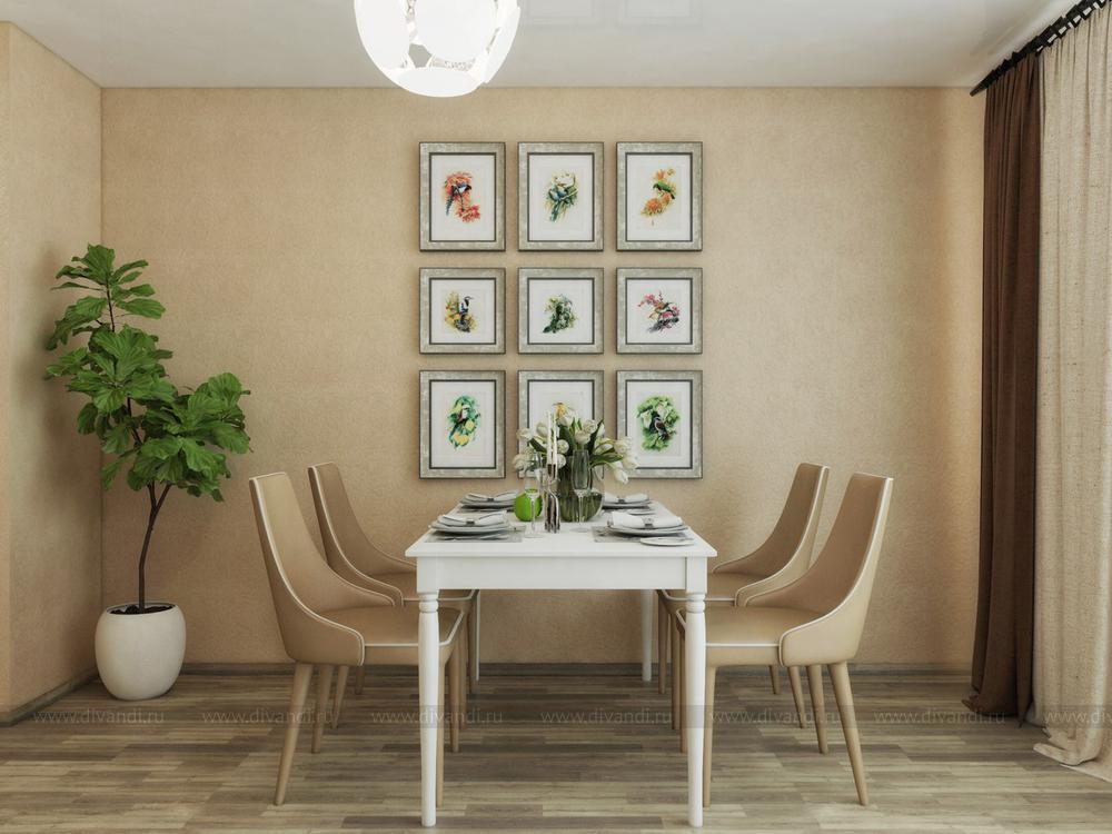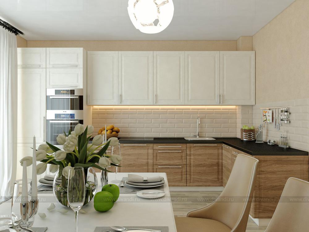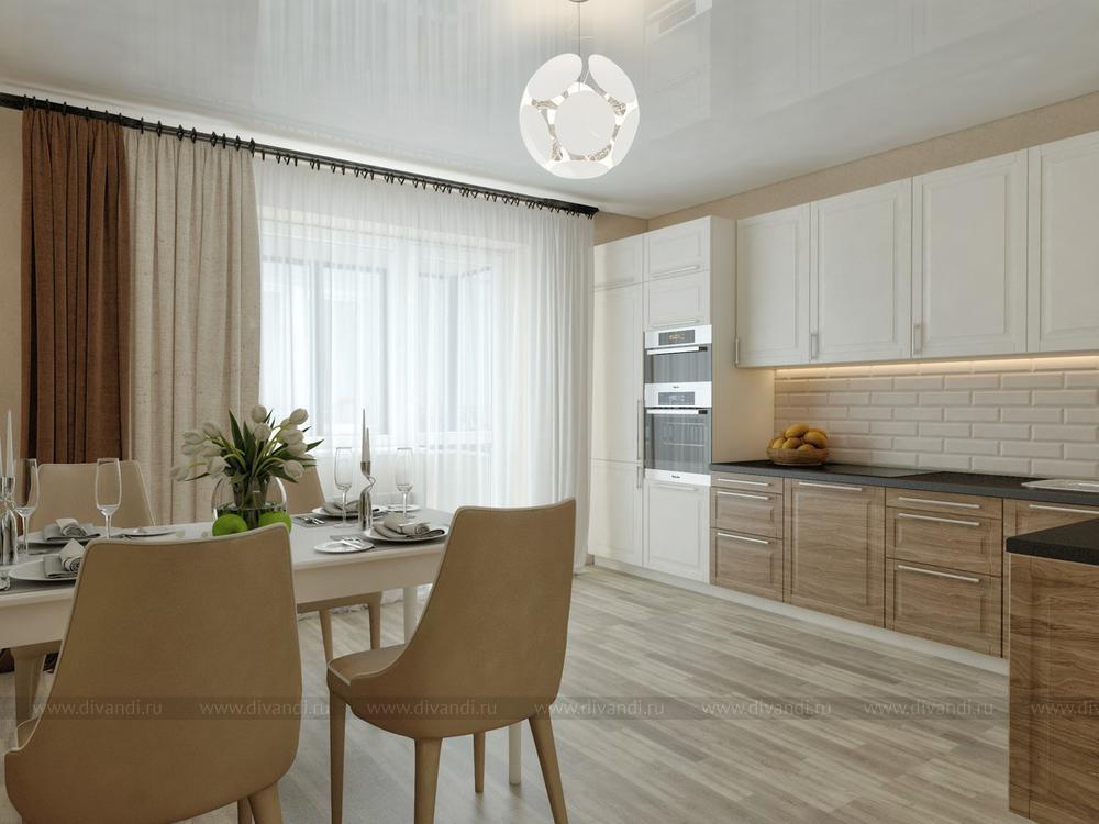Стильный интерьер кухни с легкими элементами классики выполнен в уютной и теплой цветовой гамме. Обилие воздуха и пастельного наполнения делает интерьер воздушным и гармоничным.
