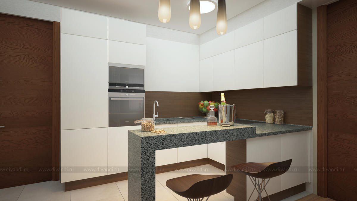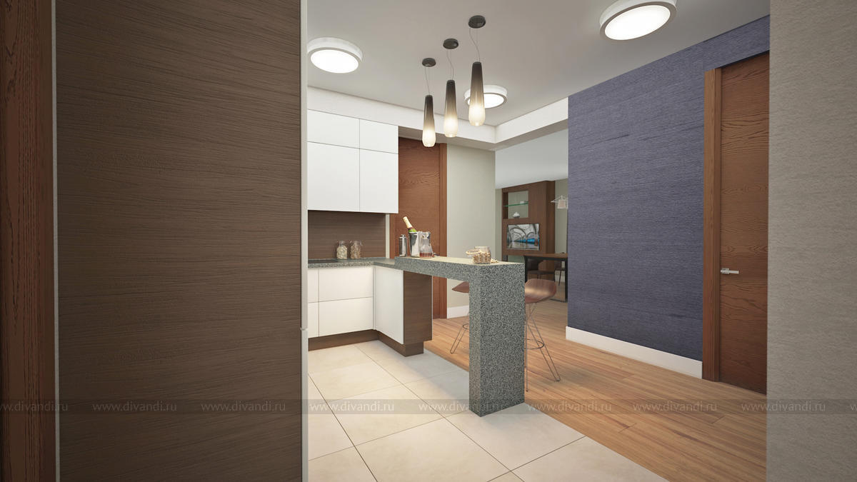 Кухня разместилась в холле 3-х комнатной квартиры, освободив таким образом одну жилую комнату.