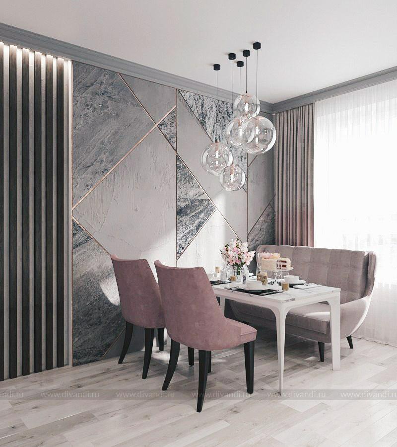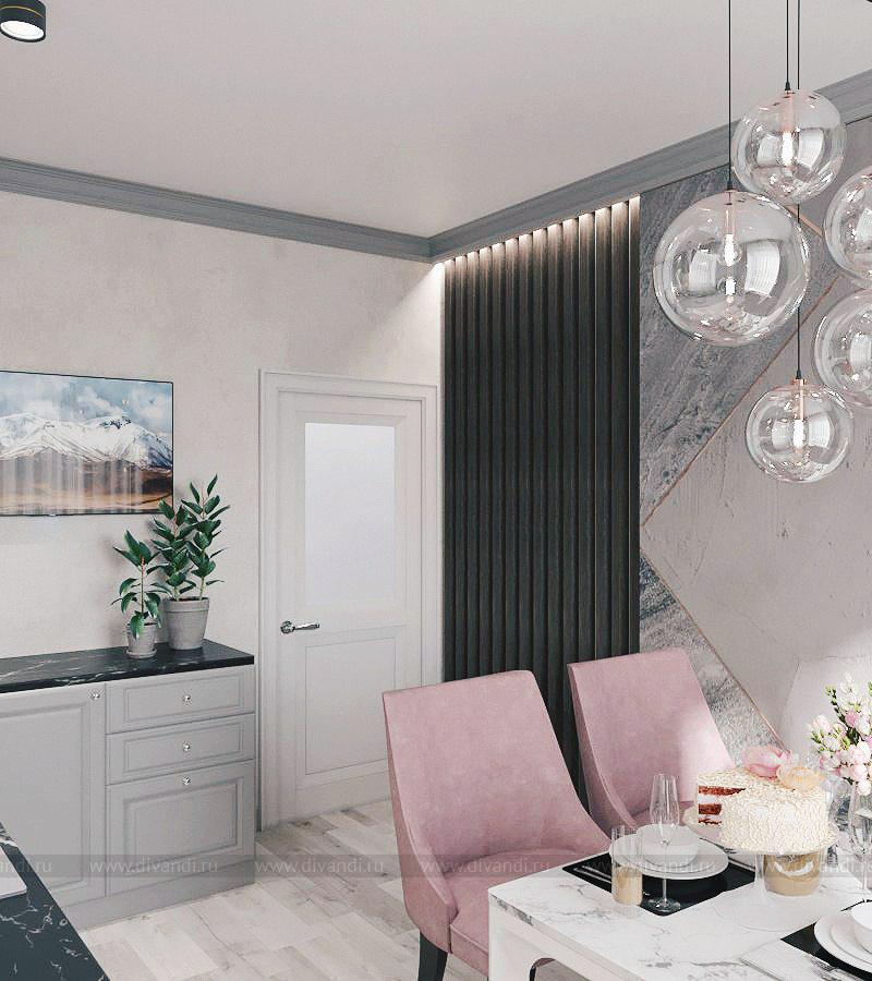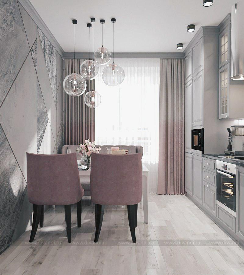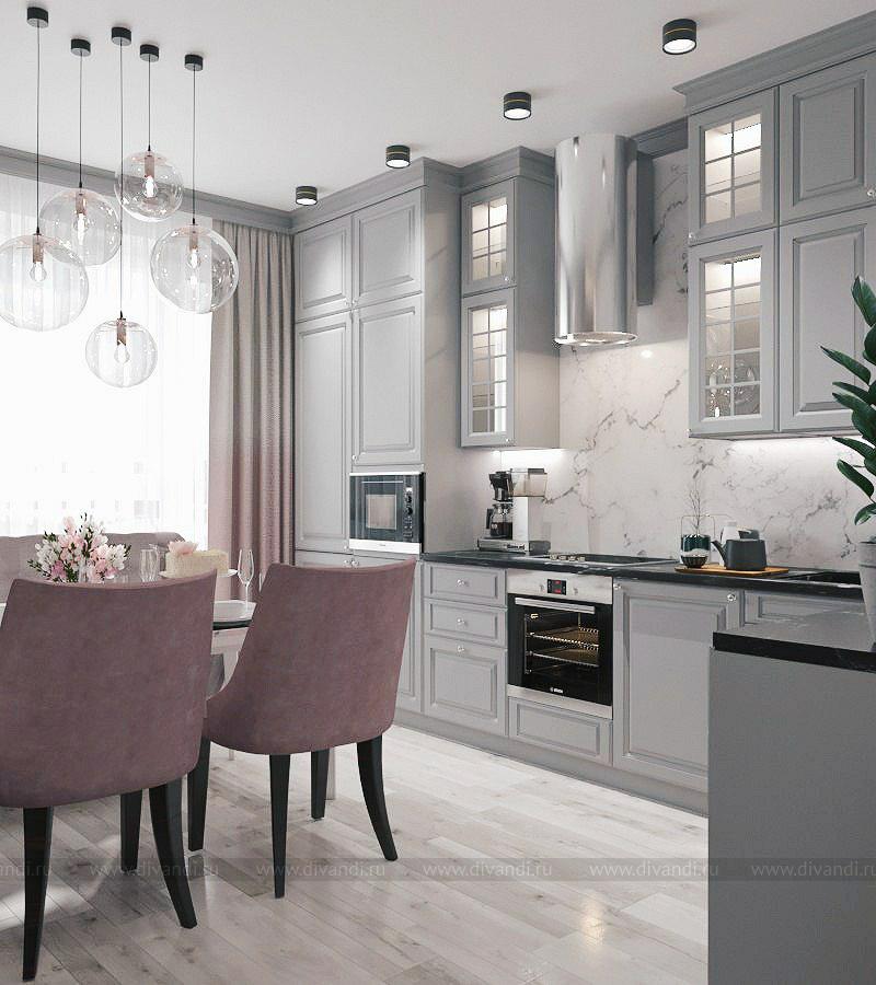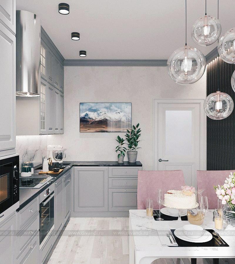 Кухня в серых тонах с розовыми акцентами в стиле современная классика
