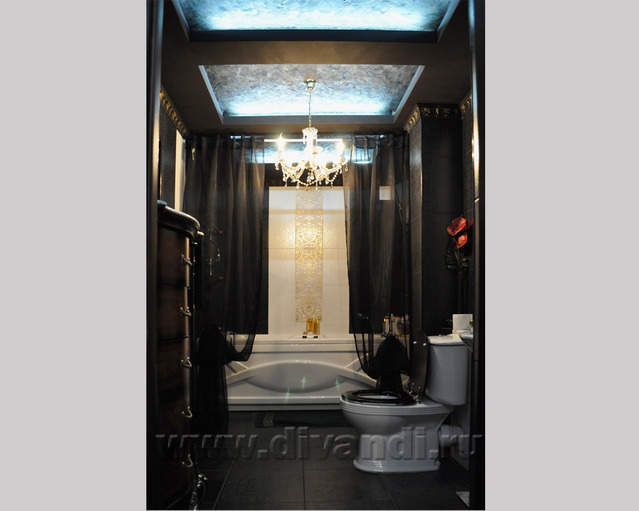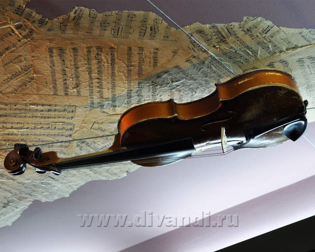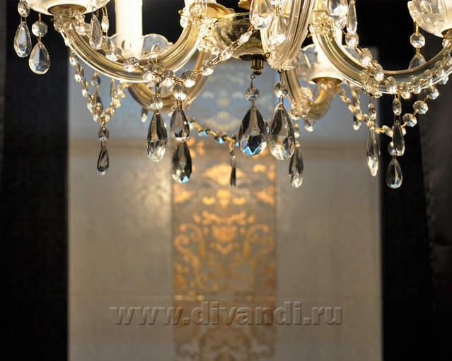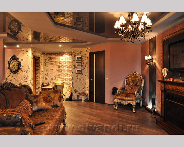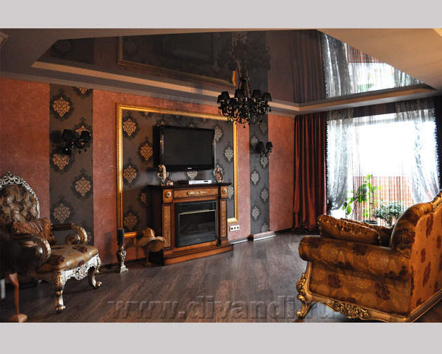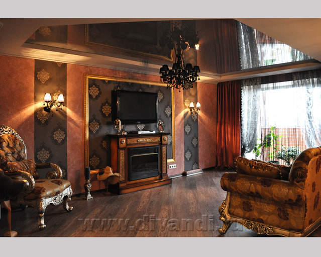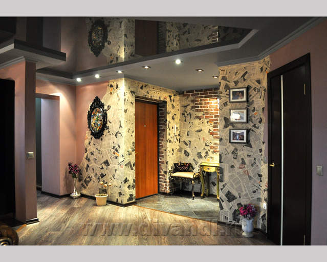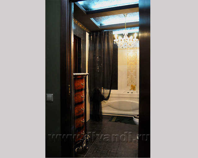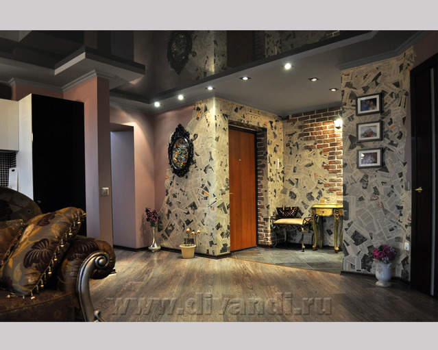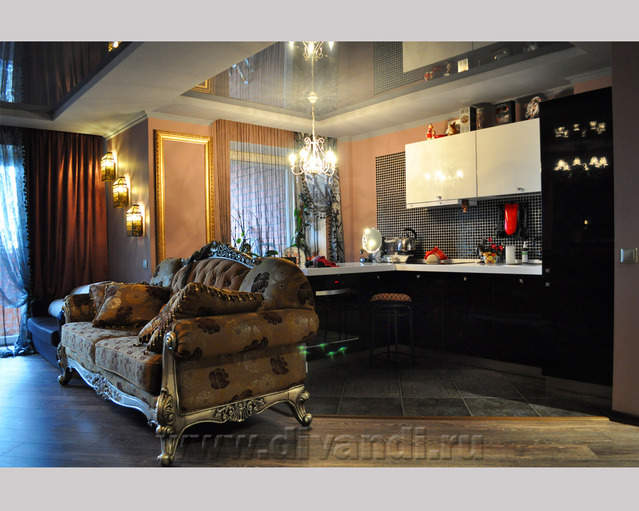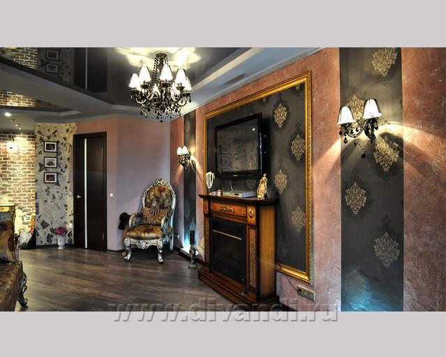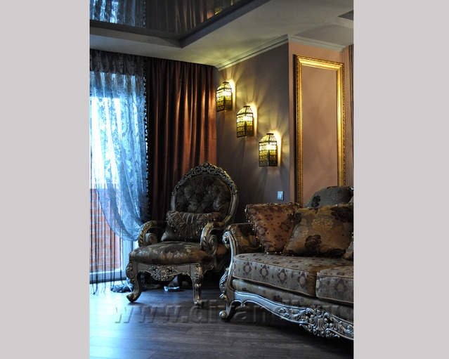 Самым ярким и эпатажным проектом можно назвать эту квартиру. Хозяйка квартиры очень любит путешествовать. Она очень четко задала стиль каждой зоне в своей квартире. Выполнив перепланировку и дизайн нескольких комнат (спальня в японском стиле и гостевой туалет) самостоятельно. Она пригласила нашего дизайнера и поделилась с ним собственными идеями для дальнейшей работы над дизайном интерьера квартиры. Прихожая должна напоминать улочку старой Европы, плавно переходившую в гламурную гостиную в стиле закрытого клуба c кальянной зоной, кухня должна олицетворять удобство и роскошь: крупные золотые багеты с ромбовидными зеркалами, черные глянцевые фасады кухни с блестящими ручками Swarovski. Безусловно, в такой квартире должно быть место для размещения фотографий – этим местом стал холл на потолке которого расположились старые антикварные скрипки на фоне нотных страниц и стена в виде огромной импровизированной рамки с багетом в которой находятся маленькие рамки с фотографиями.