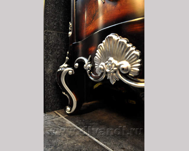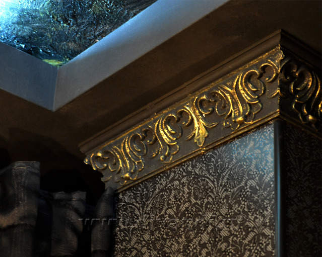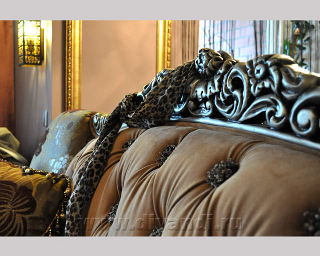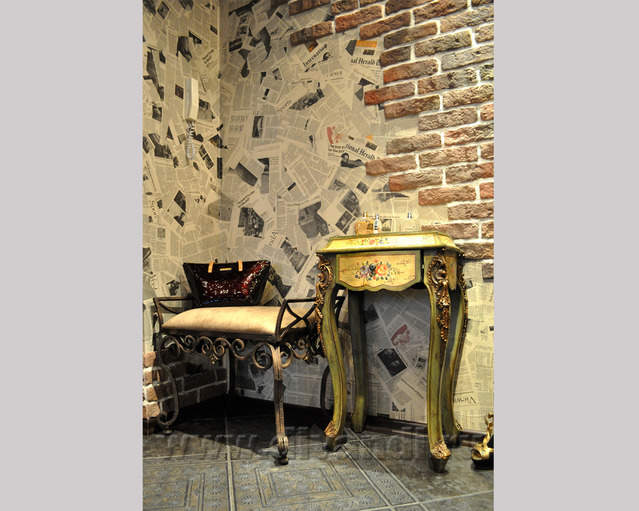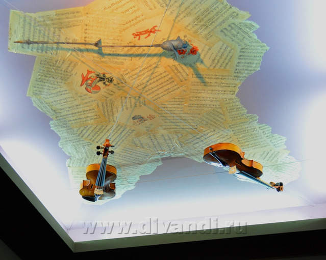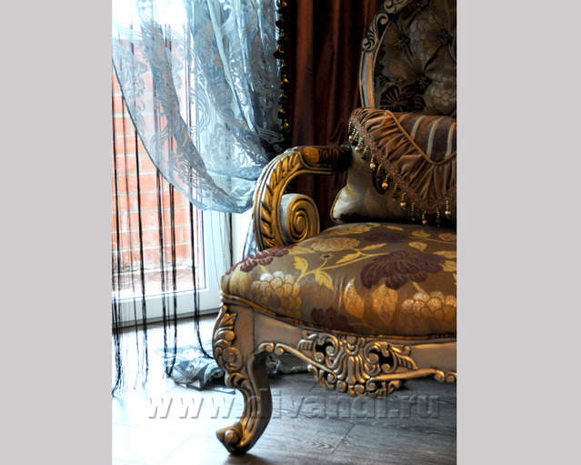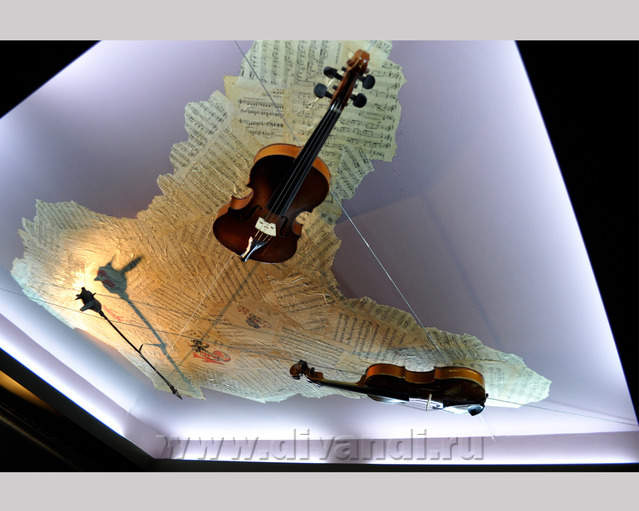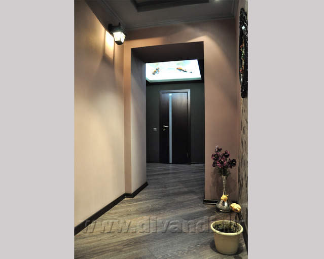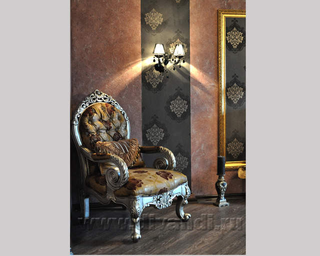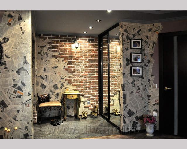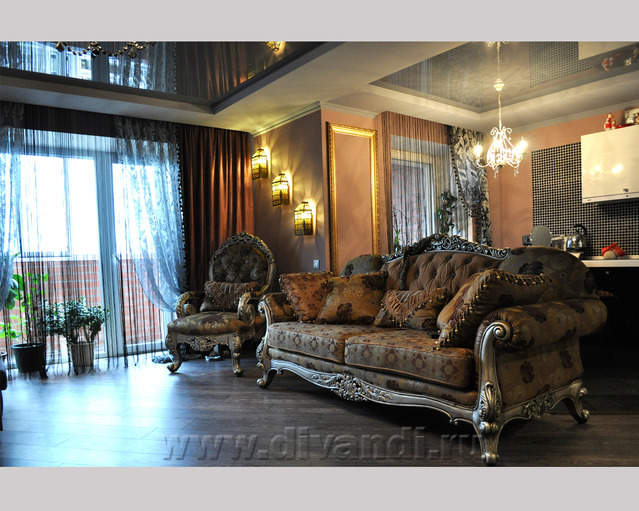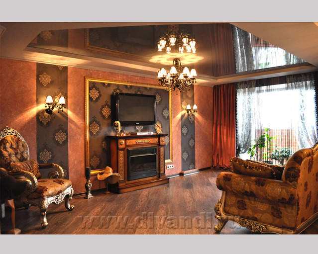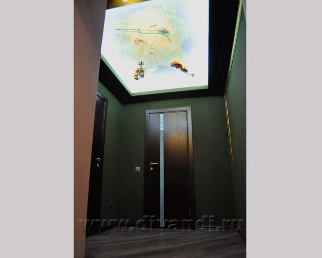 Самым ярким и эпатажным проектом можно назвать эту квартиру. Хозяйка квартиры очень любит путешествовать. Она очень четко задала стиль каждой зоне в своей квартире. Выполнив перепланировку и дизайн нескольких комнат (спальня в японском стиле и гостевой туалет) самостоятельно. Она пригласила нашего дизайнера и поделилась с ним собственными идеями для дальнейшей работы над дизайном интерьера квартиры. Прихожая должна напоминать улочку старой Европы, плавно переходившую в гламурную гостиную в стиле закрытого клуба c кальянной зоной, кухня должна олицетворять удобство и роскошь: крупные золотые багеты с ромбовидными зеркалами, черные глянцевые фасады кухни с блестящими ручками Swarovski. Безусловно, в такой квартире должно быть место для размещения фотографий – этим местом стал холл на потолке которого расположились старые антикварные скрипки на фоне нотных страниц и стена в виде огромной импровизированной рамки с багетом в которой находятся маленькие рамки с фотографиями.