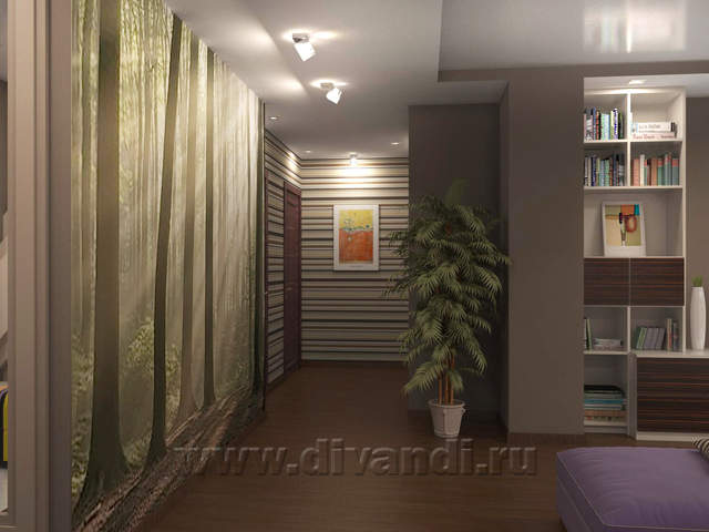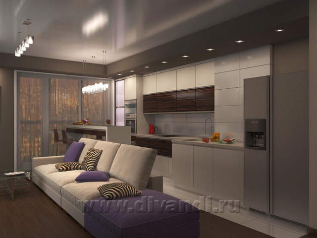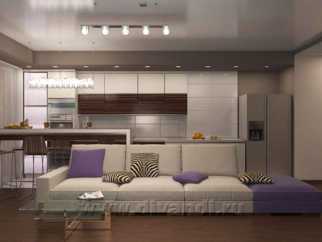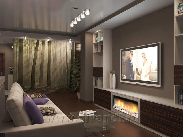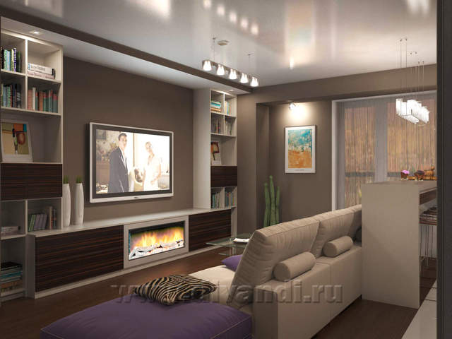 Небольшая квартира в центре города. Гостиная объединенная с кухней. Проект выполнен в современном стиле в теплых природных тонах с небольшими цветовыми акцентами.