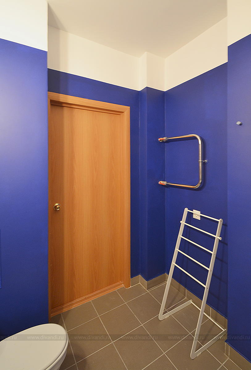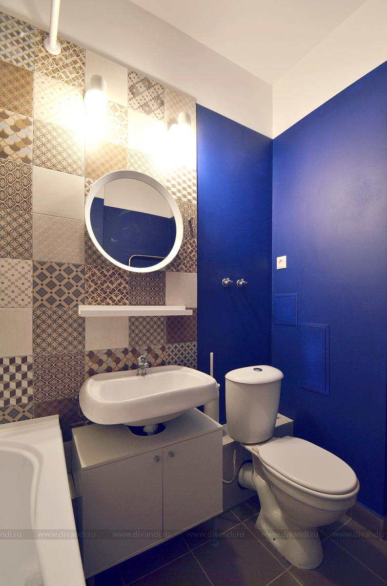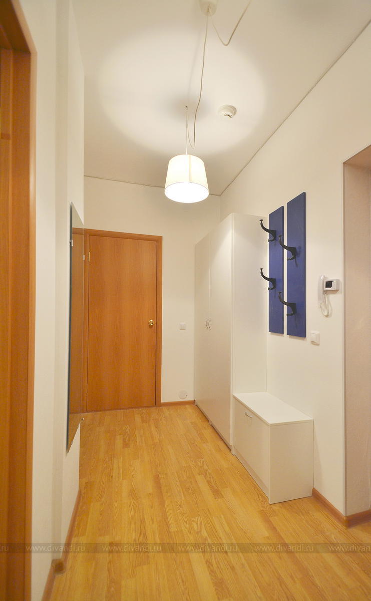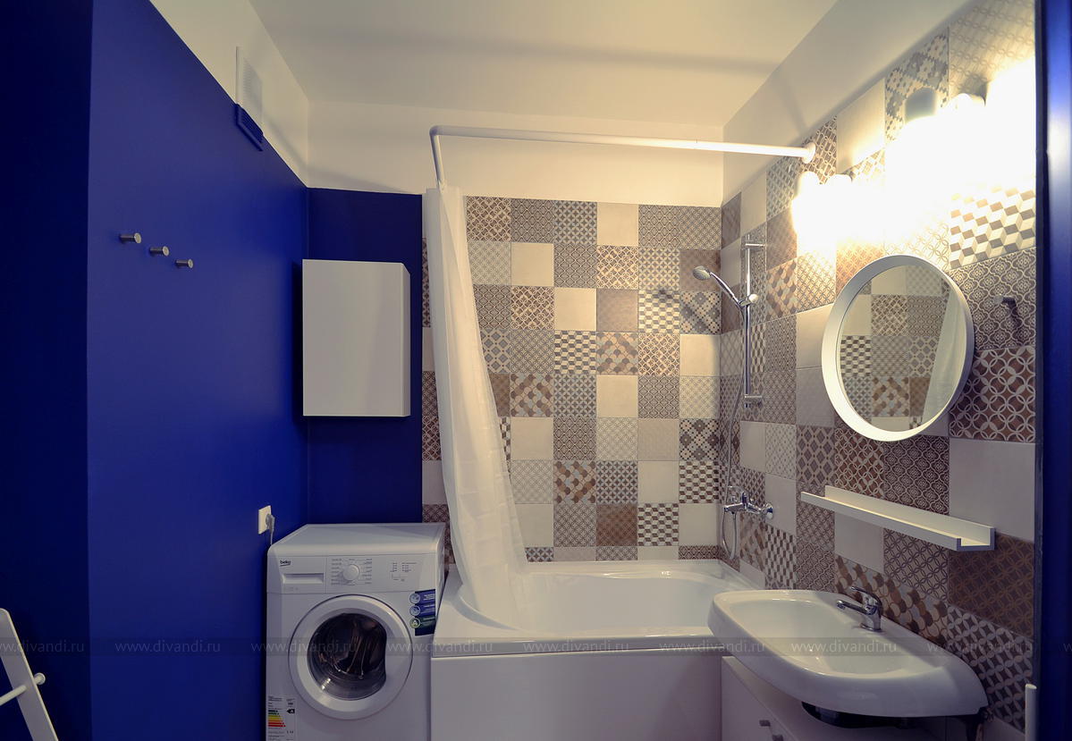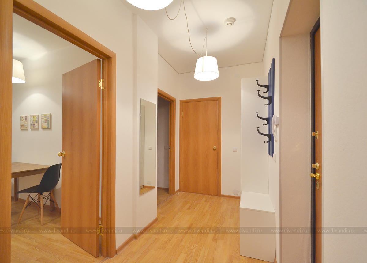 Мы работали с существующей планировкой и отделкой от застройщика, главной задачей был сделать оптимальную расстановку мебели. Так появилась полноценная кухня, отдельно гостиная с раскладным диваном и рабочей зоной, а также спальня. В ванной осталась существующая сантехника, мы оклеили мокрую зону плиткой и выкрасили яркой краской остальные зоны. В прихожей поместился шкаф для верхней одежды со скамьей-обувницей.