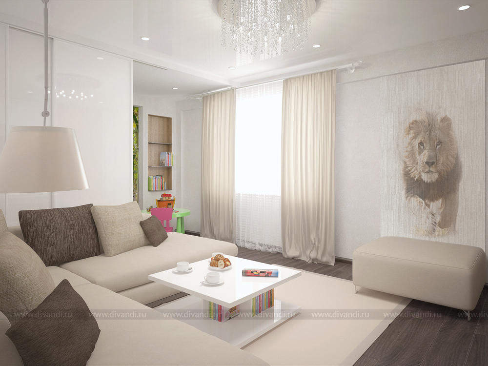 Квартира в новом доме, общей площадью 64,5 кв.м. Главное желание хозяев - будущий интерьер должен быть современный, светлый, легкий, с разнообразным освещением. Были поставлены задачи организовать удобные зоны хранения, выделить в гостиной спальную зону для младшей дочери, вписать в будущий интерьер уже существующую мебель. В процессе работы над дизайн-проектом, ориентируясь на характерны и энергетику хозяев, появились акценты, такие как лев в гостиной, а на кухне панорамный вид на Колизей.