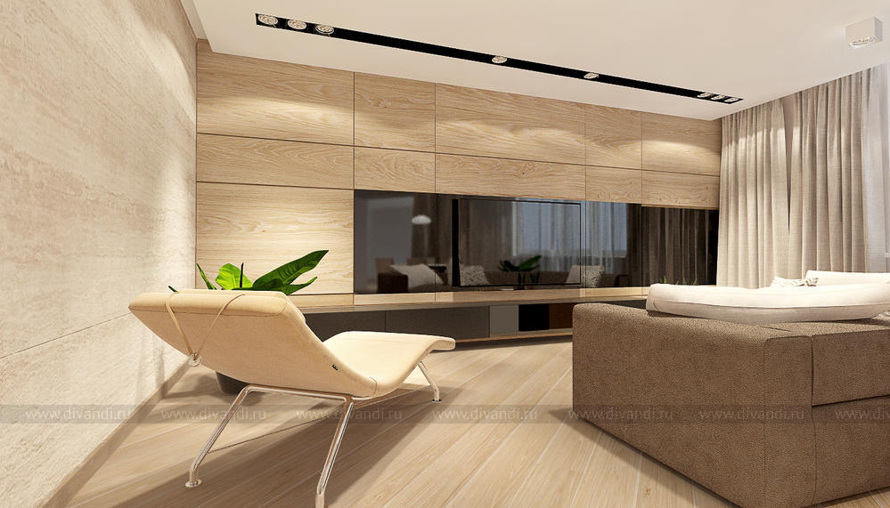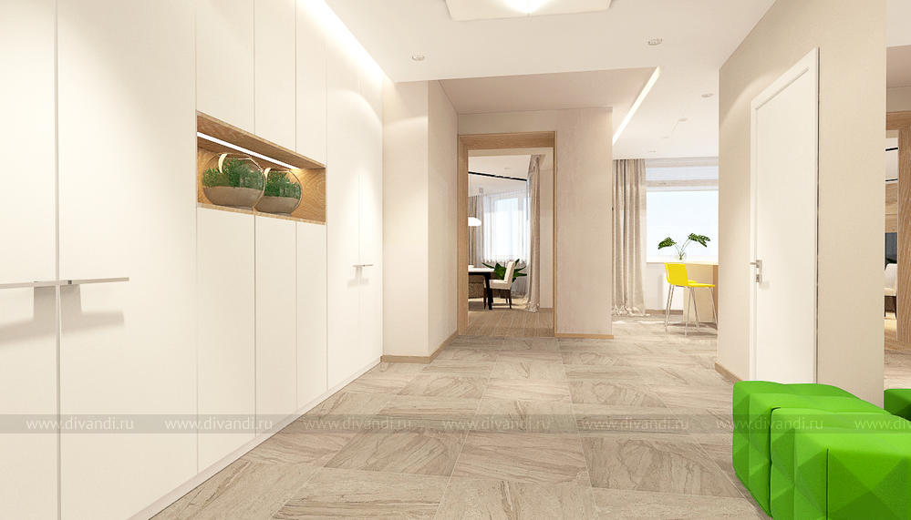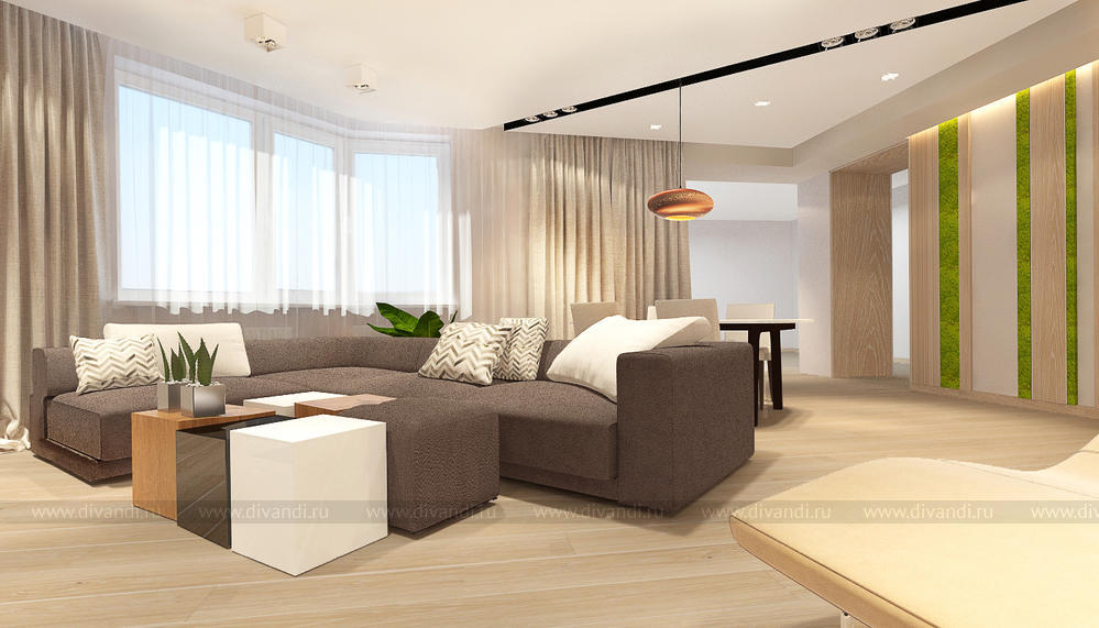 Проект трехкомнатной квартиры в стиле минимализм с элементами эко-дизайна мы разрабатывали для молодой гостеприимной семьи. В интерьере использовано много натуральных элементов: деревянные панели и паркет, песочные цвета, акценты в виде зеленого, желтого и травяного цветов, панели из мха. Дизайнеры хорошо поработали над планировкой. Несмотря на то, что в квартире нет помещений правильной прямоугольной формы, и между гостиной и кухней стоит большой опорный столб, мы грамотно расположили мебель и выделили в гостиной столовую зону. Также после перепланировки появились две гардеробные: одна в спальне, а другая вместо нефункционального коридора.
