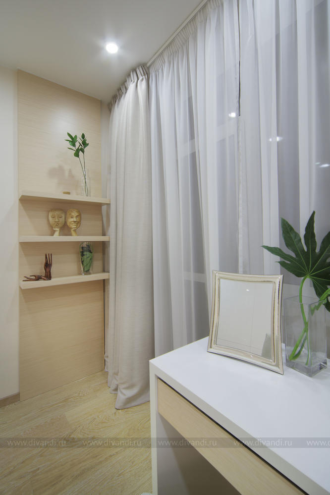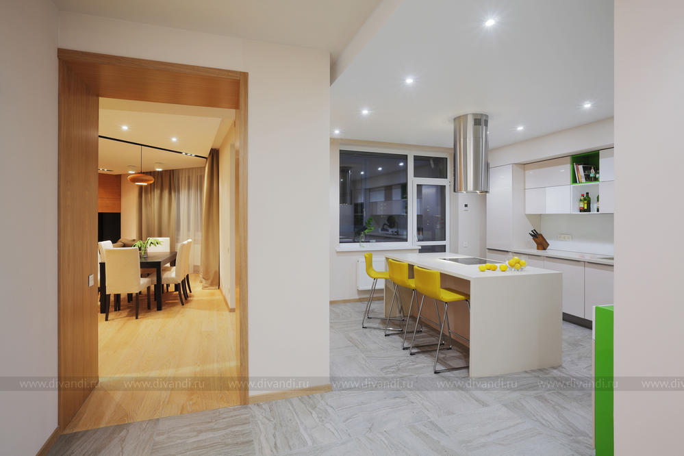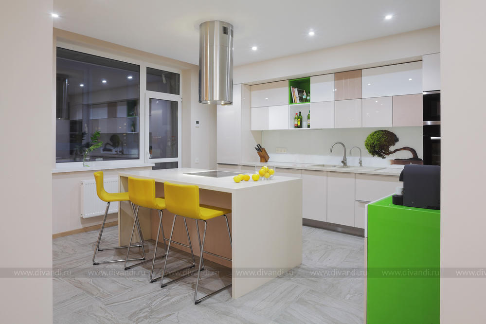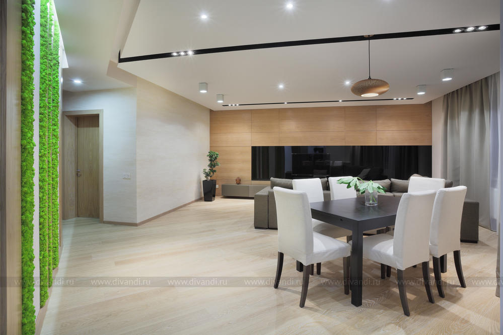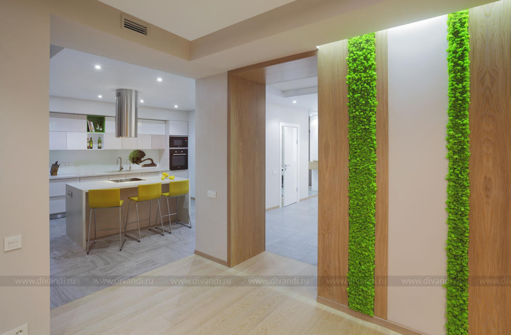 Просторная квартира в стиле минимализм с элементами эко-стиля для молодой семьи. Квартира получилась просторной, светлой. В интерьере использованы природные элементы (трава, галька, стабилизированный мох, брашированный паркет, шпонированные панели), натуральные цвета (песочный, зеленый, желтый) и мягкое освещение. Интересно обыграна сложная геометрия пространства. Изначально в квартире была только одна комната правильной формы. Нестандартное пространство с несущей колонной дизайнеры превратили в "фишку".