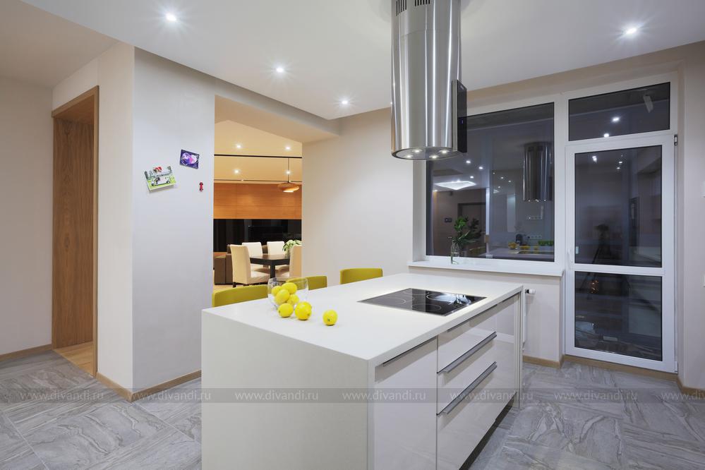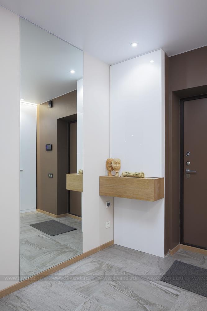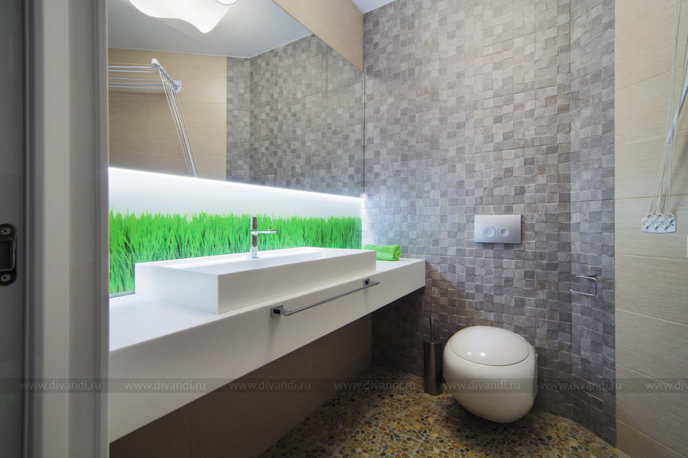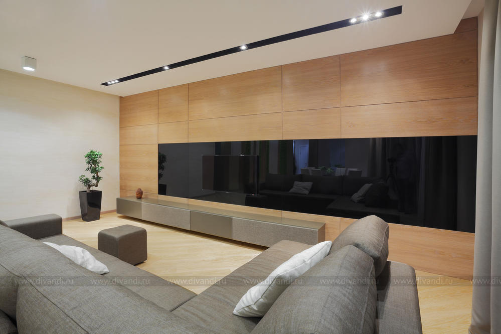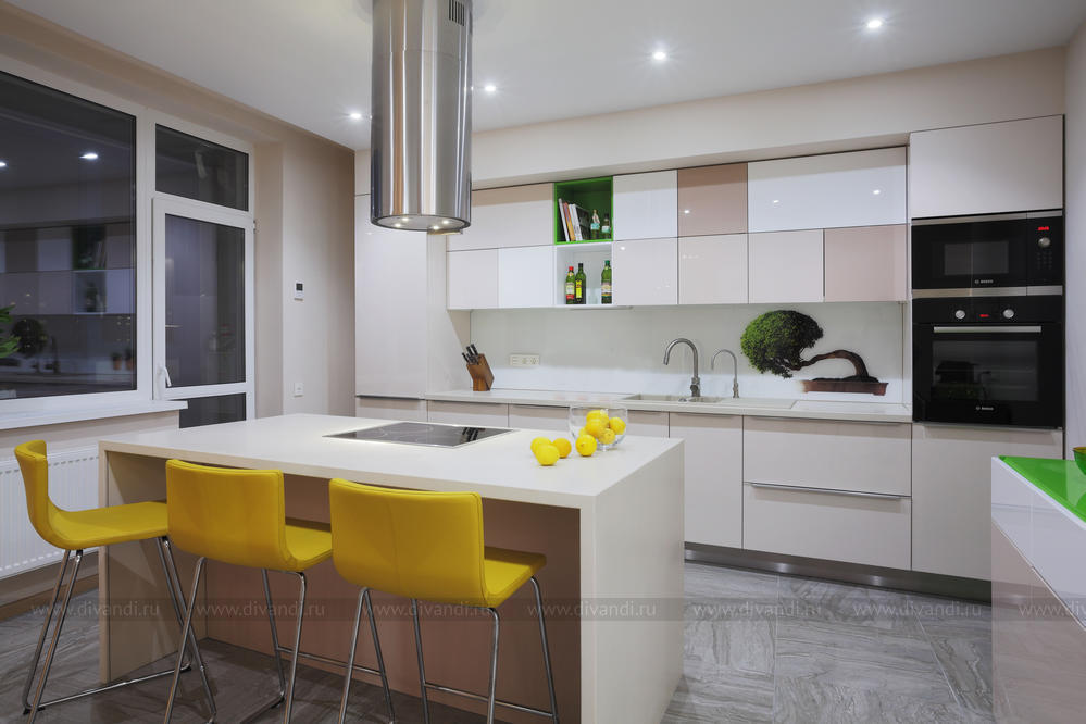 Просторная квартира в стиле минимализм с элементами эко-стиля для молодой семьи. Квартира получилась просторной, светлой. В интерьере использованы природные элементы (трава, галька, стабилизированный мох, брашированный паркет, шпонированные панели), натуральные цвета (песочный, зеленый, желтый) и мягкое освещение. Интересно обыграна сложная геометрия пространства. Изначально в квартире была только одна комната правильной формы. Нестандартное пространство с несущей колонной дизайнеры превратили в "фишку".