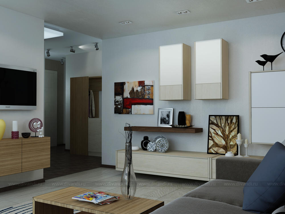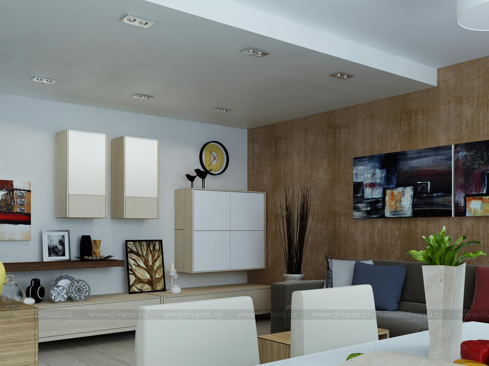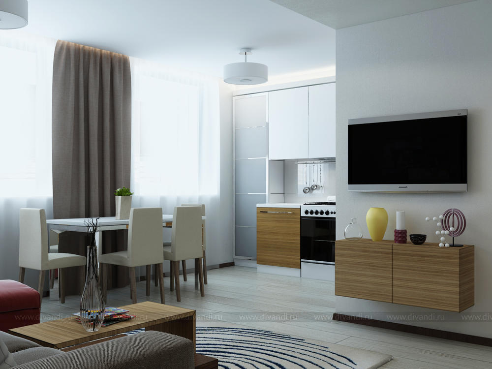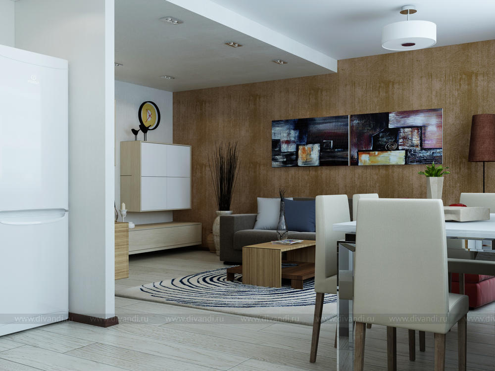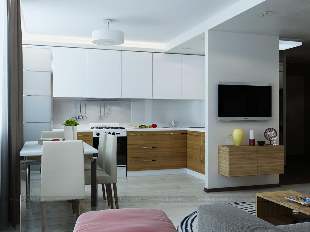 Квартира старой постройки выполнена в современном стиле. За счет перепланировки и соединения кухни и гостиной получилось открытое и свободное пространство, наполненное воздухом. А не изолированное, как было изначально. По сути, за счет сноса части стены, разделяющей кухню и гостиную удалось расширить пространство. Появилось три зоны: кухонная, обеденная и гостевая. В зашитой нише, где раньше была дверь в кухню, сделали функциональную встроенную мебель!