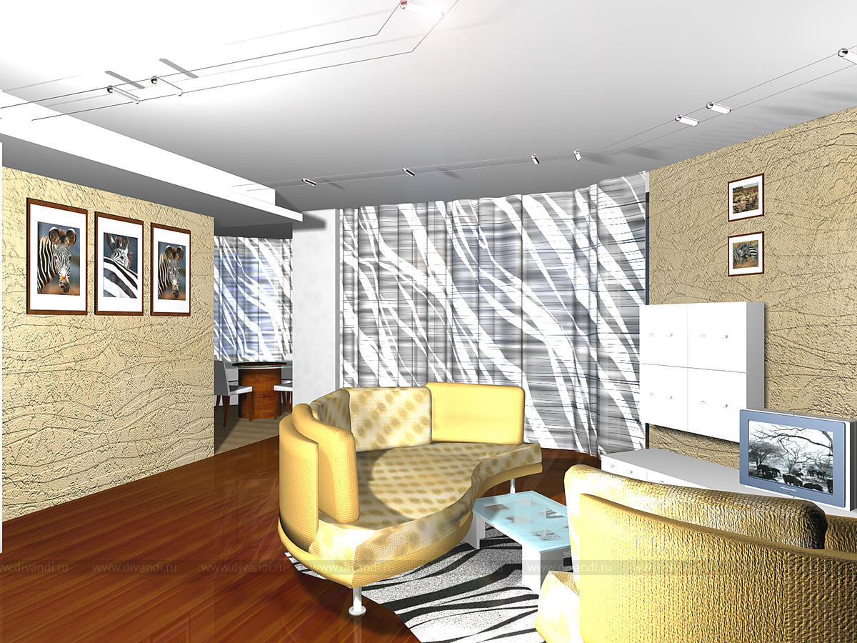 Квартира для молодой семьи с ребенком в ЖК "АКВАМАРИН". По желанию заказчиков внести в интерьер квартиры экзотические африканские нотки. Это удалось с помощью теплой цветовой гаммы штукатурки, натуральных тростниковых обоев, контрастной графики текстиля. Плетеная тростниковая мебель и включения графики в фасадах кухни дополняют образ.