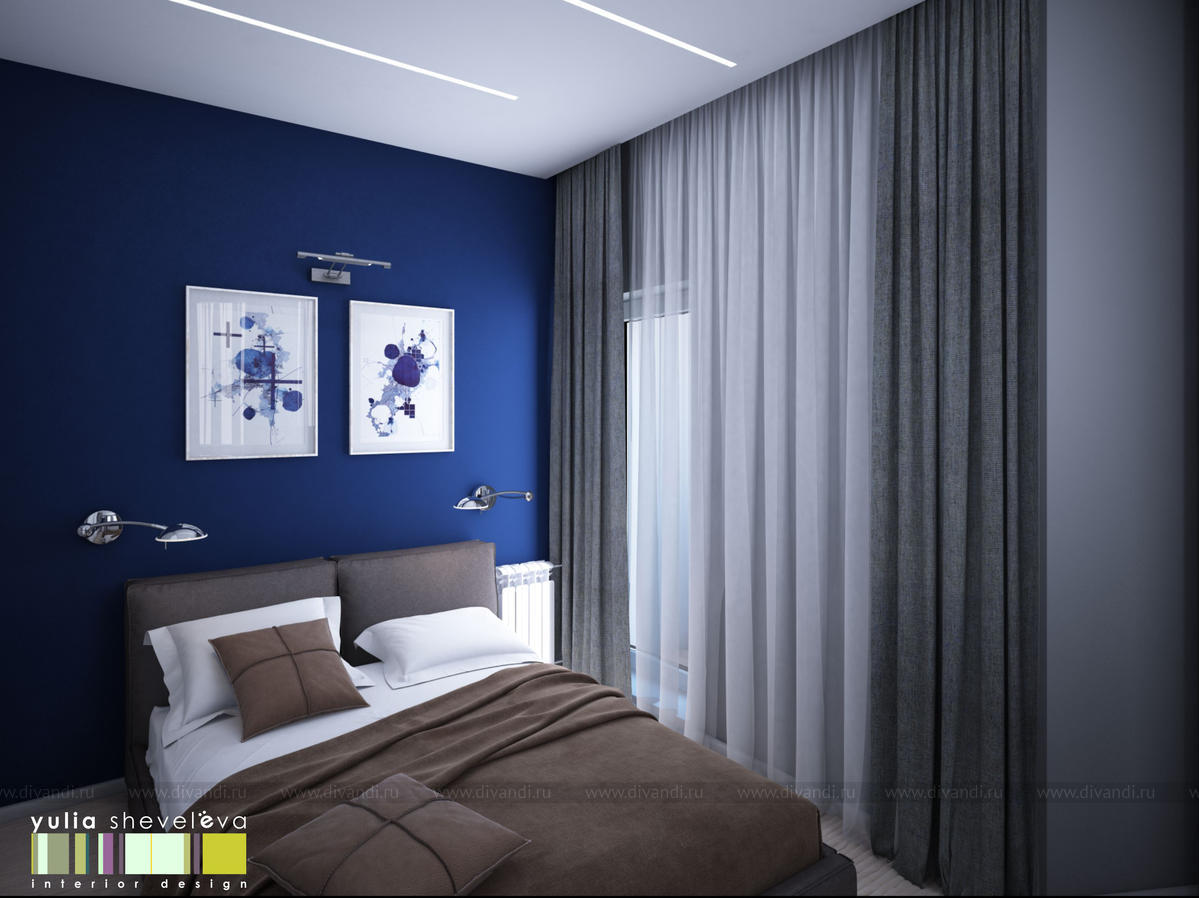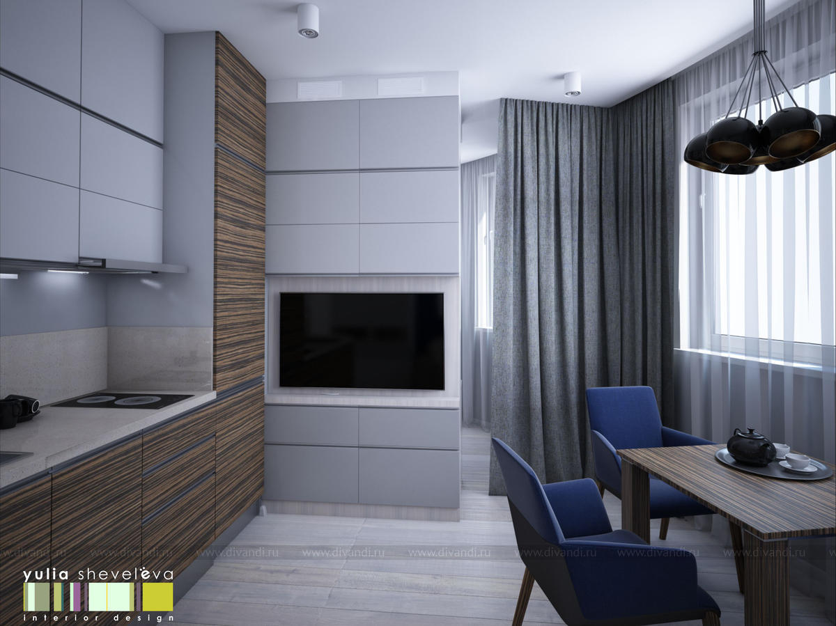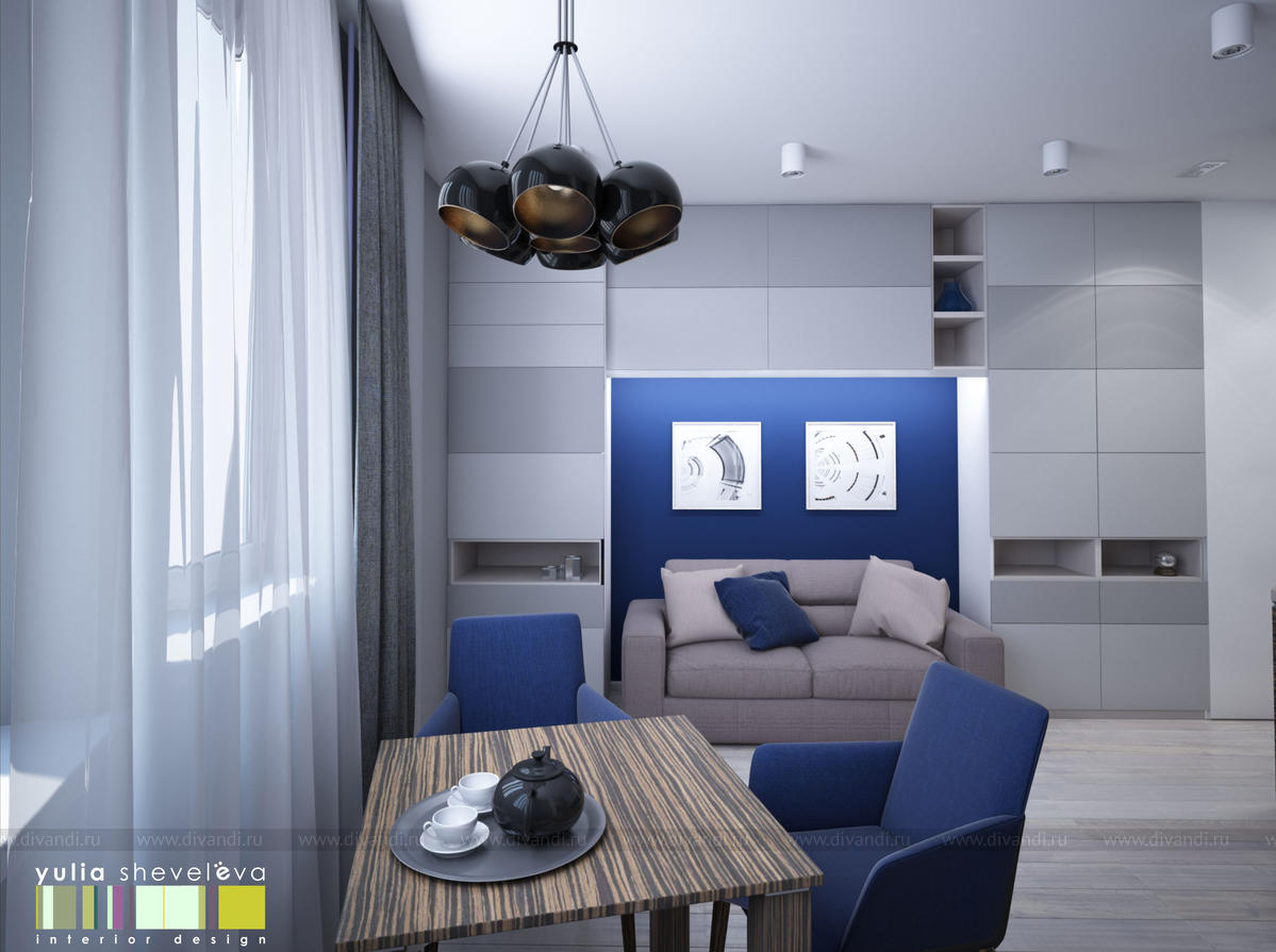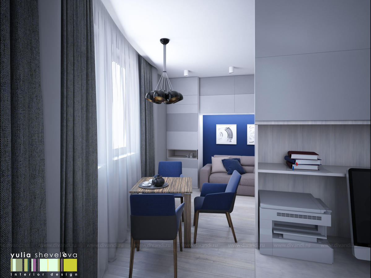 Эта квартира очень небольшой площади, всего 40 м кв. В этом компактном пространстве необходимо было создать очень функциональный интерьер для одного человека. Несмотря на маленькие габариты квартиры, удалось вместить зоны хранения, кухню и столовую, спальню и кабинет. Для интерьера выбрана сдержанная строгая гамма - синий, белый и серебристый.
