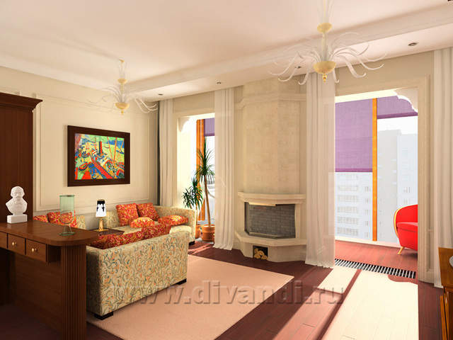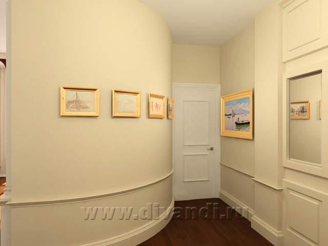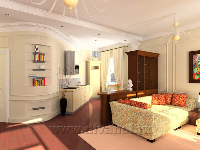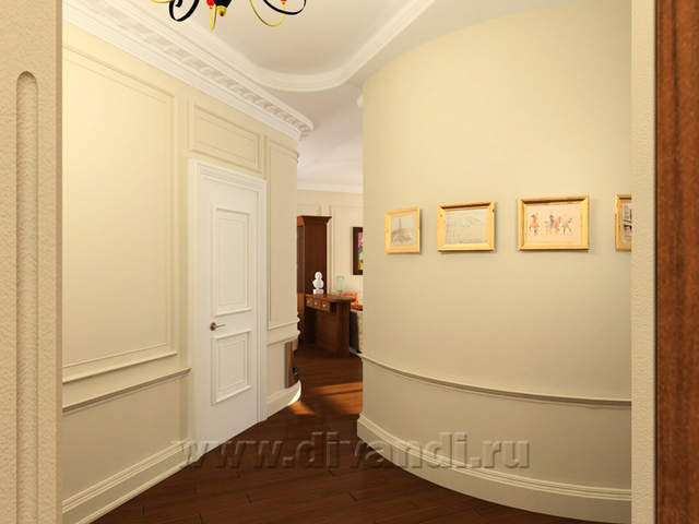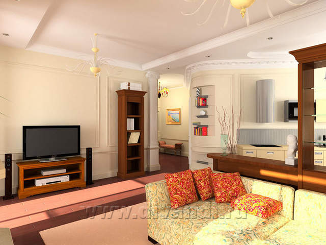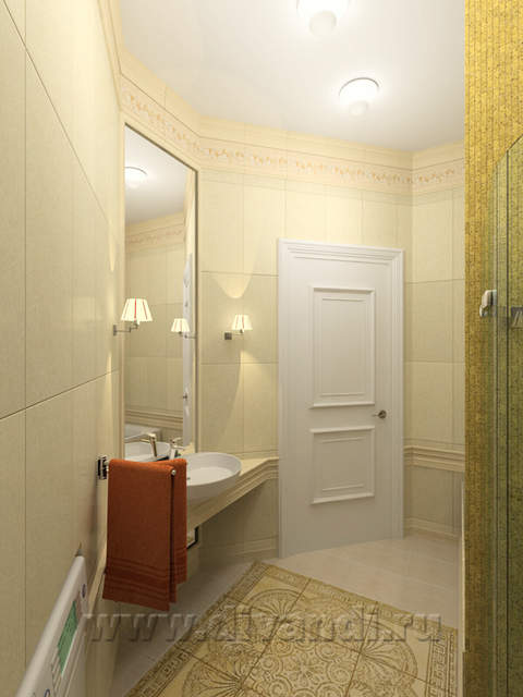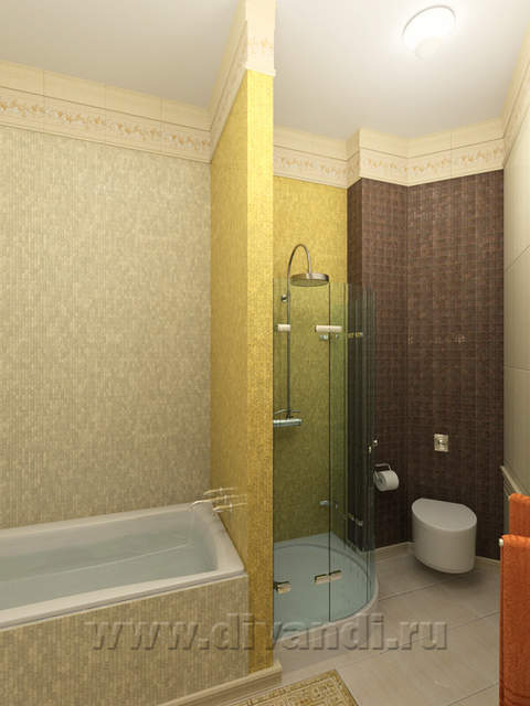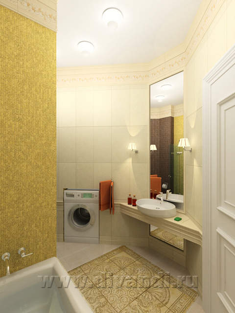 Интерьер данной квартиры яркий, но в тоже время ненавязчивый и комфортный благодаря использованию классических элементов. Благодаря перепланировке квартиры комнаты приобрели необычную форму, что подчеркивается дизайном полотка, декором и мебелью. Ванная выполнена в сдержанно-классическом стиле и разделена на несколько зон, каждая из которых выделена различными отделочными материалами и цветовыми контрастами. Все эти зоны объединяют фигурные декоративные профили у потолка. Настенные светильники и шкафчики подчеркивают классический стиль. Встроенное зеркало над раковиной зрительно придает ванной комнате больший объем. В небольшой ванной комнате с удобным расположением поместились ванна и душевая кабина, разделенные стеной, таким образом, образовались две зоны, дополняющие друг друга. Стиральная машина встроена в техническое пространство за пределами стены, что позволило сэкономить достаточно много места.