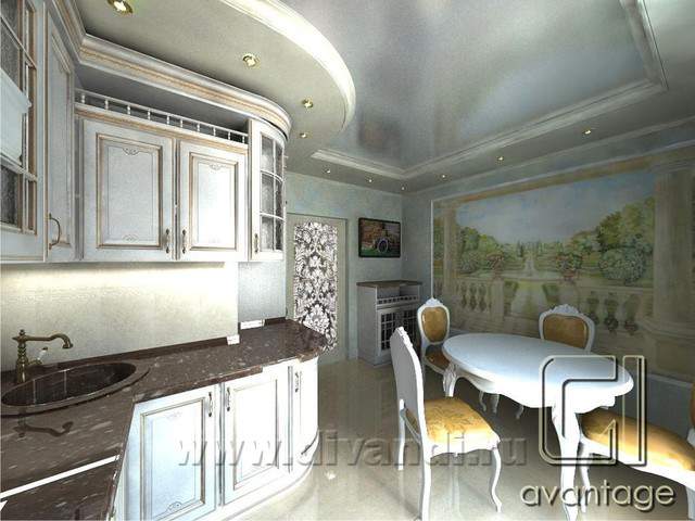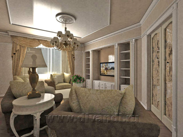 Планировка квартиры изначально была довольно удачной, поэтому серьёзную реконструкцию делать не пришлось, - только пересено несколько проёмов и изменена конфигурация одной перегородки и входной зоны. Цветовое и стилистическое решение для всей квартиры едино – это теплые, пастельные, свелные оттенки, мебель и двери из светлого дерева, лепной декор, фрески.