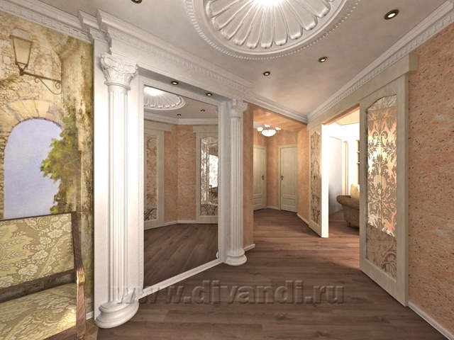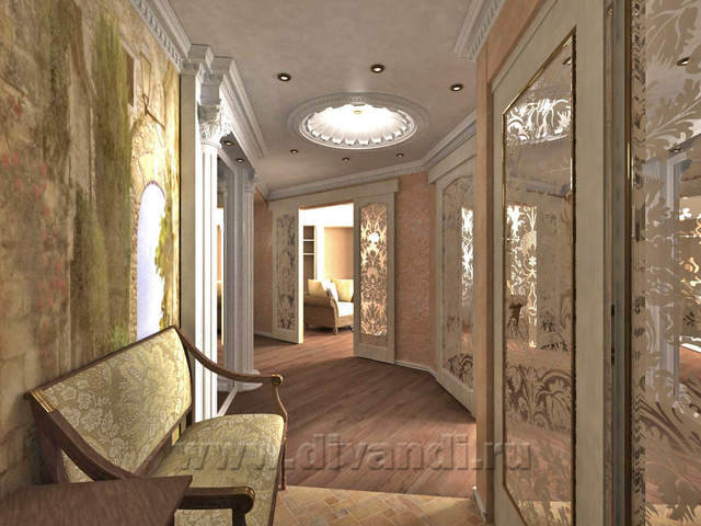 Уникальным решением этого интерьера является портал с колоннами, обрамляющий зеркало и купол. Вся эта композиция визуально увеличивает пространство холла, придаёт торжественность и легкость. За раздвижными дверями у входа расположена просторная гардеробная. Все раздвижные двери сделаны по эскизам дизайнера под заказ из массива дуба с пескоструйной обработкой по зеркалу.